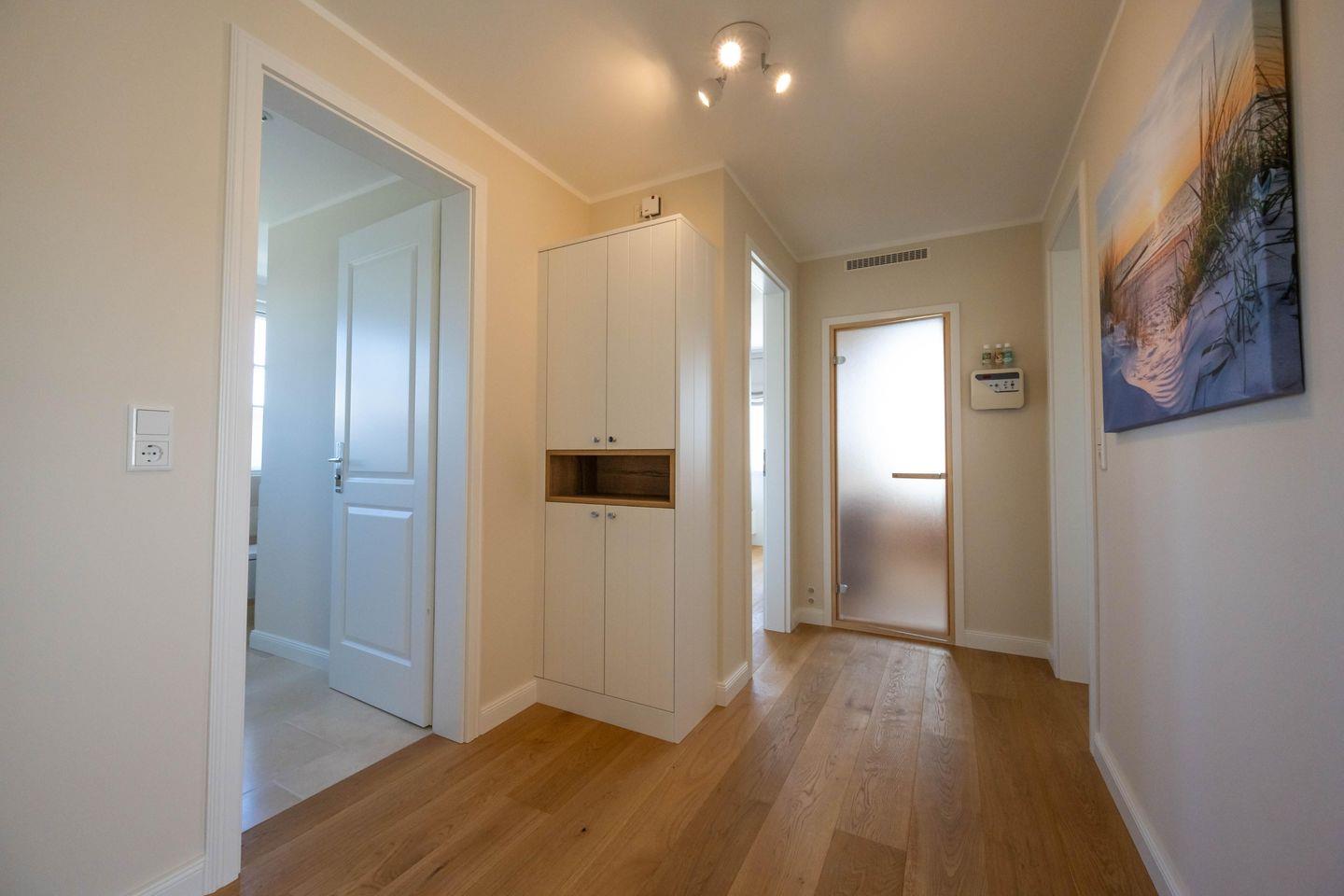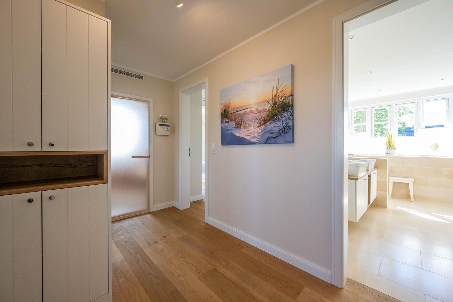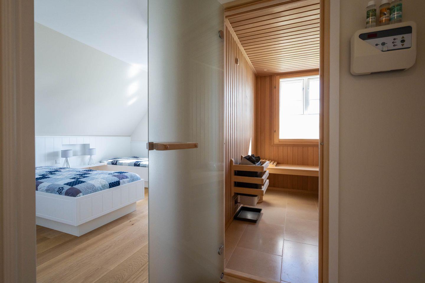 Im Obergeschoss sind zwei Schlafzimmer - eines mit einem Doppelbett und eines mit zwei Einzelbetten und jeweils mit einem Smart-TV ausgestattet -, das Vollbad mit Dusche und Badewanne, sowie ein weiteres Duschbad und die hauseigene Sauna.