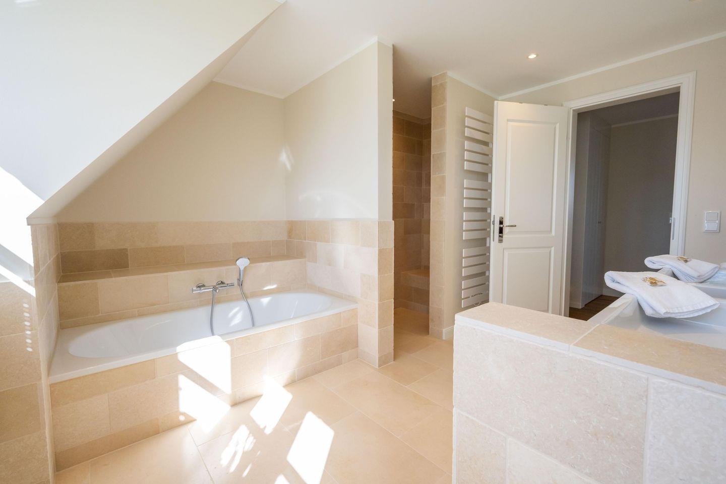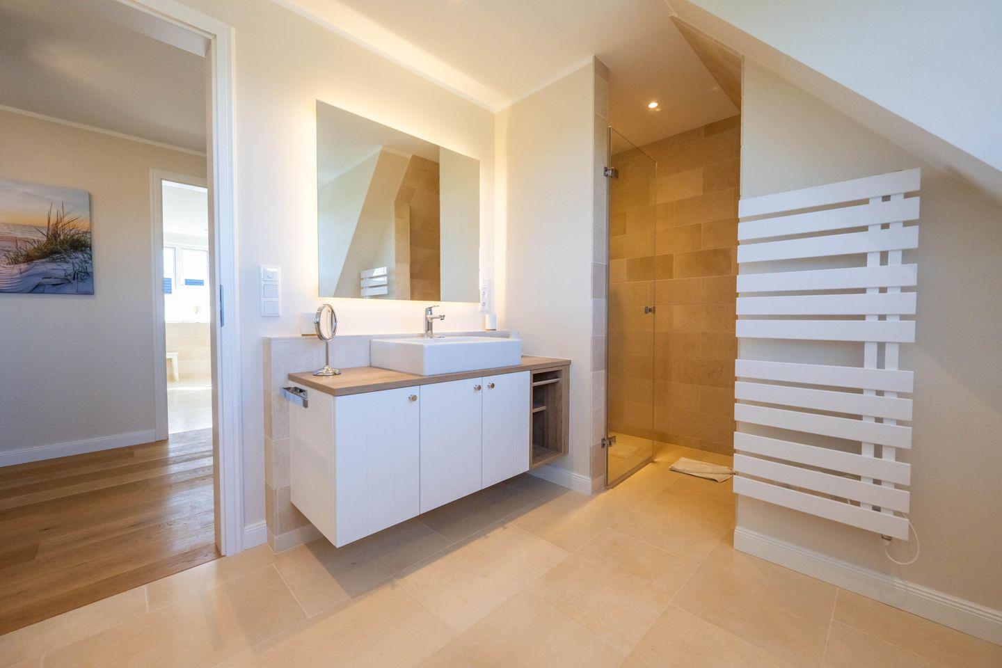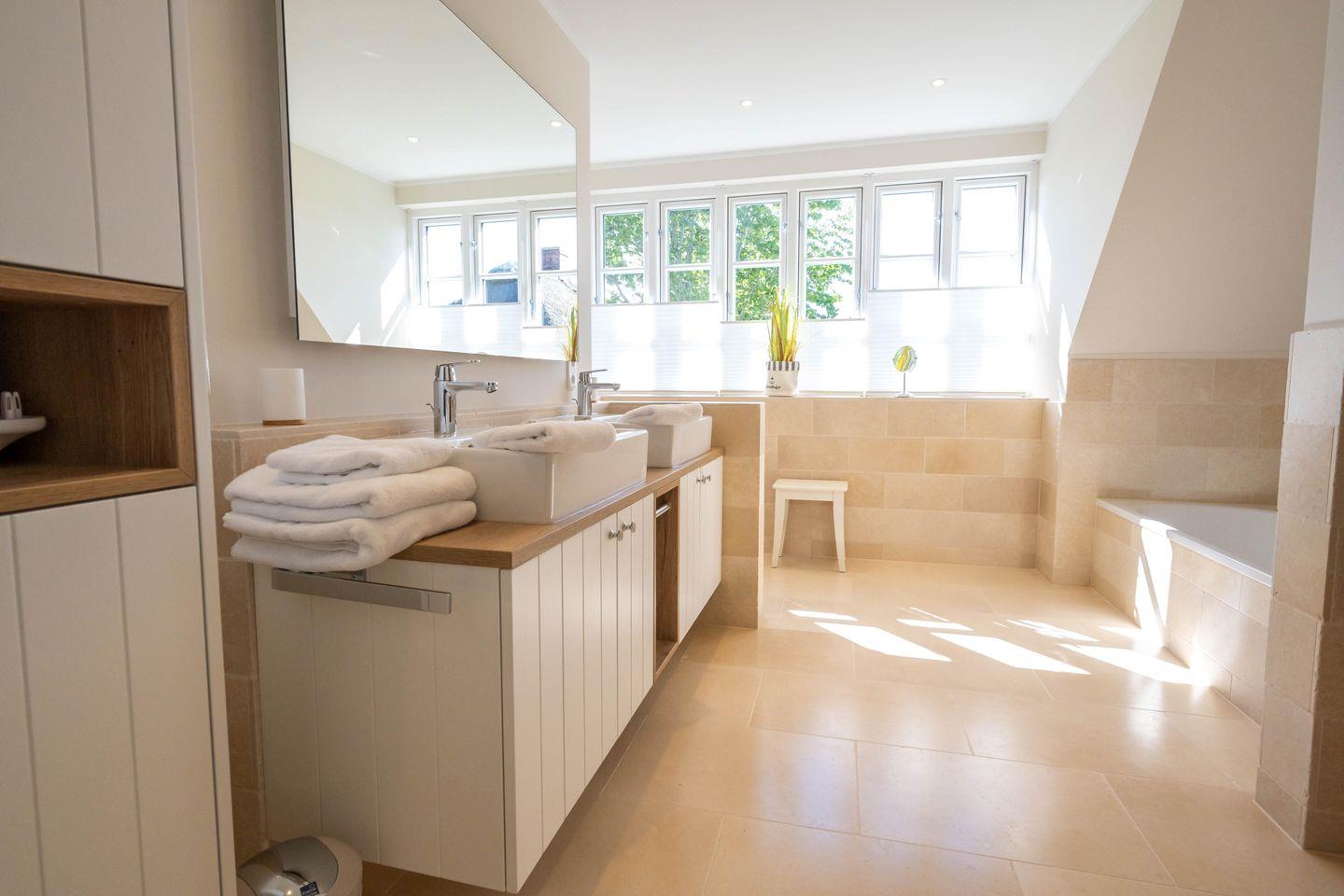 Im Obergeschoss sind zwei Schlafzimmer - eines mit einem Doppelbett und eines mit zwei Einzelbetten und jeweils mit einem Smart-TV ausgestattet -, das Vollbad mit Dusche und Badewanne, sowie ein weiteres Duschbad und die hauseigene Sauna.