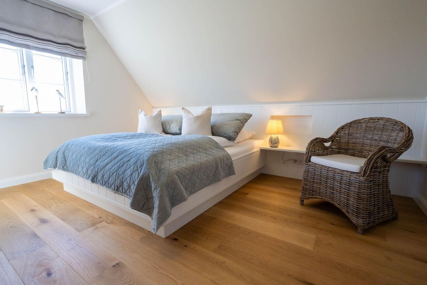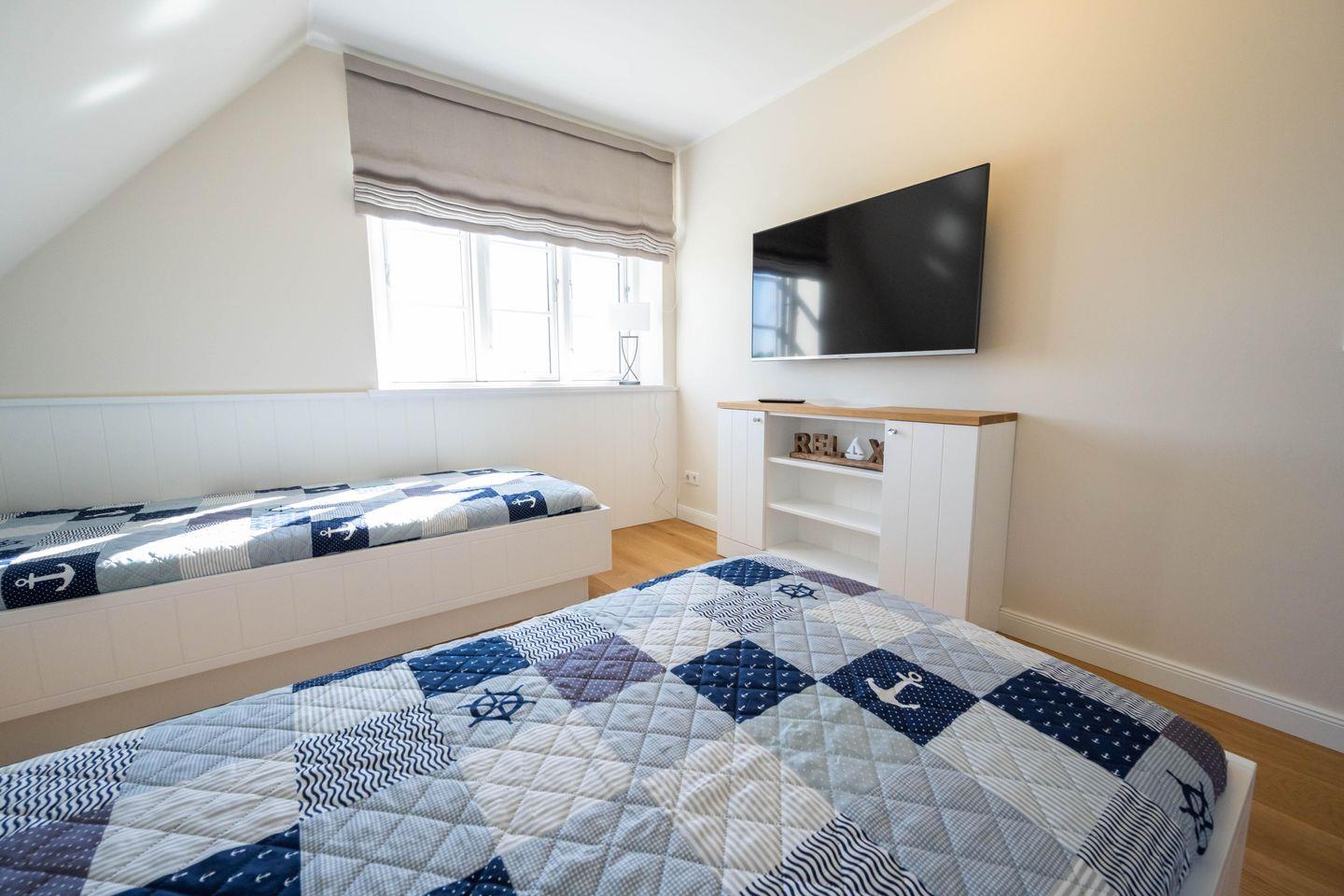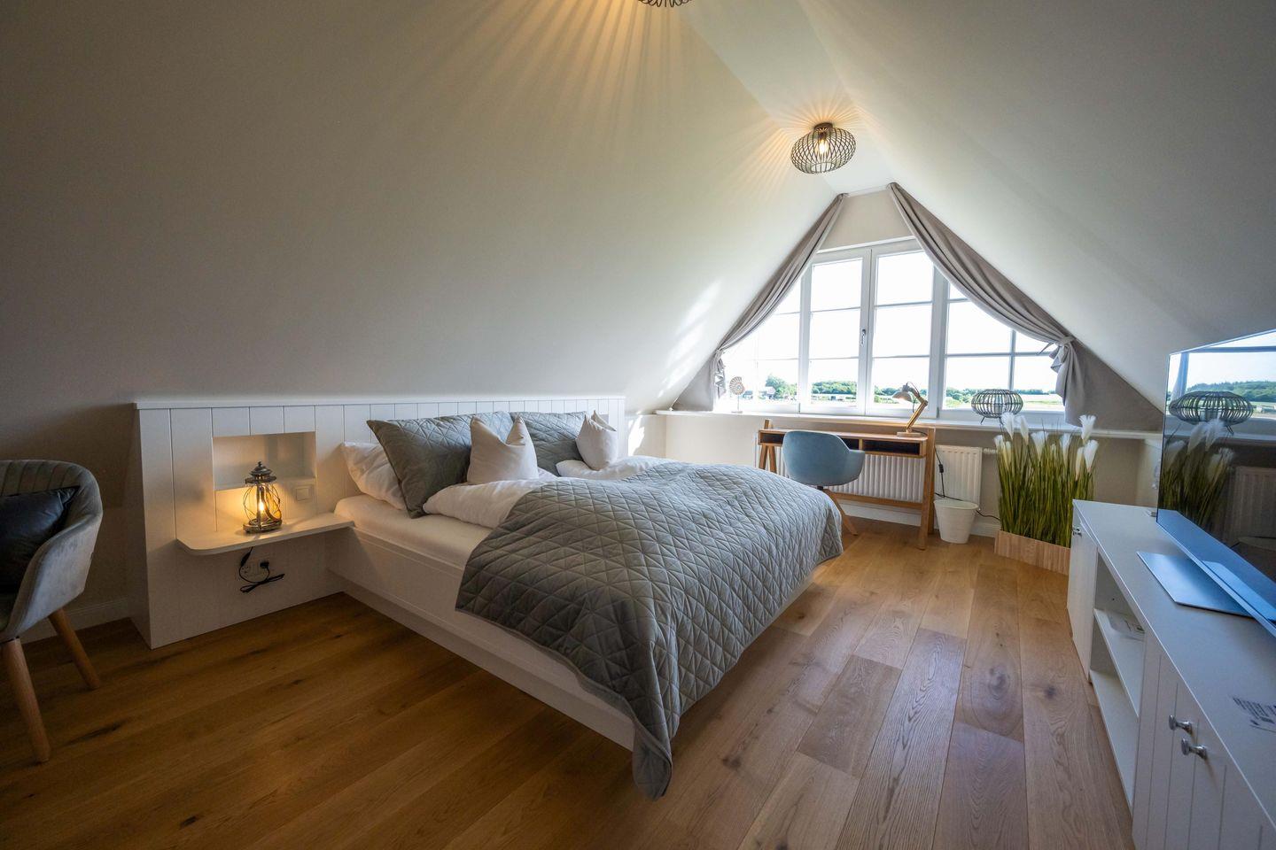Im Dachgeschoss befindet sich das dritte Schlafzimmer - ebenfalls mit einem Doppelbett und einem Smart-TV ausgestattet und mit eindrucksvoller Deckenhöhe! Von hier aus haben Sie einen traumhaften Ausblick auf die Nordsee und die umliegende Landschaft.