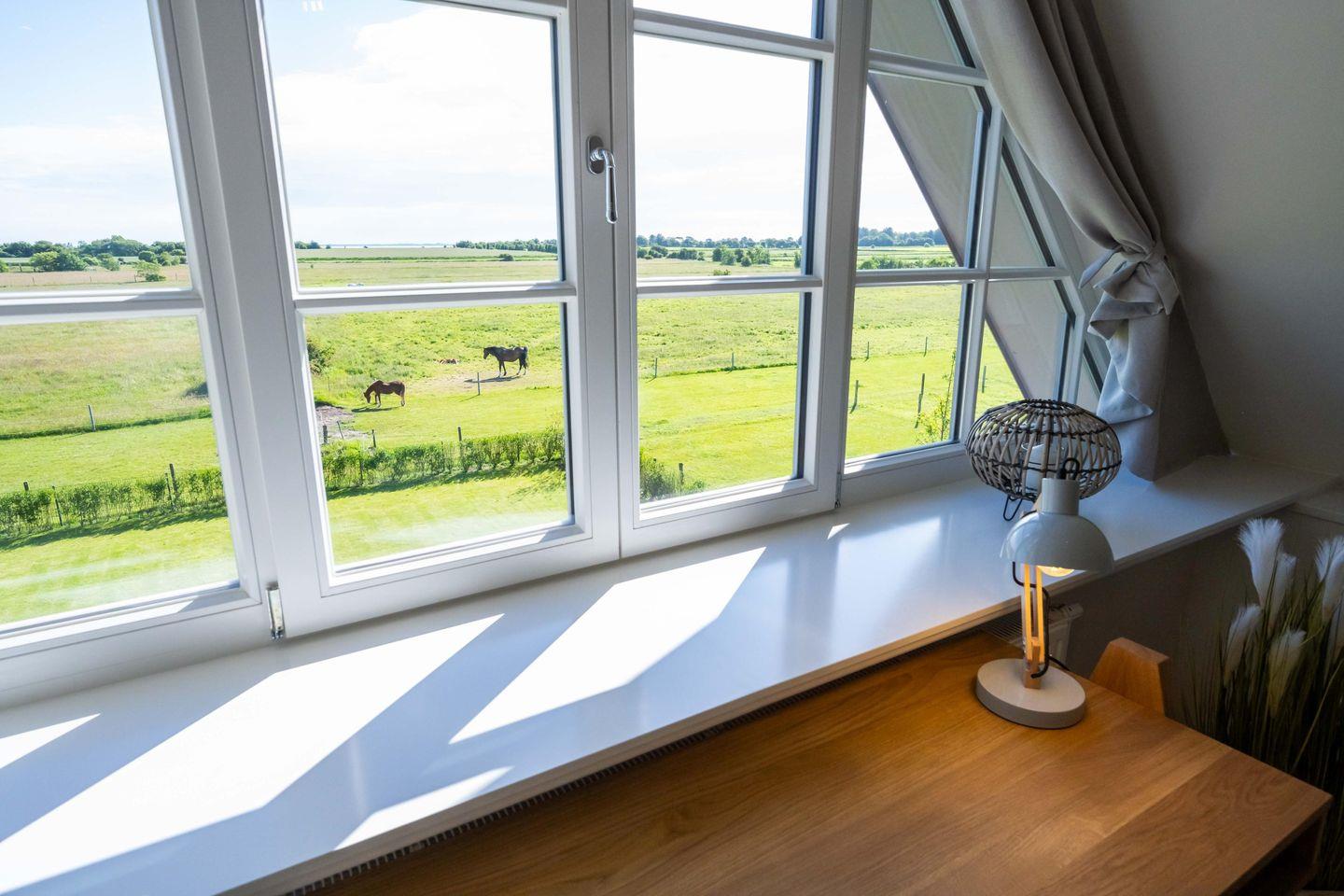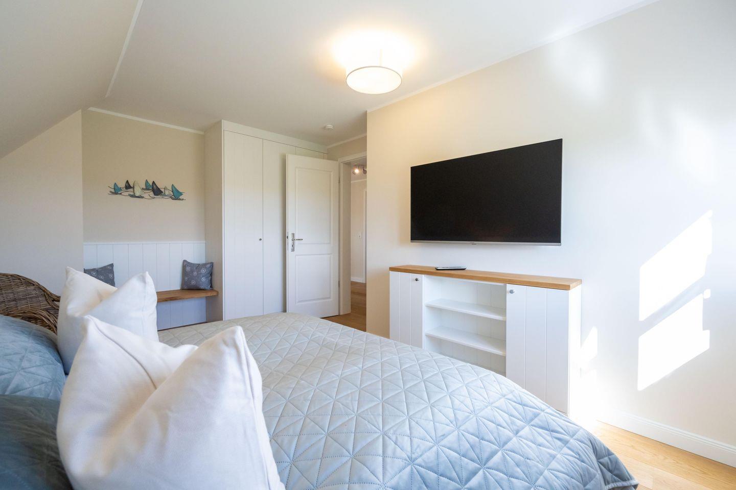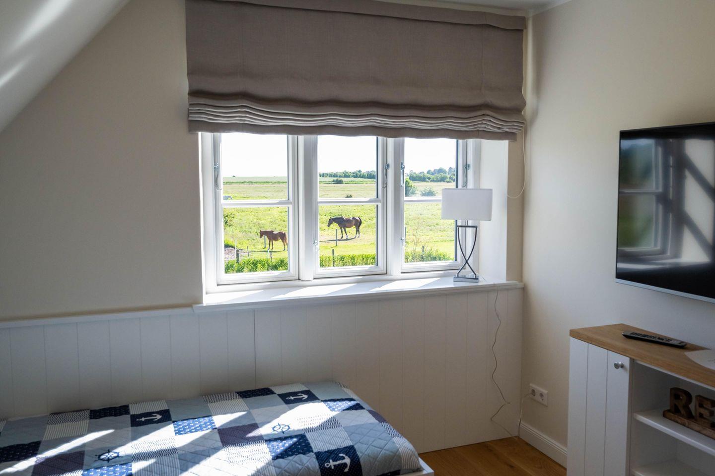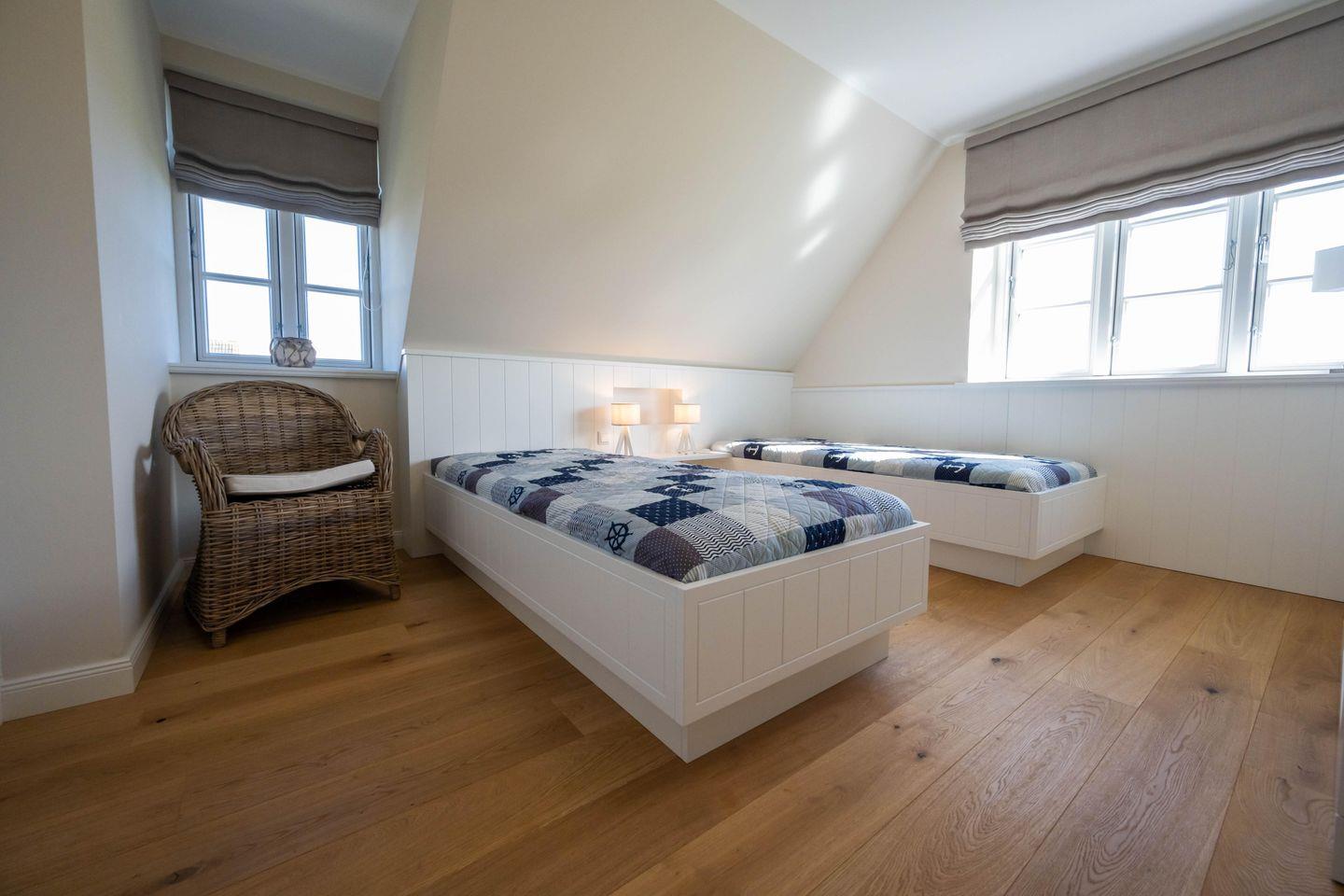 Im Dachgeschoss befindet sich das dritte Schlafzimmer - ebenfalls mit einem Doppelbett und einem Smart-TV ausgestattet und mit eindrucksvoller Deckenhöhe! Von hier aus haben Sie einen traumhaften Ausblick auf die Nordsee und die umliegende Landschaft.