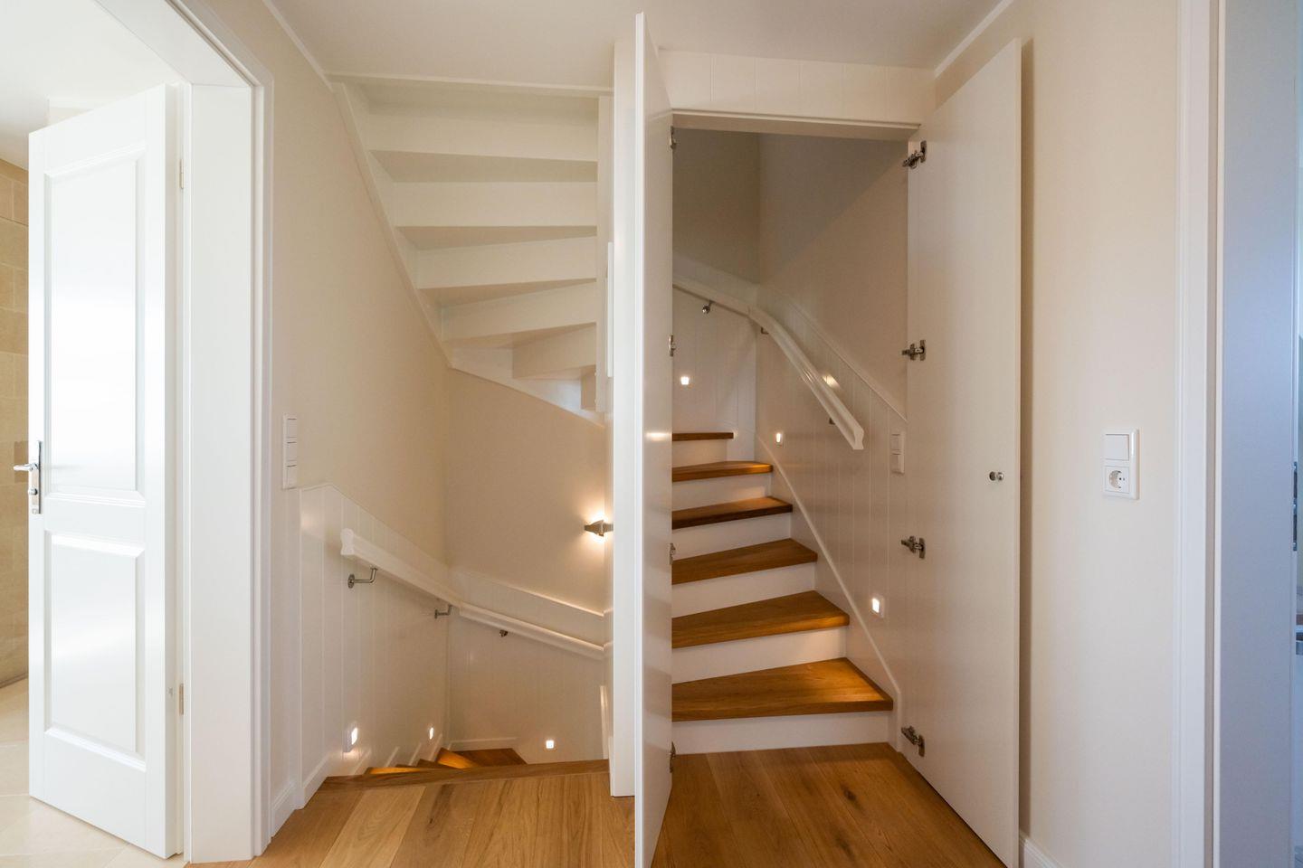 Im Erdgeschoss befinden sich der großzügige Wohn- und Essbereich mit offener Küche sowie das Gäste-WC. Über den Wohnbereich gelangen Sie direkt auf die eigene Terrasse und in den Garten. Der Kamin sorgt auch an kühleren Abenden für eine angenehme Atmosphäre. Im Gäste-WC stehen Ihnen Waschmaschine und Trockner zur Verfügung.