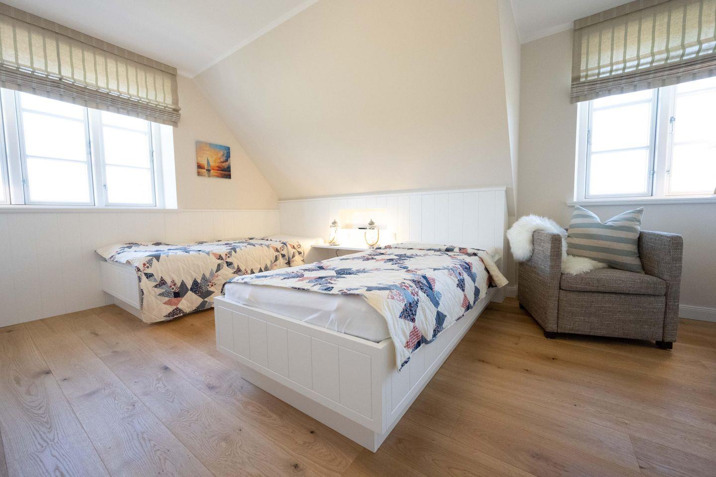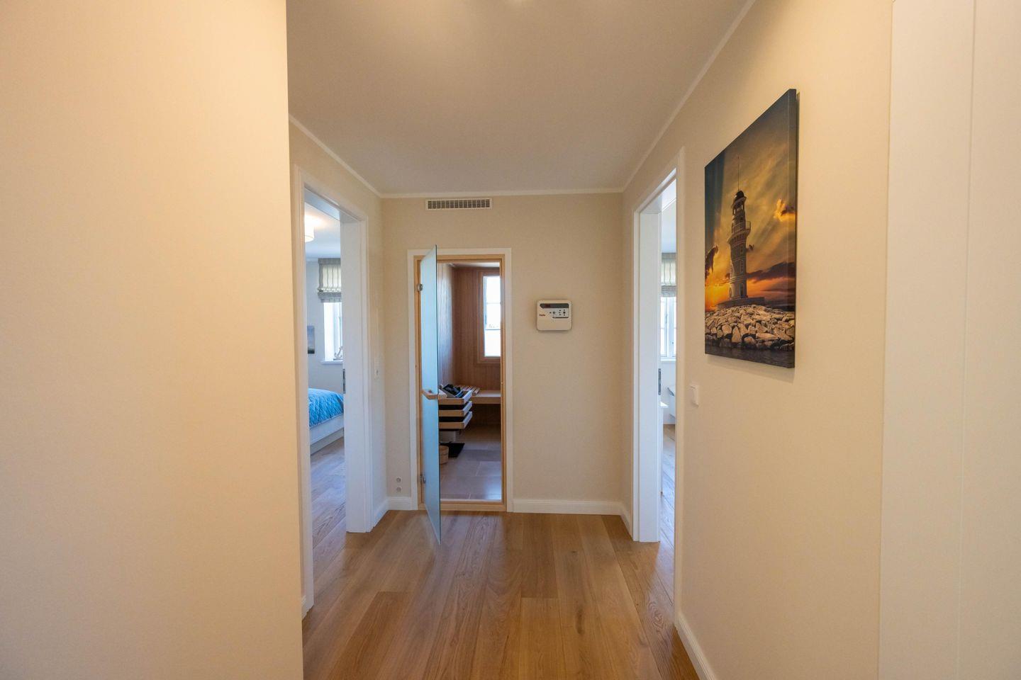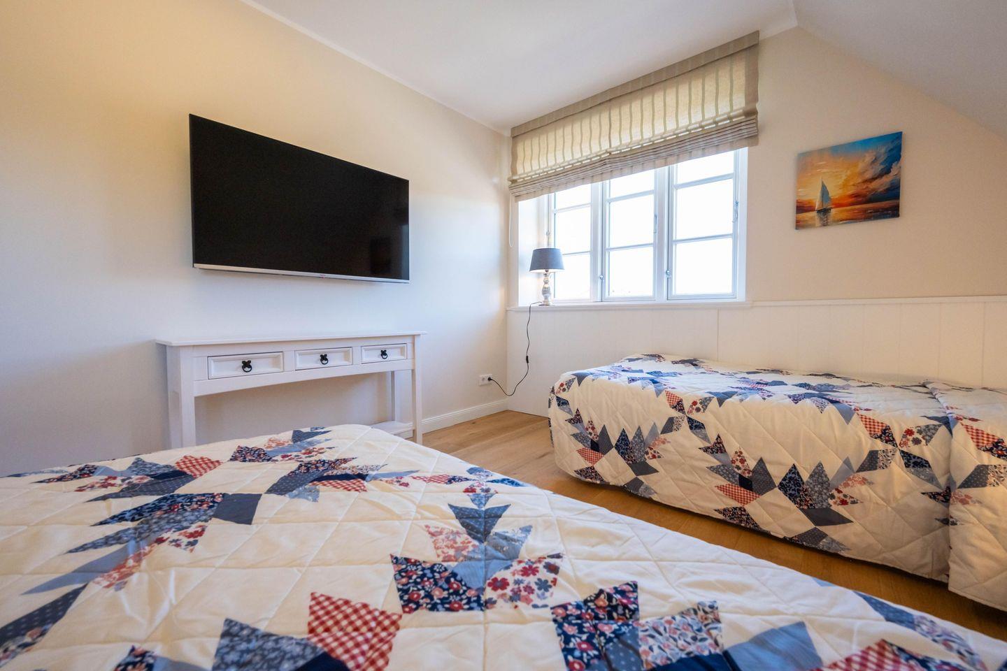 Im Obergeschoss sind zwei Schlafzimmer - eines mit einem Doppelbett und eines mit zwei Einzelbetten und jeweils einem Smart-TV ausgestattet -, das Vollbad mit Dusche und Badewanne, sowie ein weiteres Duschbad und die hauseigene Sauna.