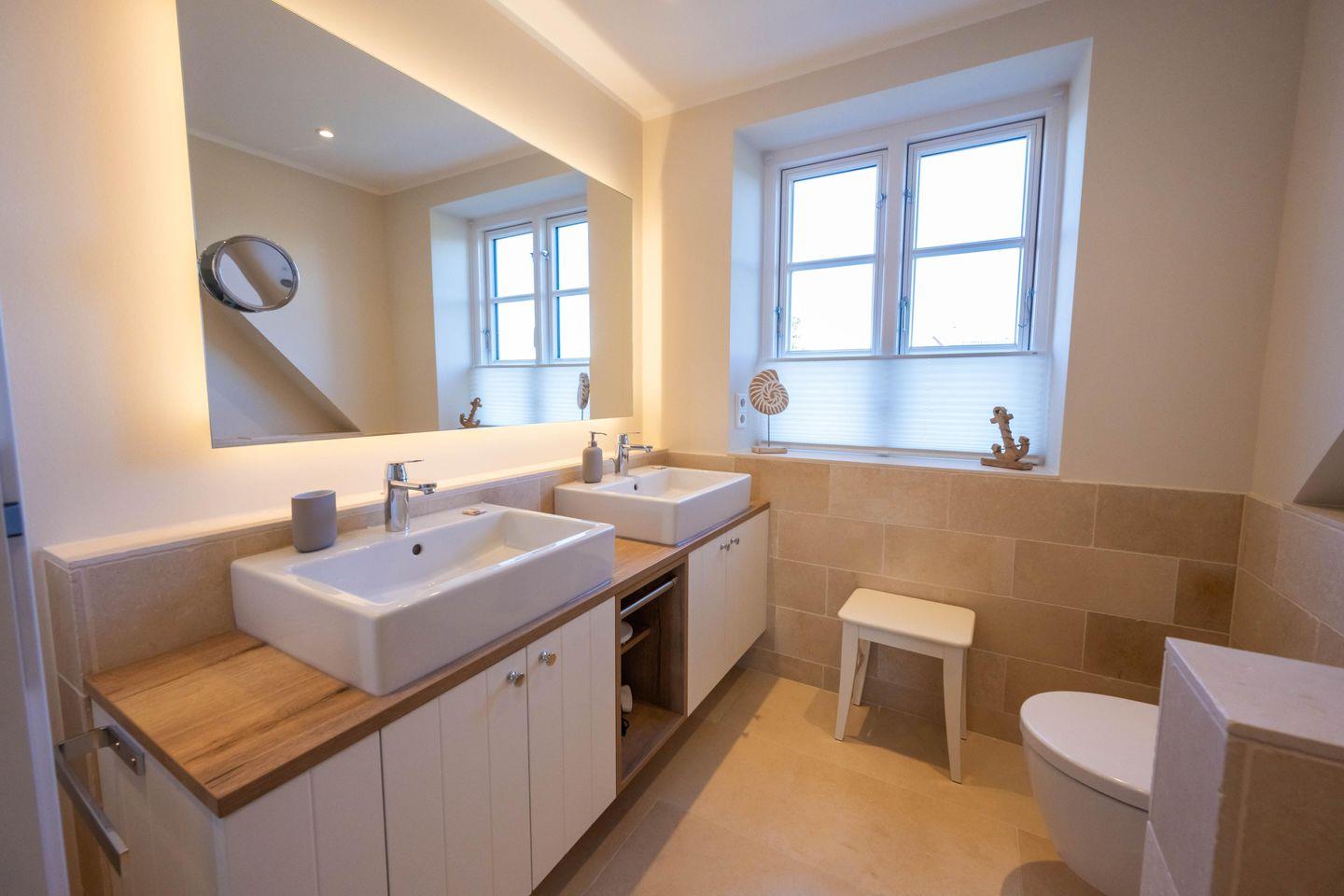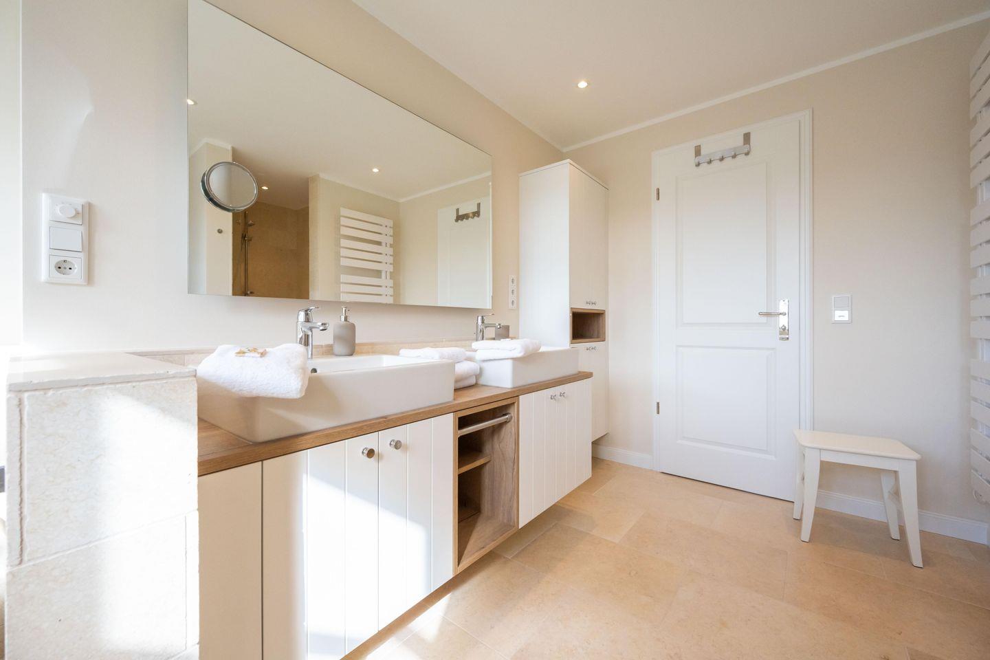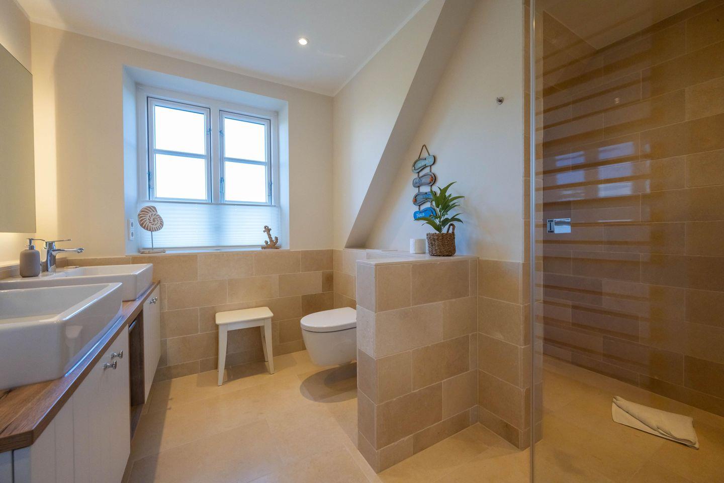 Im Obergeschoss sind zwei Schlafzimmer - eines mit einem Doppelbett und eines mit zwei Einzelbetten und jeweils einem Smart-TV ausgestattet -, das Vollbad mit Dusche und Badewanne, sowie ein weiteres Duschbad und die hauseigene Sauna.