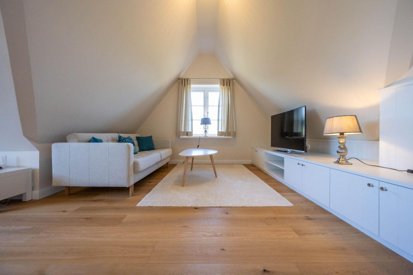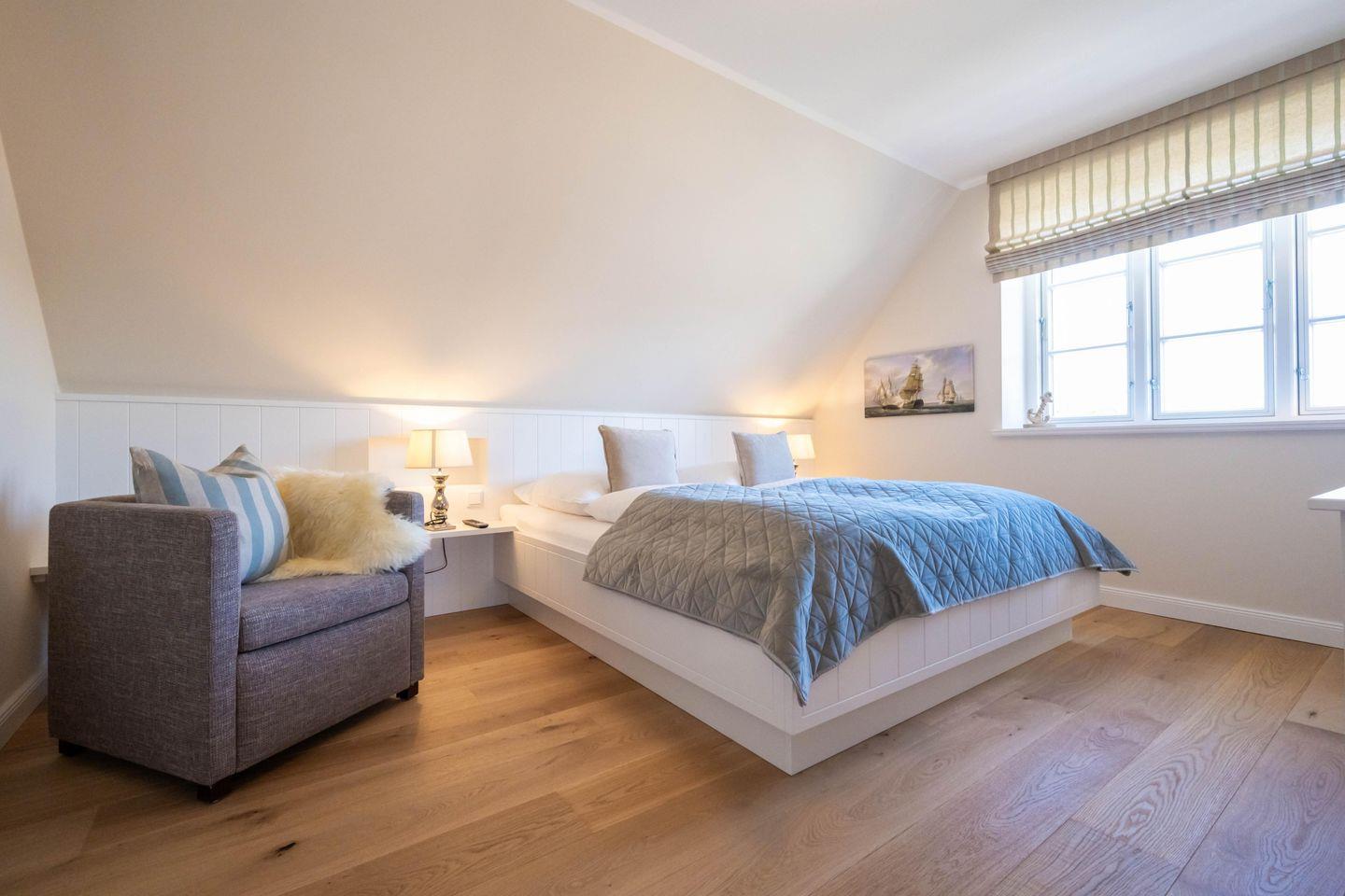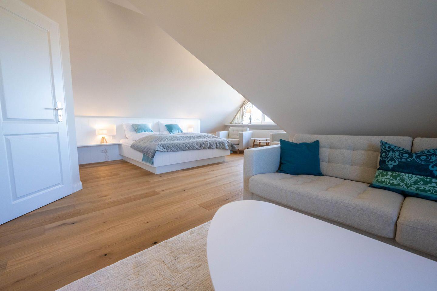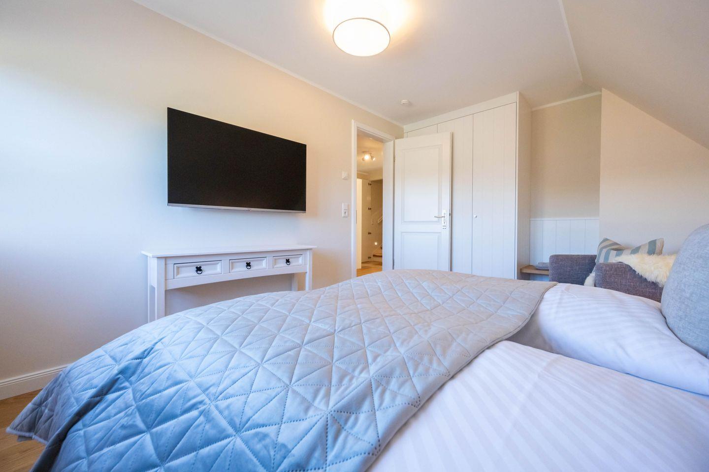 Im Dachgeschoss befindet sich das dritte Schlafzimmer - ebenfalls mit einem Doppelbett und einem Smart-TV ausgestattet und mit eindrucksvoller Deckenhöhe!