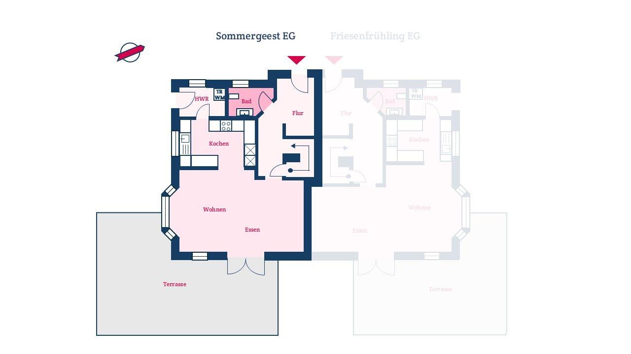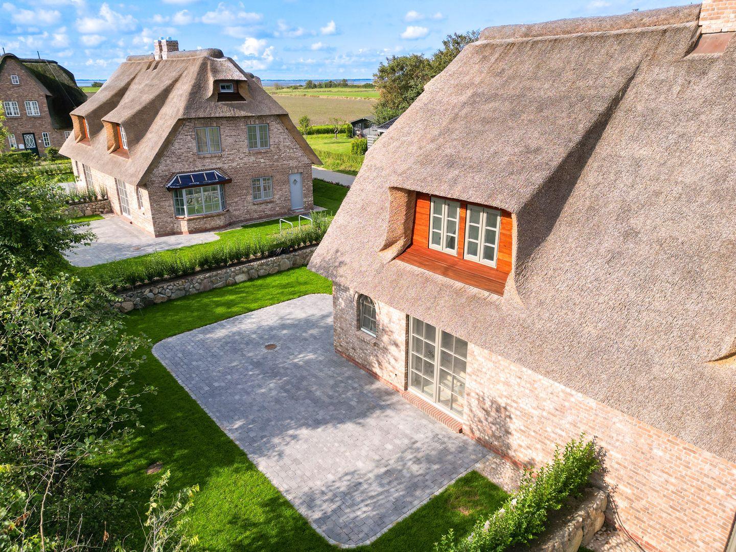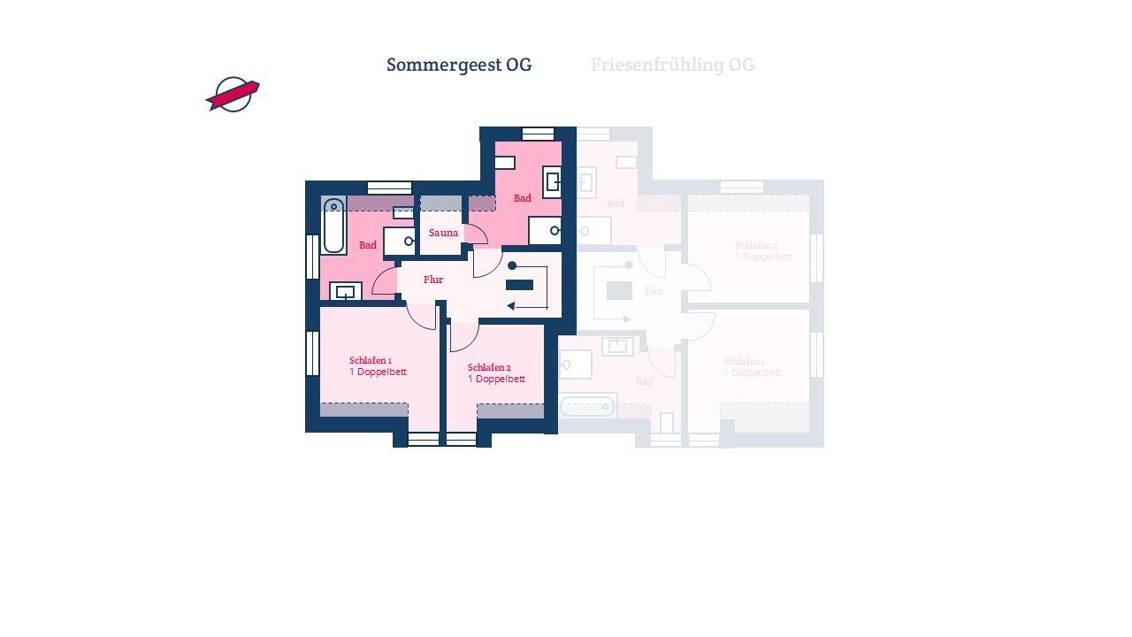 Die reetgedeckte Ferienhaushälfte Sommergeest verfügt über 2 Schlafzimmer, 2 Bäder und 1 Gäste-WC und bietet somit komfortabel Platz für bis zu 4 Personen zuzüglich einer Kleinkinderaufbettung. Auch bis zu 2 Hunde sind herzlich willkommen.