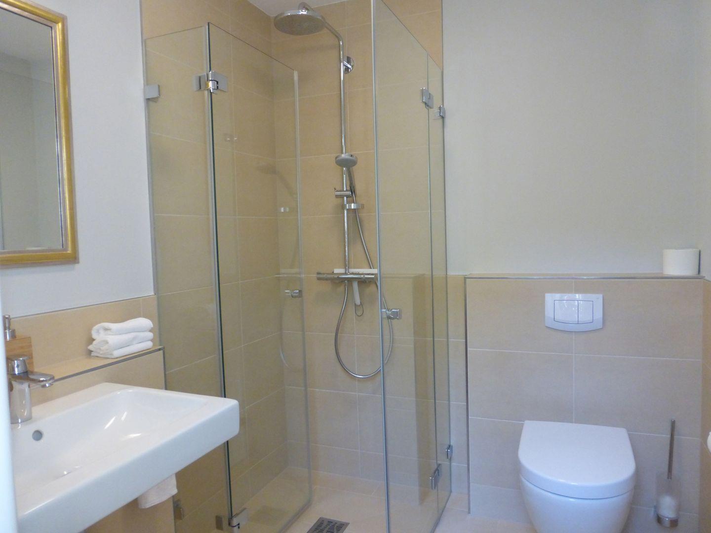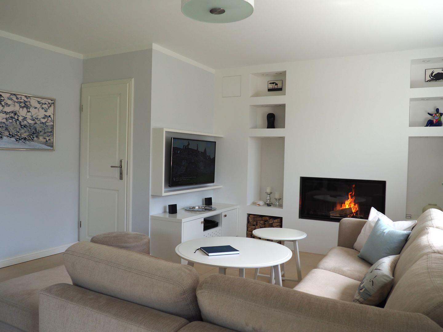 Im Erdgeschoss befindet sich das Wohn-/Esszimmer mit offener Küche und Panoramakamin. Zudem ist hier ein Badezimmer mit bodengleicher Dusche vorhanden.