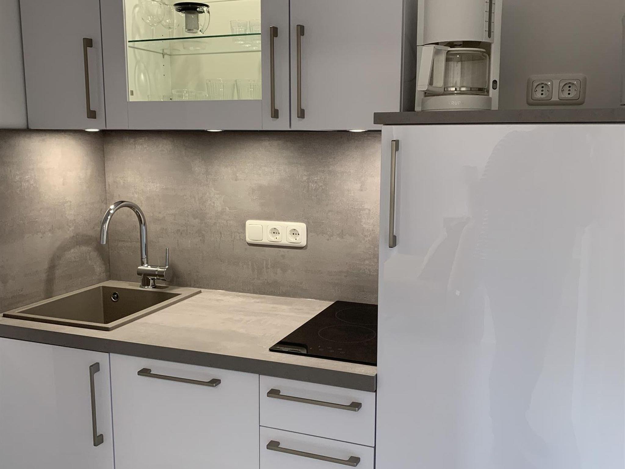 Die ausgestattete Einbauküche mit Geschirrspüler befindet sich im Eingangsbereich. Von dort aus gelangen Sie ins Bad mit einer Runddusche, WC und Waschbecken.