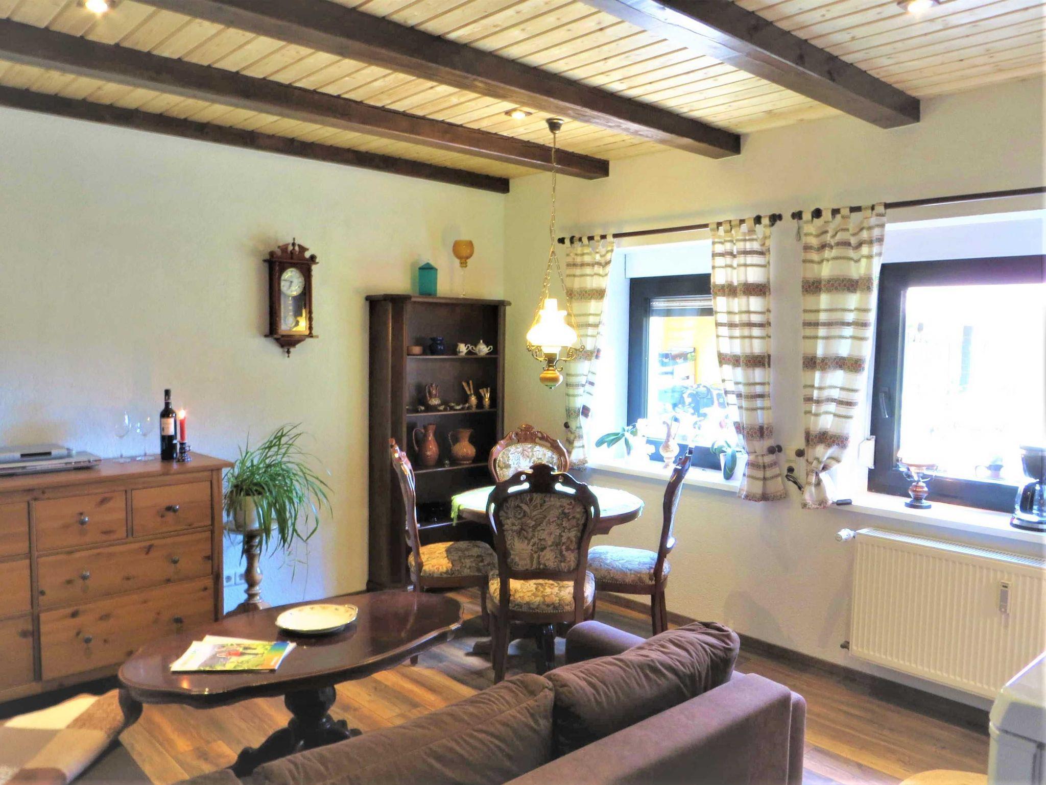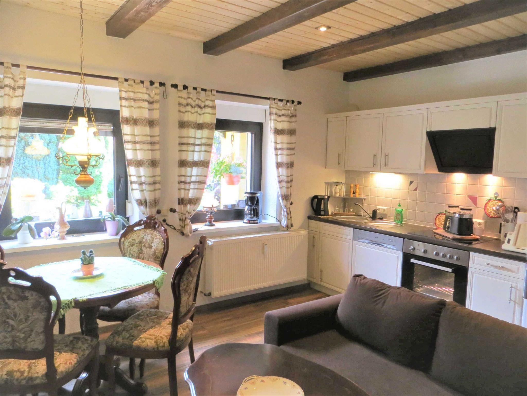 Die Ferienwohnung befindet sich in der unteren Etage des Objektes und ist mit nur einer kleinen Stufe begehbar. Sie bietet Ihnen ein Wohnzimmer mit einer Sitzecke, die für gemütliche Stunden sorgt. Eine integrierte und voll ausgestattete Einbauküche steht Ihnen für den Aufenthalt zur Verfügung. Das kleine Schlafzimmer ist mit 2 einzeln stehenden Betten und einem Babybeistellbett ausgestattet. Dusche und Schlafzimmer wurden erst vor kurzem renoviert und modernisiert. Die Erneuerung der Bilder ist in Arbeit.