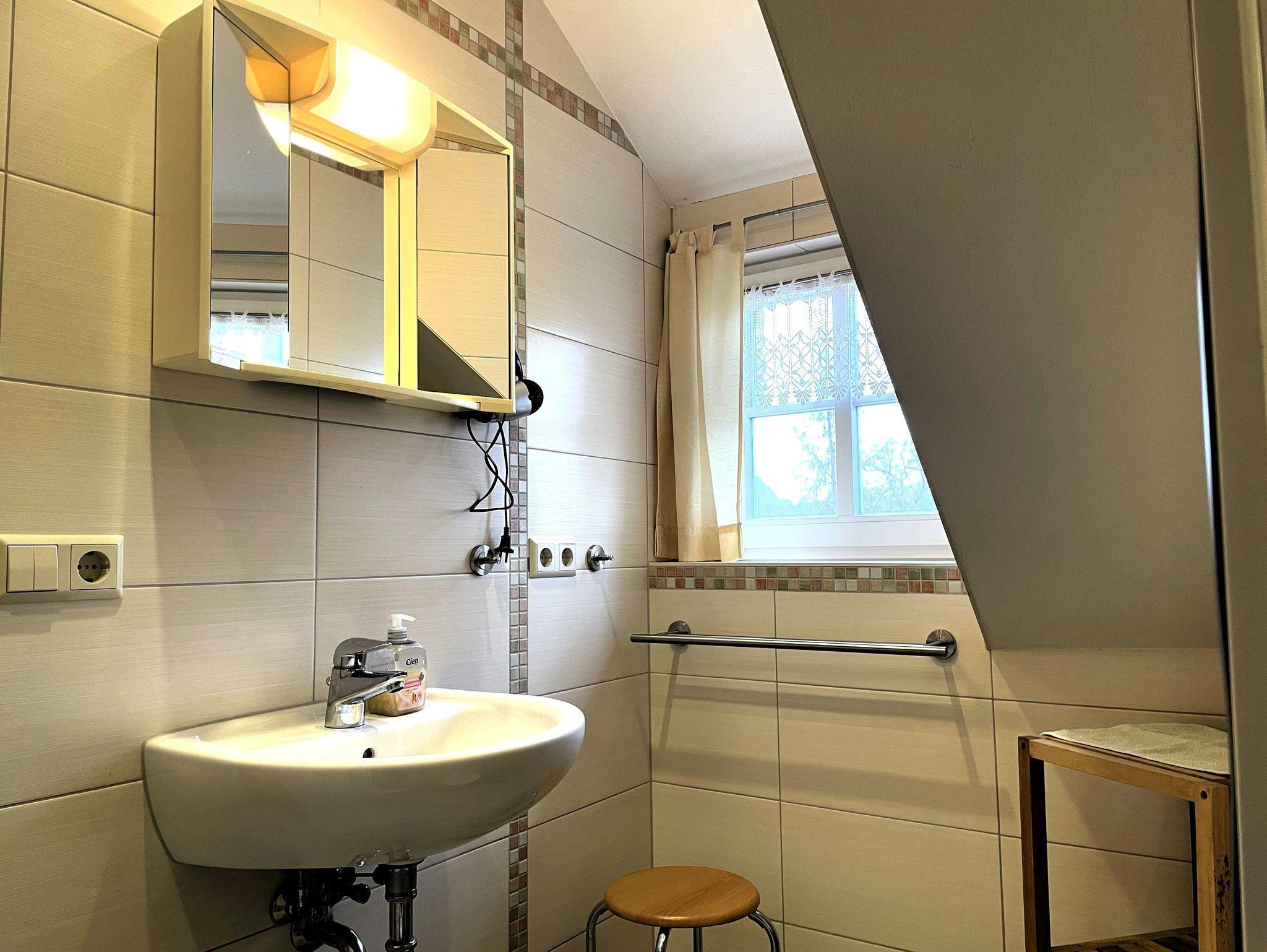 Die Wohnung erstreckt sich über zwei Etagen. Im Erdgeschoss befindet sich ein gemütliches Wohnzimmer, in dem Sie sich entspannen oder fernsehen können. Hier befindet sich auch eine Gästetoilette.