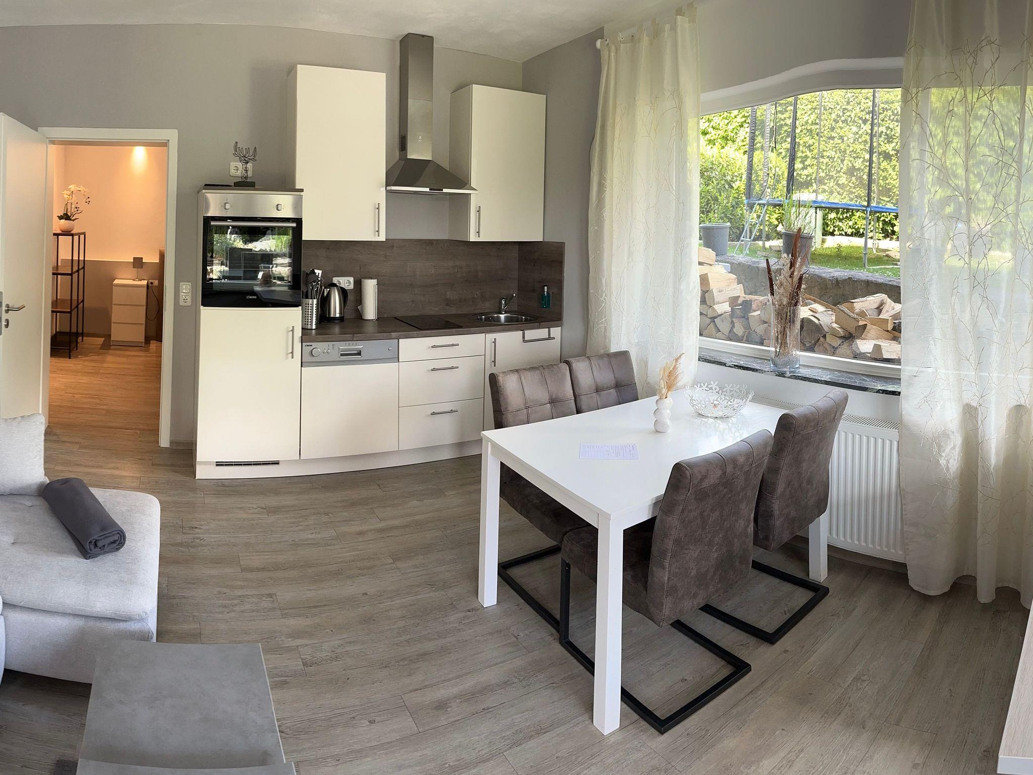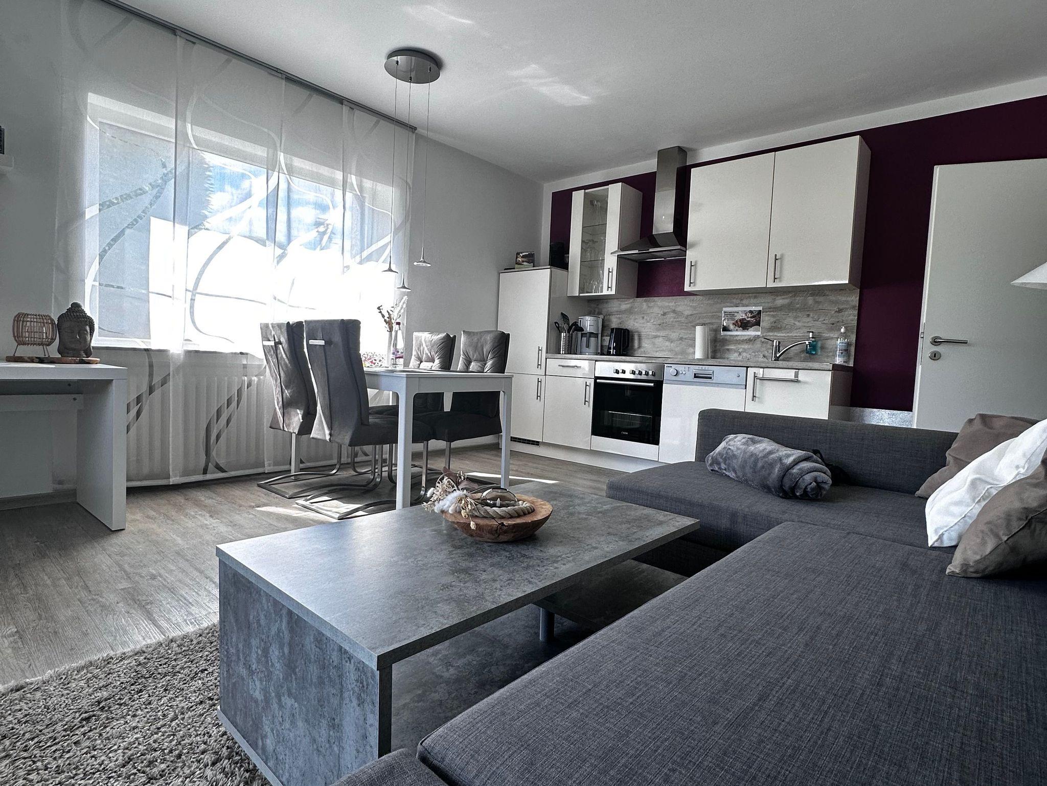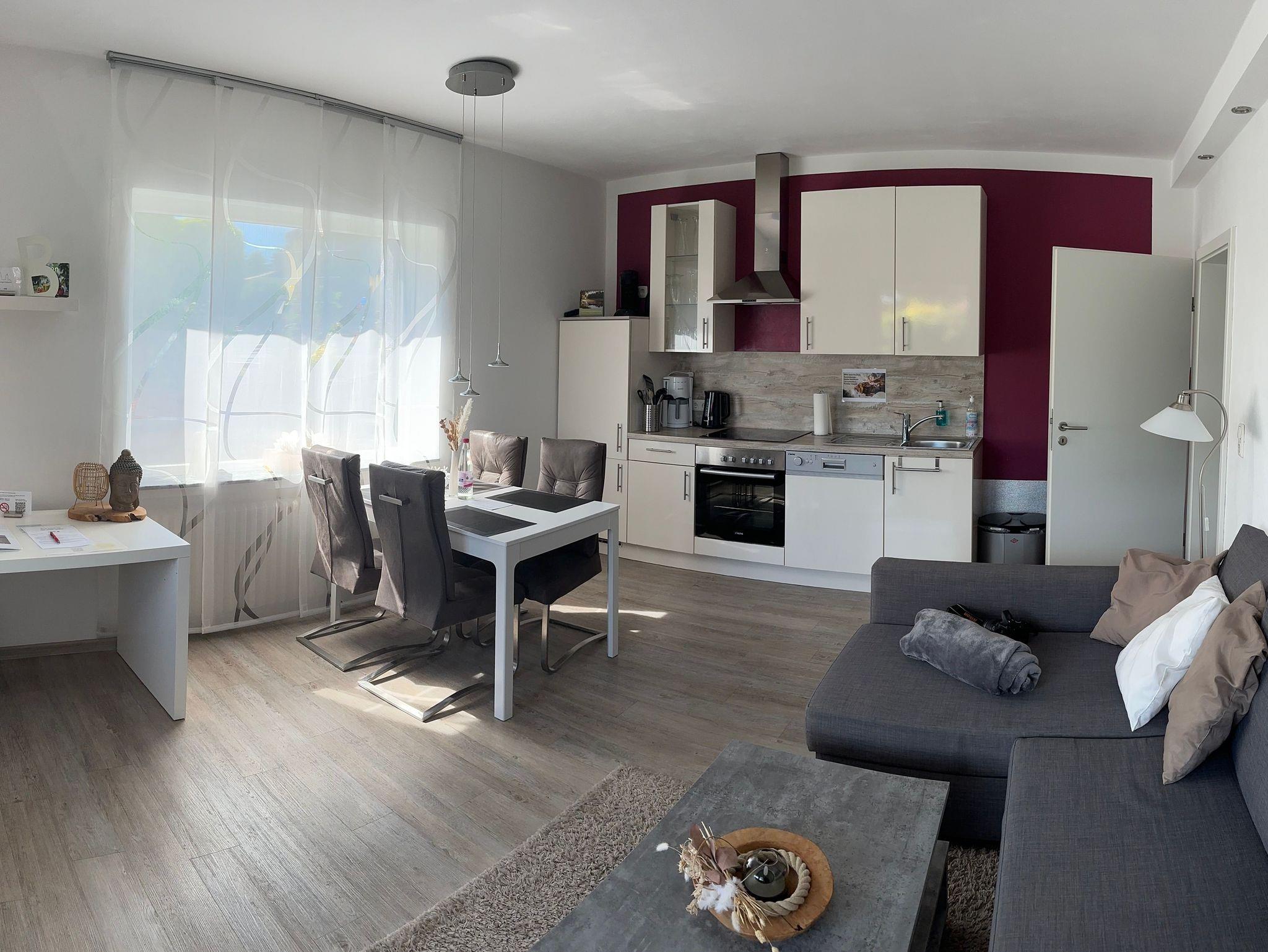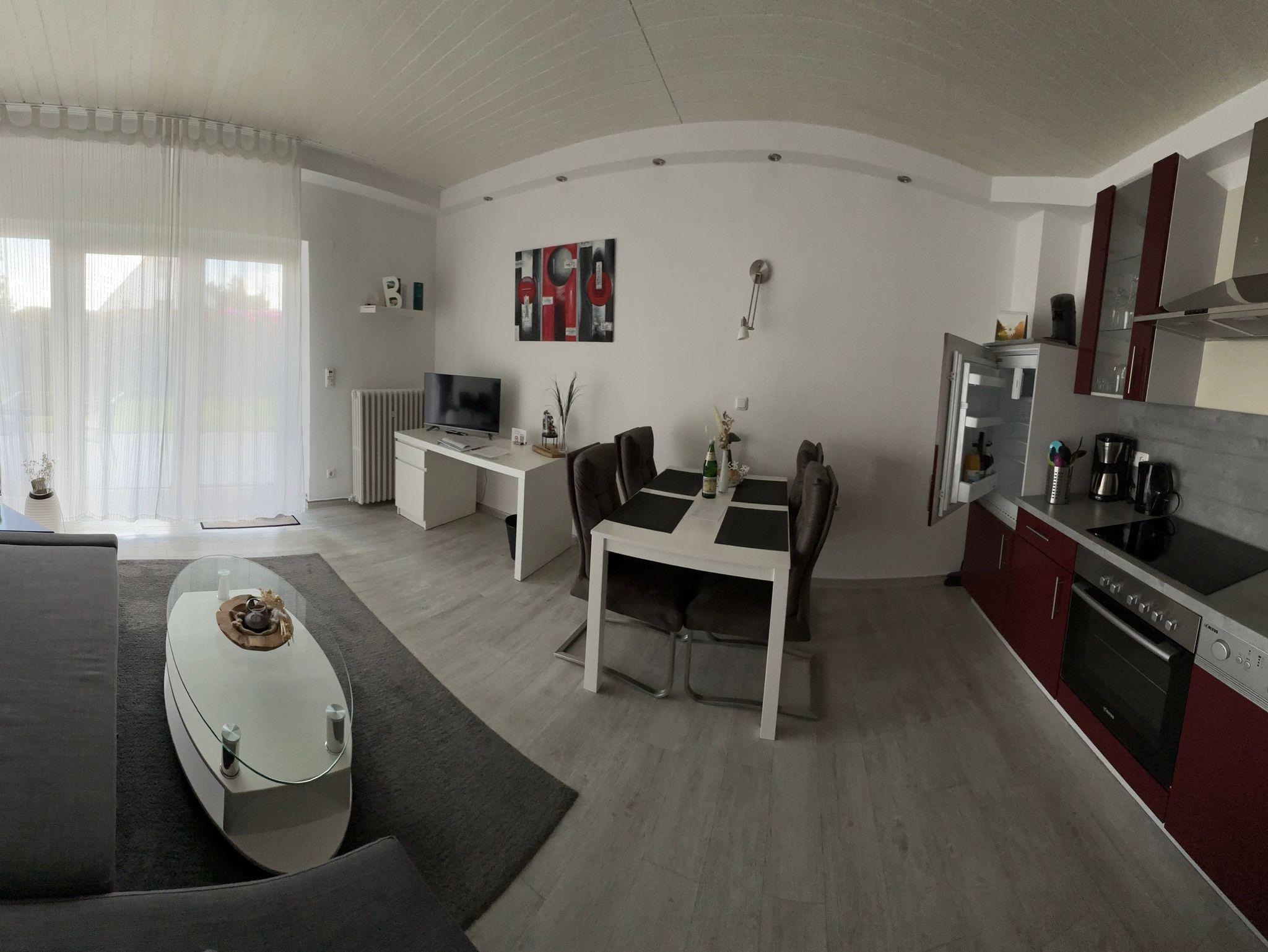 Modern eingerichtete Ferienwohnungen mit Schlafzimmer, Wohn-Esszimmer (mit Schreibtisch, Designer-Bluetooth-Box kooduu, Hifi, Smart-TV, Wlan kostenlos) und voll ausgestatteter Küche (Geschirrspüler, Backofen, Kühlschrank, Gefrierfach, Toaster, Kaffeemaschine, Senseo-Pad-Kaffeemaschine, Eierkocher, Wasserkocher). Terrasse bzw. Wohnung ebenerdig erreichbar, eigene Terrasse mit Gartenmöbel, Sonnenliege, Sonnenschirm. Elektrische Rollläden. Auf Wunsch bereiten wir zwei separate Betten vor (Schlafsofa/Doppelbett).