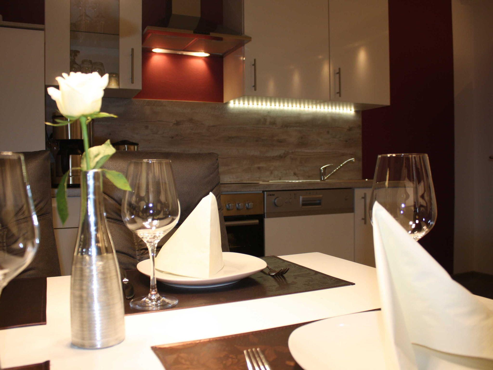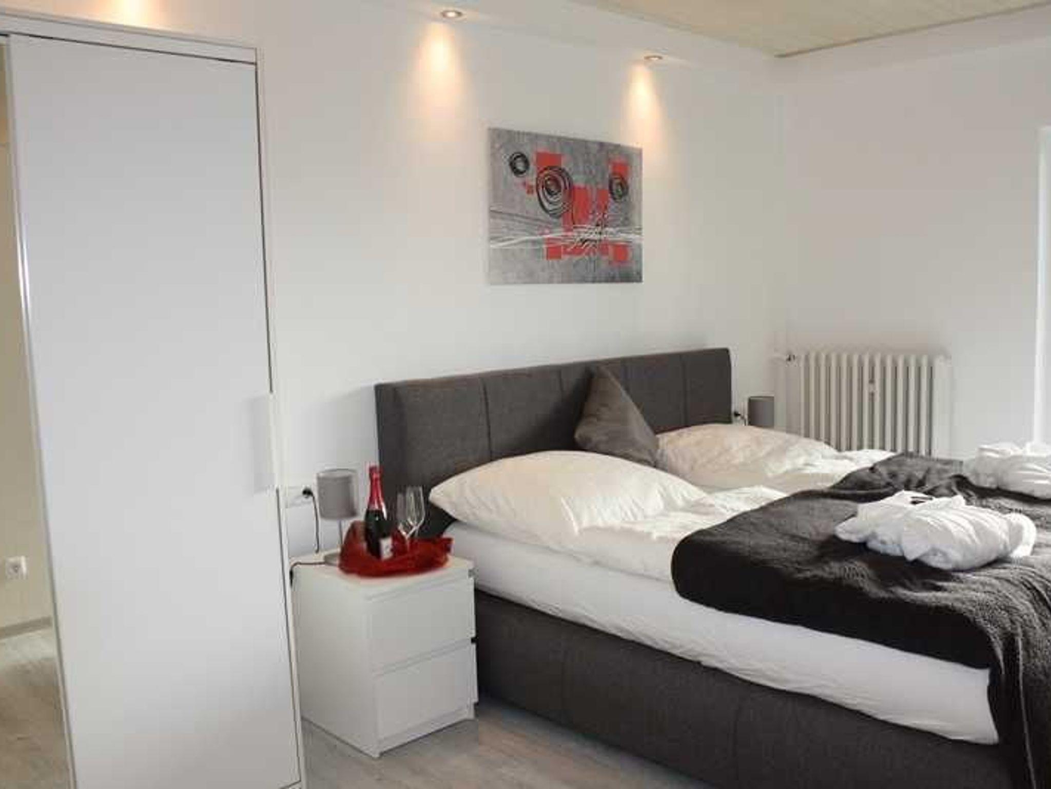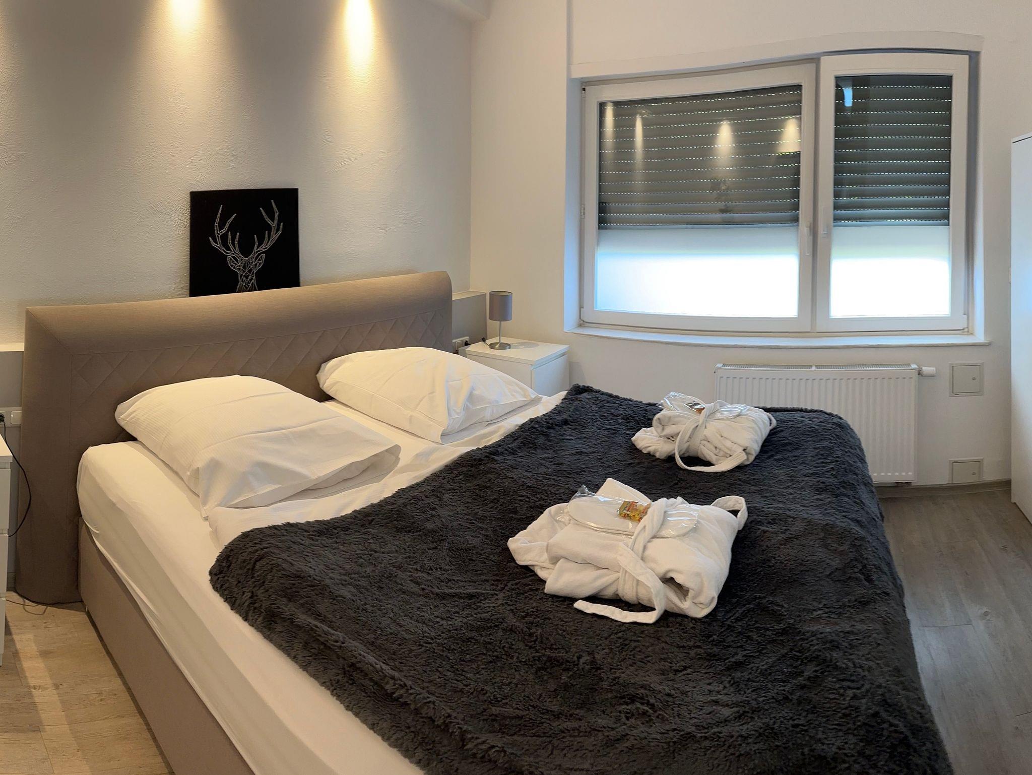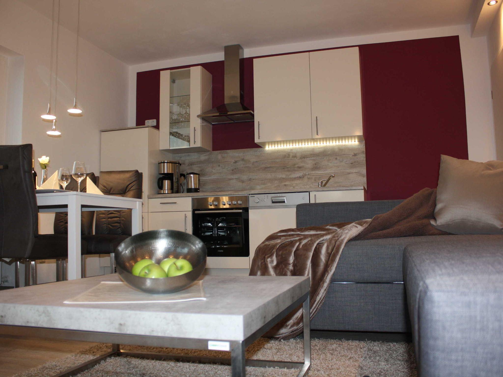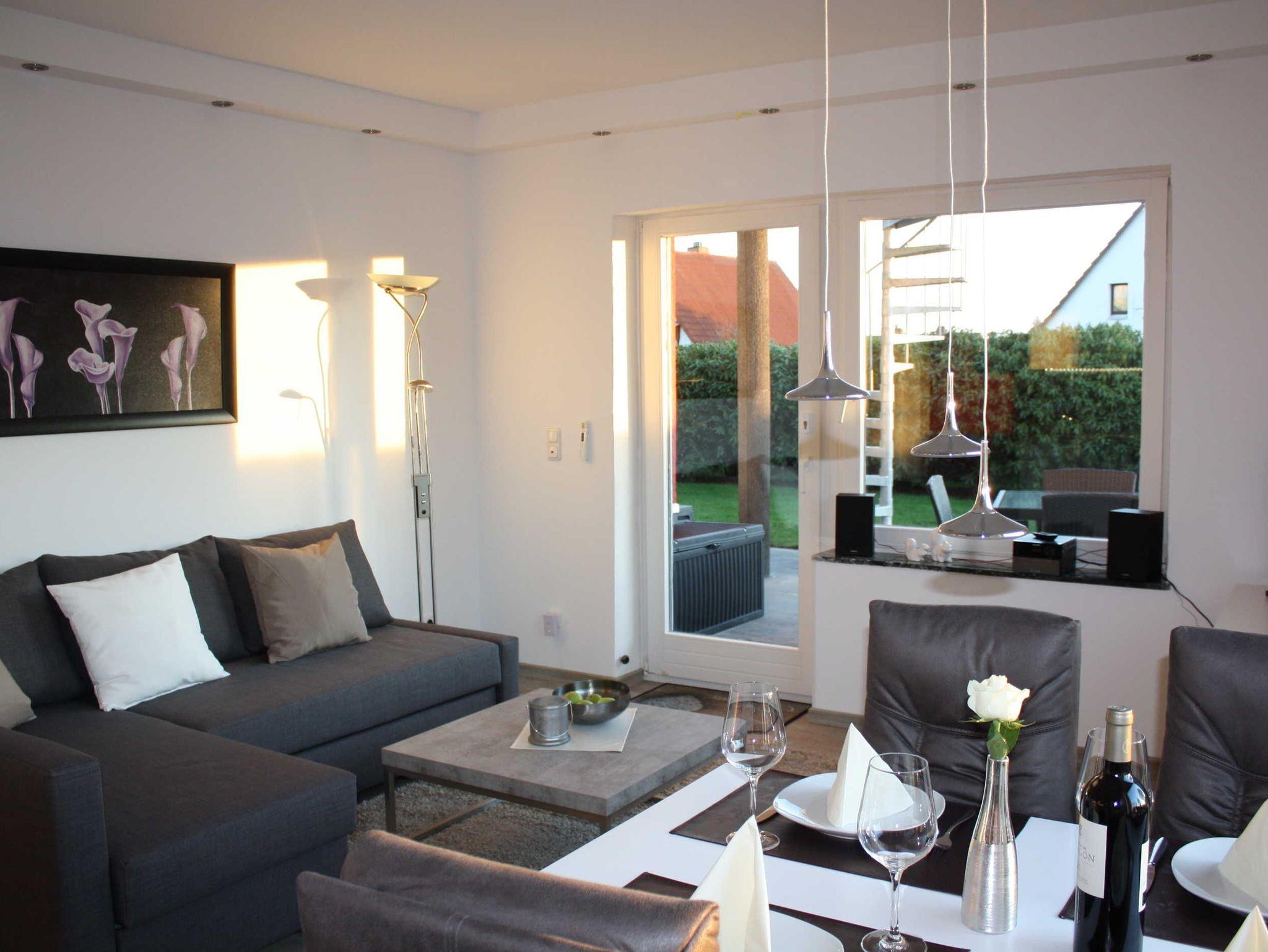Modern eingerichtete Ferienwohnungen mit Schlafzimmer, Wohn-Esszimmer (mit Schreibtisch, Designer-Bluetooth-Box kooduu, Hifi, Smart-TV, Wlan kostenlos) und voll ausgestatteter Küche (Geschirrspüler, Backofen, Kühlschrank, Gefrierfach, Toaster, Kaffeemaschine, Senseo-Pad-Kaffeemaschine, Eierkocher, Wasserkocher). Terrasse bzw. Wohnung ebenerdig erreichbar, eigene Terrasse mit Gartenmöbel, Sonnenliege, Sonnenschirm. Elektrische Rollläden. Auf Wunsch bereiten wir zwei separate Betten vor (Schlafsofa/Doppelbett).
