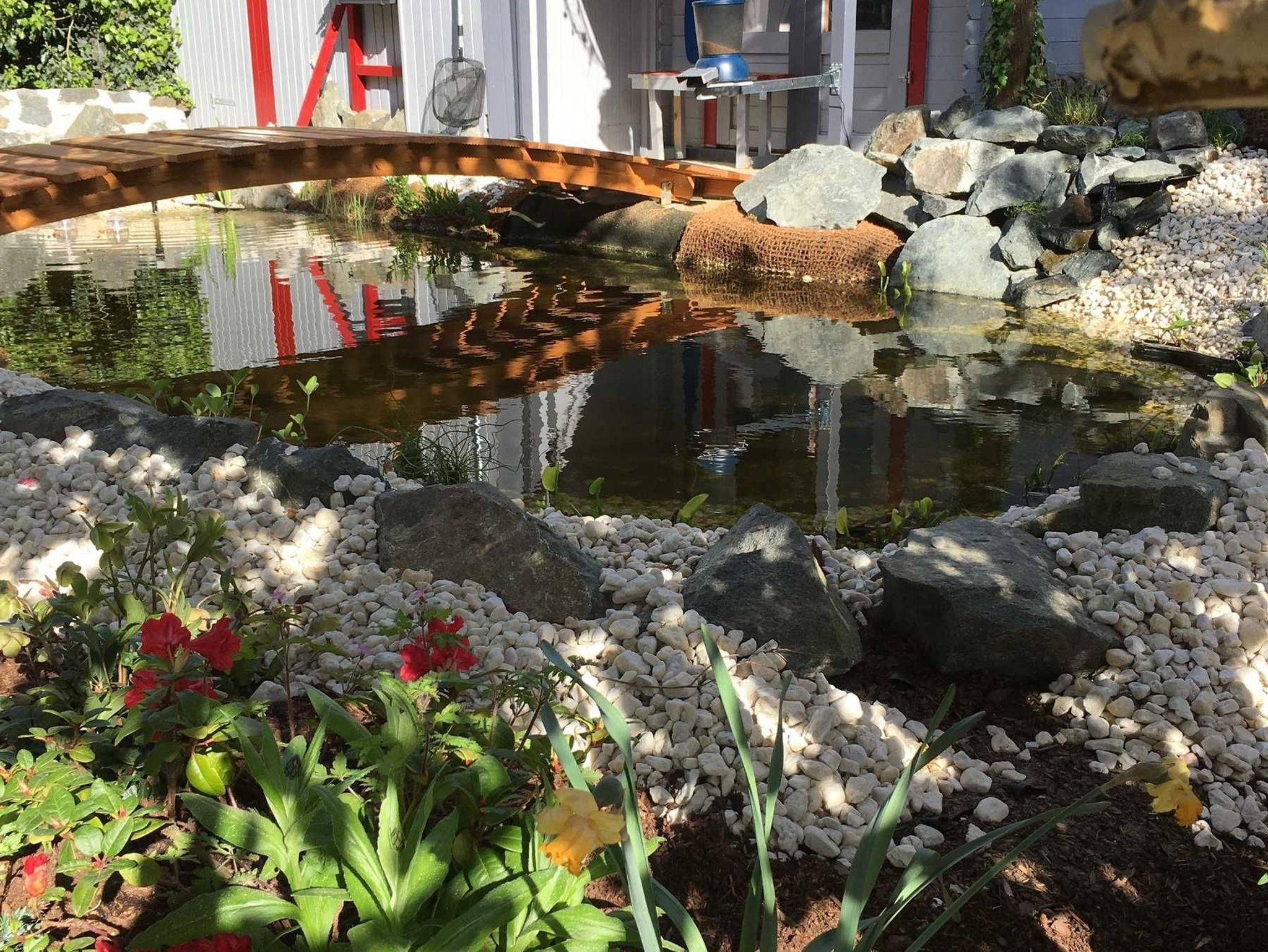 Der angrenzende Koi-Teich mit plätscherndem Wasserfall sorgt für innere Entspannung.