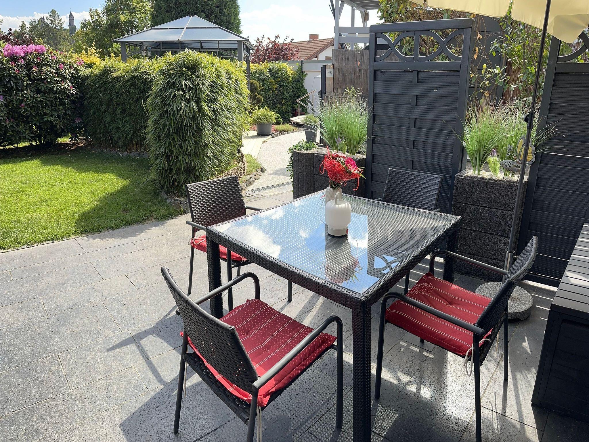 Drei sonnige, sehr helle und ruhige 4-Sterne Ferienwohnungen, mit modernem Boxspringbett, fantastischem Schlossblick, großem, modernem Bad mit bodengleicher Dusche, Wohn-/Esszimmer, inklusive voll ausgestatteter, moderner Küche und ausziehbarem Schlafsofa und Schreibtisch. Jedes Apartment hat eine eigene große Terrasse mit Liegestuhl, Sonnenschirm und Tisch mit 4 Stühlen sowie eine helle Fensterfront.