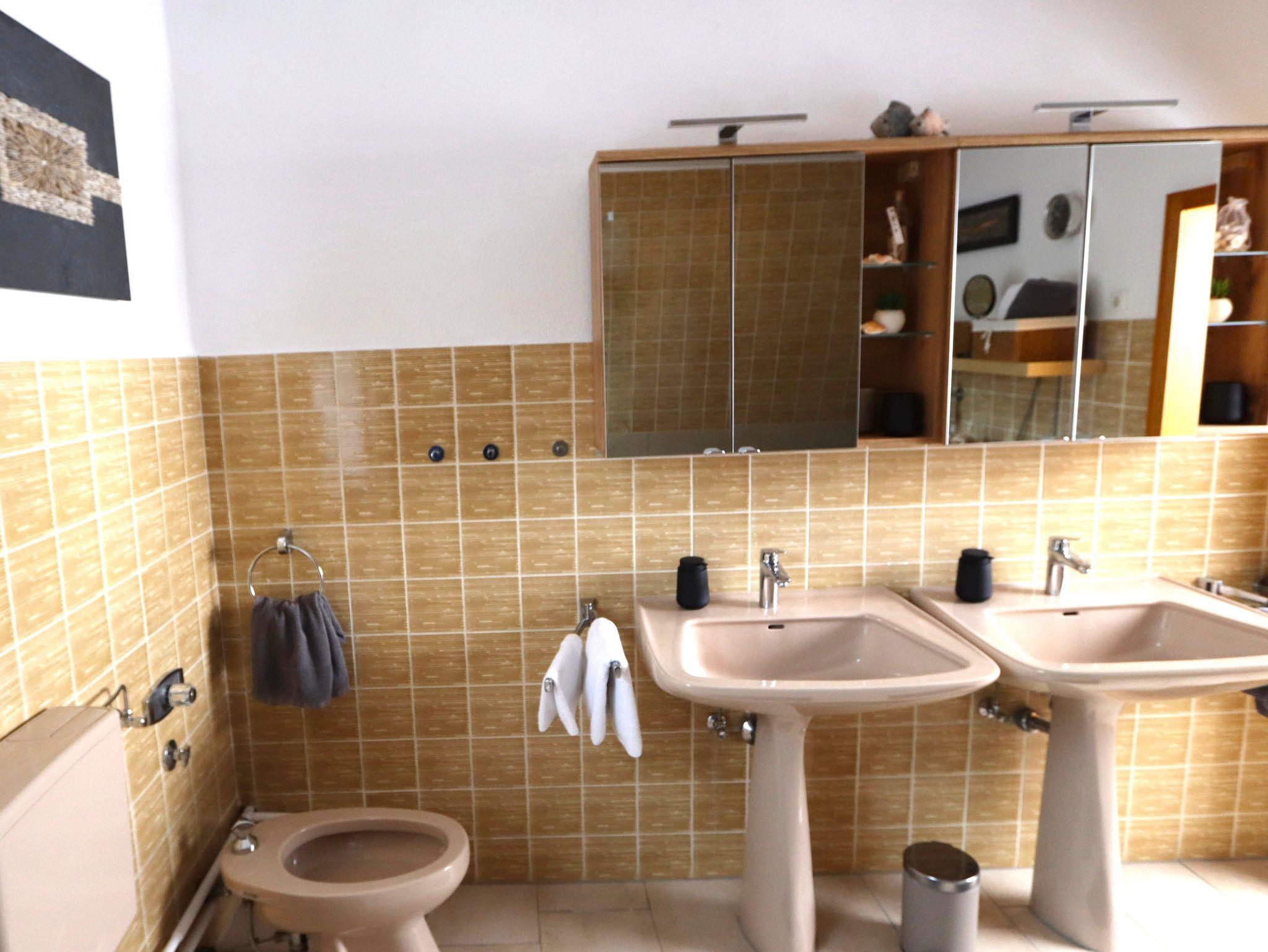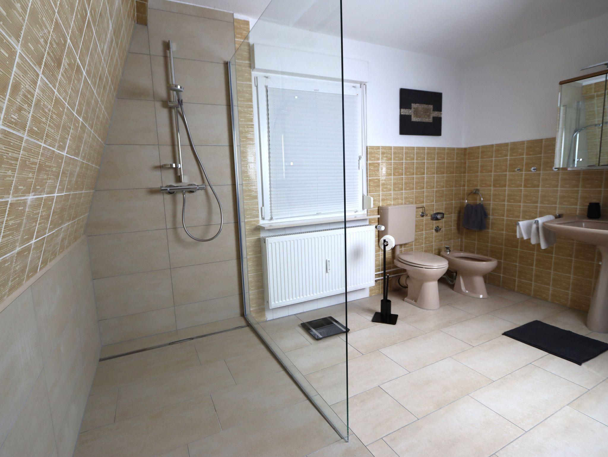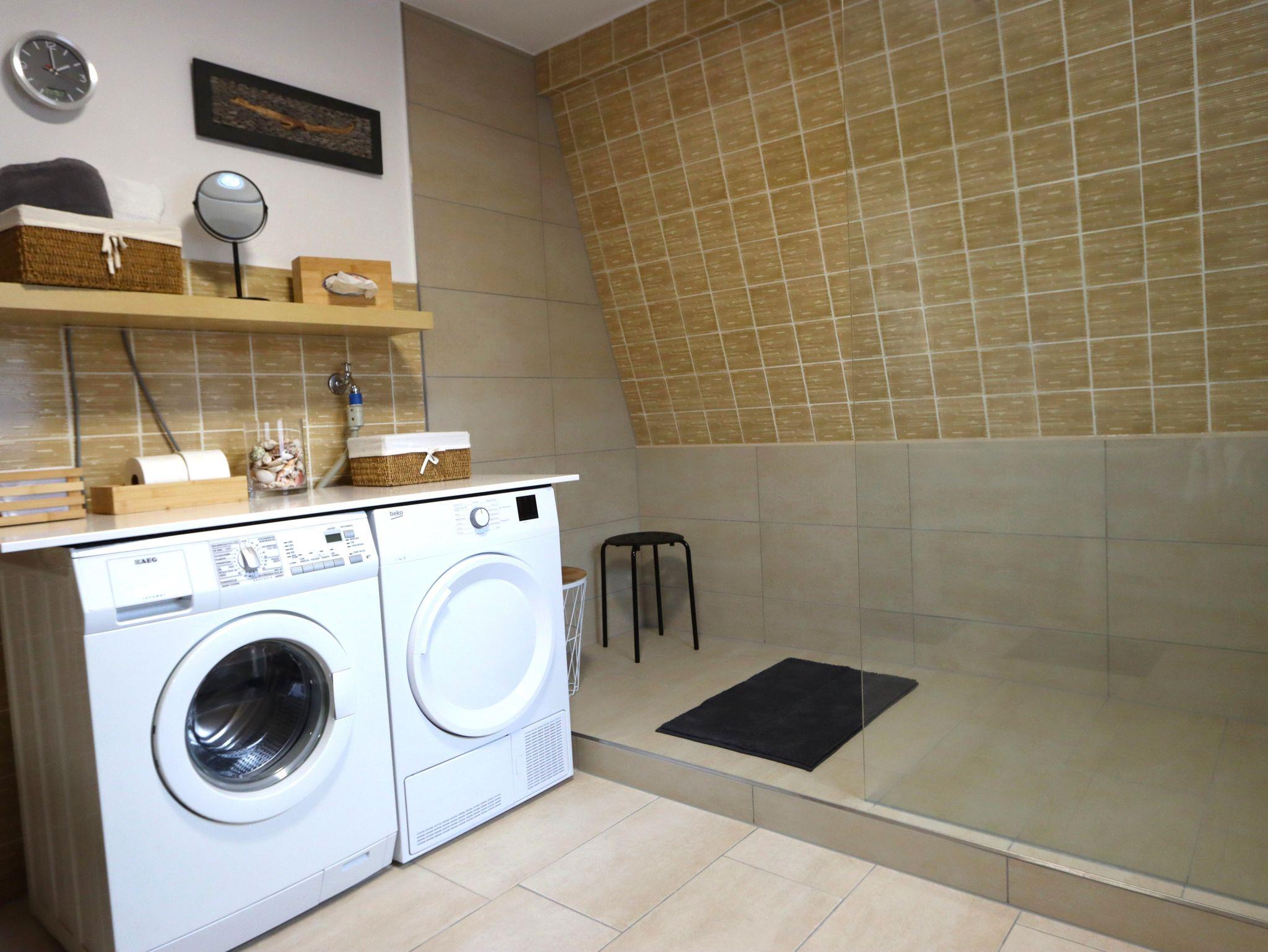 Das neu renovierte Badezimmer bietet viel Platz. Sie finden hier zwei Waschbecken, WC und Bidet, eine Körperwaage, Kosmetikspiegel, Haartrockner sowie eine geräumige Dusche, viel Stauraum eine Waschmaschine und Wäschetrockner. Auch Seife, Kosmetiktücher, Toilettenpapier und Handtücher sind inklusive.