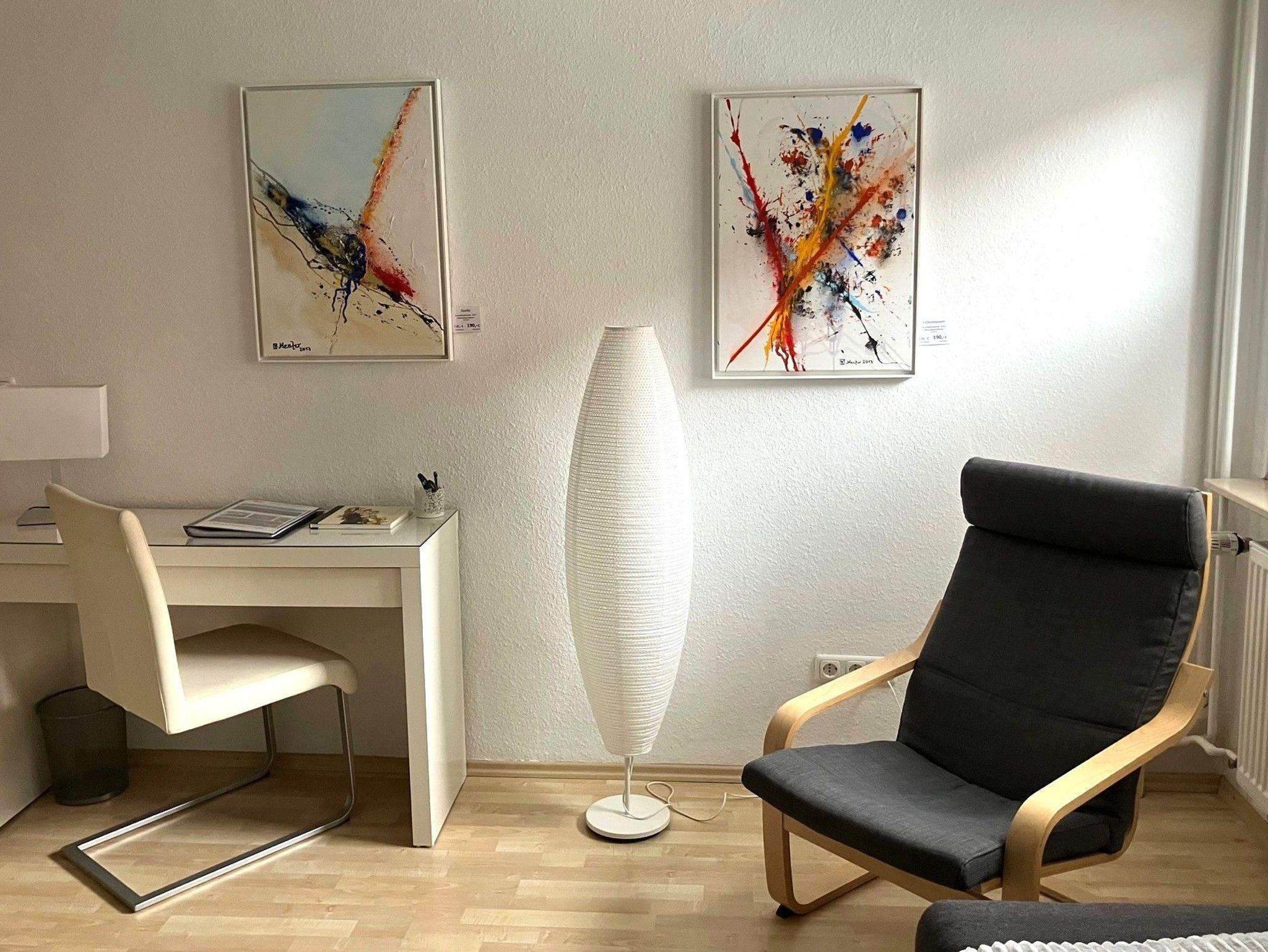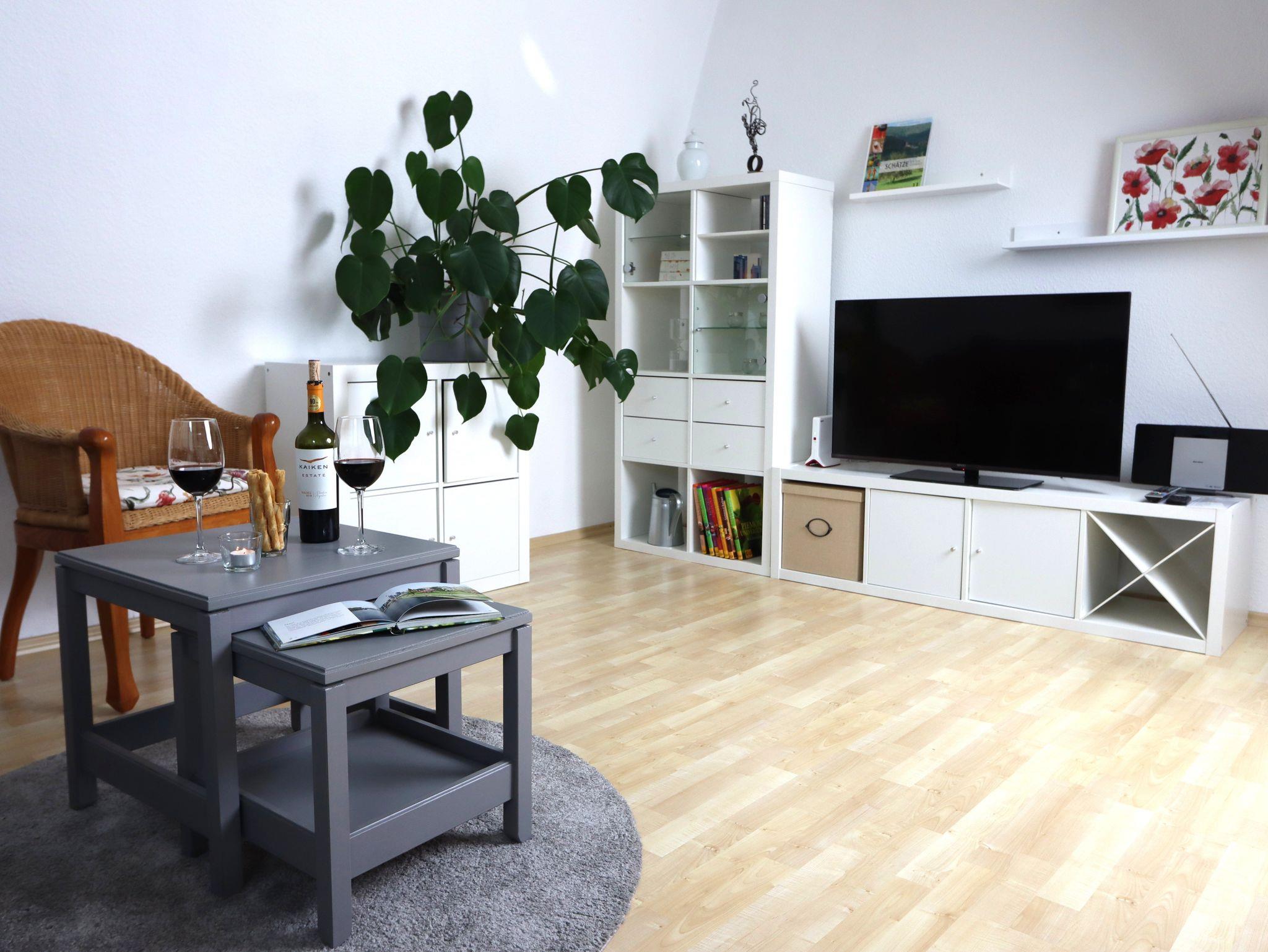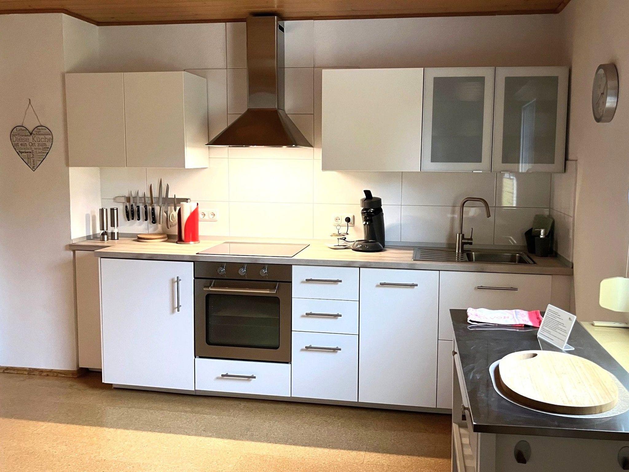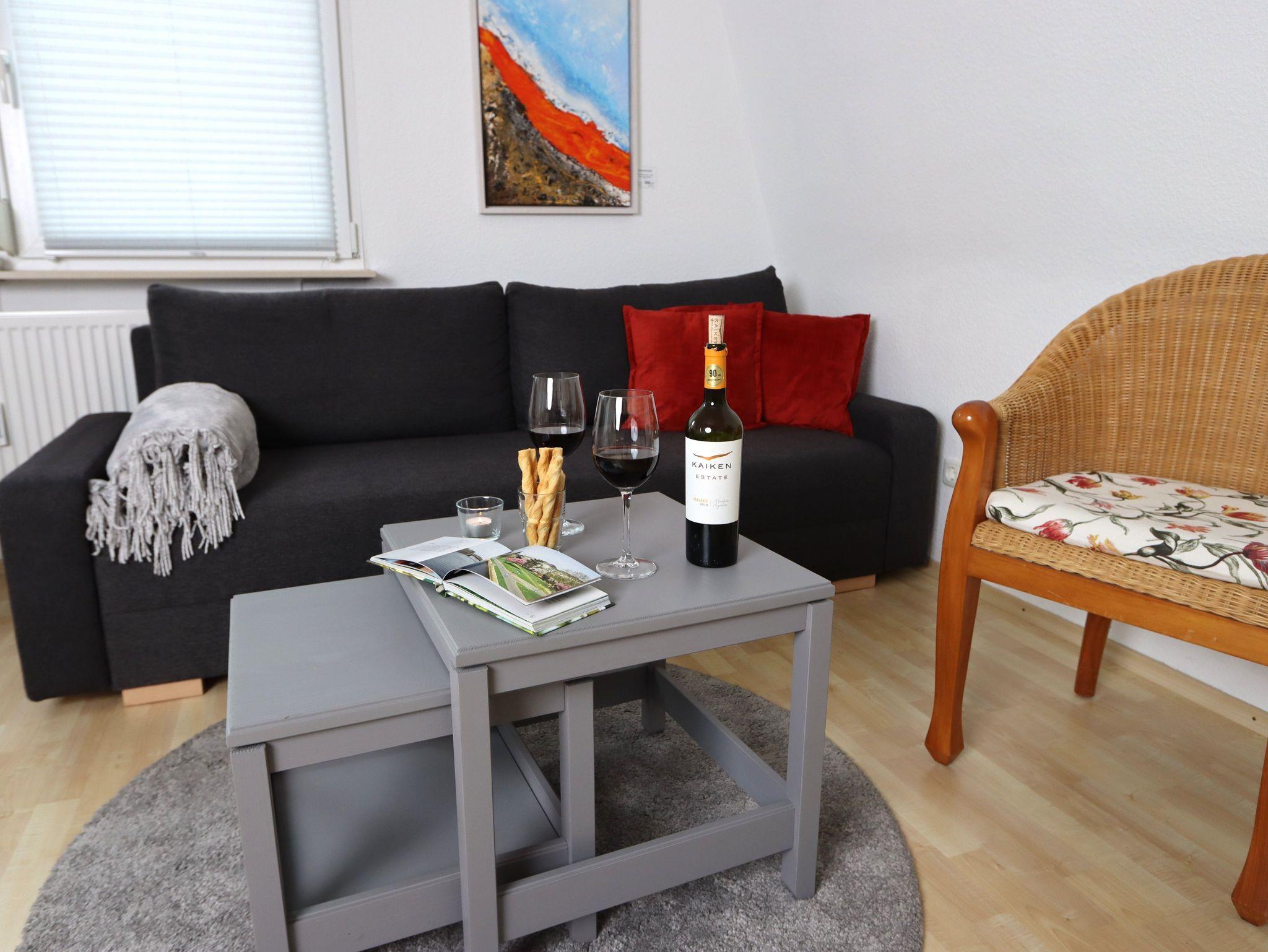 Die helle FEWO Marie befindet sich in der ersten Etage. Die Wohnküche ist perfekt ausgestattet und lässt keine Wünsche offen. Spülmaschine, Mikrowelle, Backofen, Cerankochfeld, Kaffeemaschine und viele Geräte mehr tragen zu einem entspannten Aufenthalt bei. Kaffee/Tee und ein Willkommens-Getränk sowie ein Obstkorb stehen bereit. Das Wohnzimmer verfügt über eine Schlafcouch, gemütliche Sessel und einen Schreibtisch. Flachbild-Sat-TV, Multifunktionsgerät (MP3, CD, Radio, USB-Anschluss), Bücher und eine Gästemappe mit Ausflugszielen und Informationen zur Wohnung, Umgebung, Restaurants und z.B. Supermärkten finden sie dort.