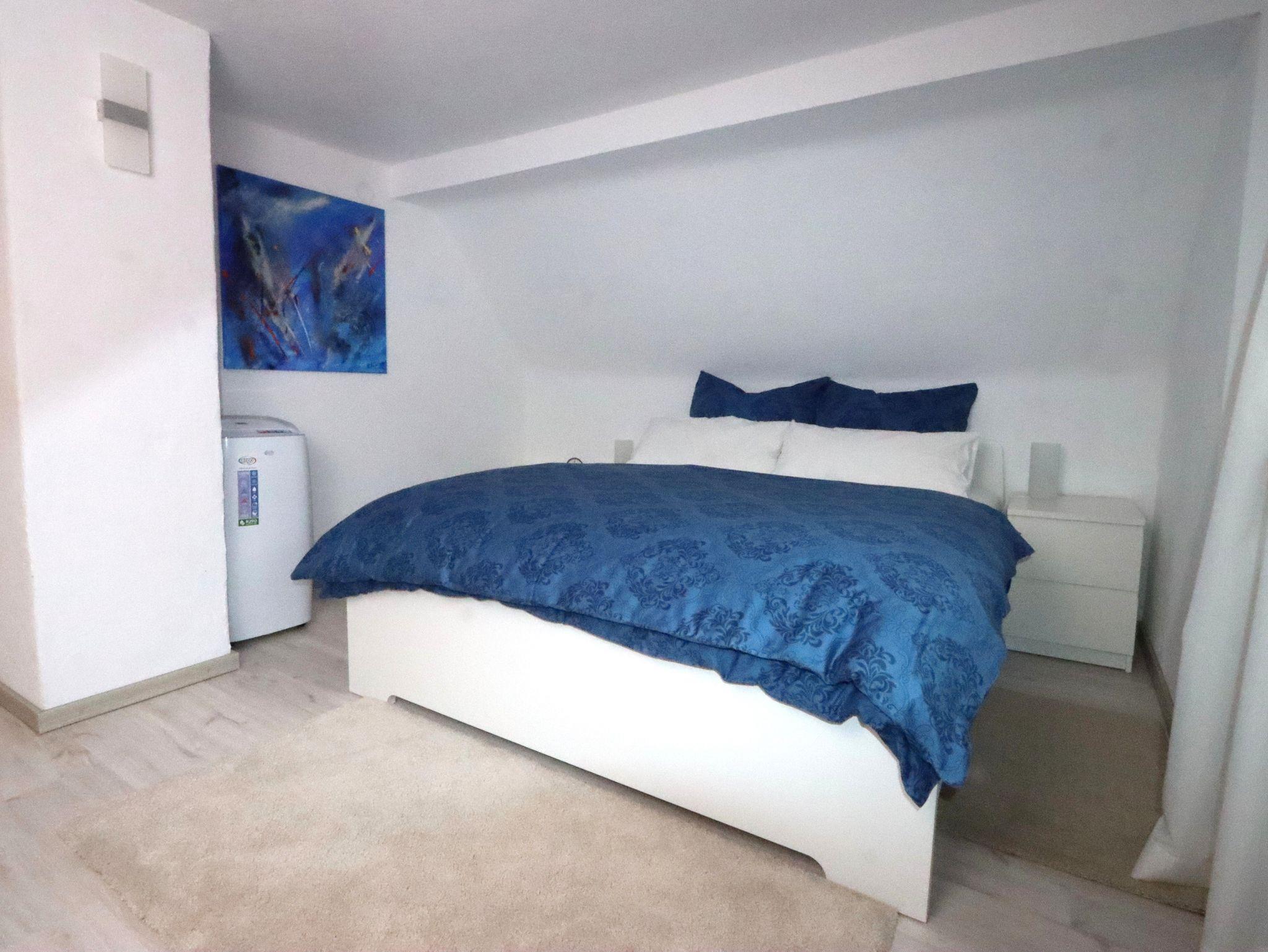 Im Flur befindet sich die Garderobe, Schuhschrank und der Türöffner mit Gegensprechanlage. Von hier aus gelangt man über eine Treppe ins Dachgeschoss zum Schlafzimmer mit Doppelbett, Klimaanlage und einem geräumigen Einbauschrank mit Safe.