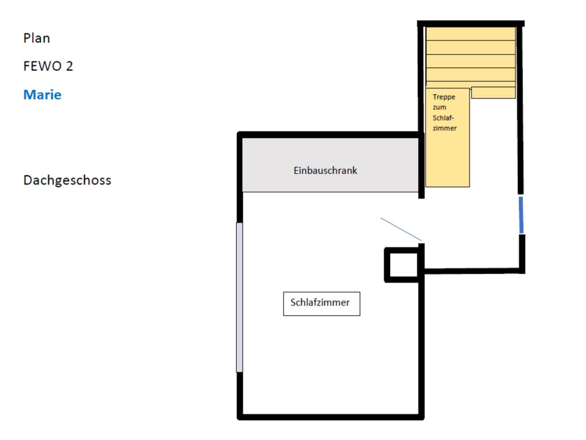 Die große und freundliche FEWO Marie erstreckt sich über die erste Etage (Wohnzimmer, Wohn-Küche und Bad) und das Dachgeschoss (Schlafzimmer mit Air-Condition). Geeignet ist die Ferienwohnung für 2 (plus 2) Personen. Die Größe beträgt 70 m².