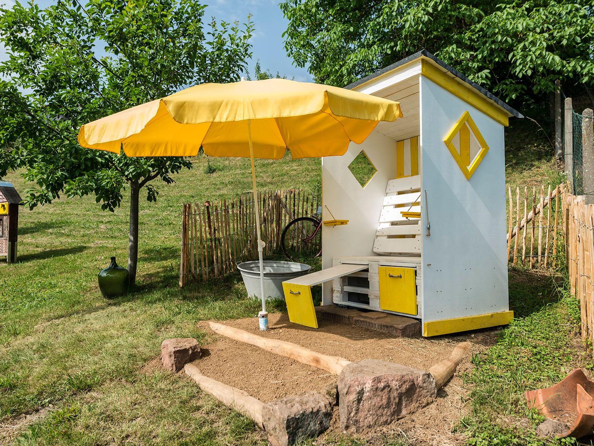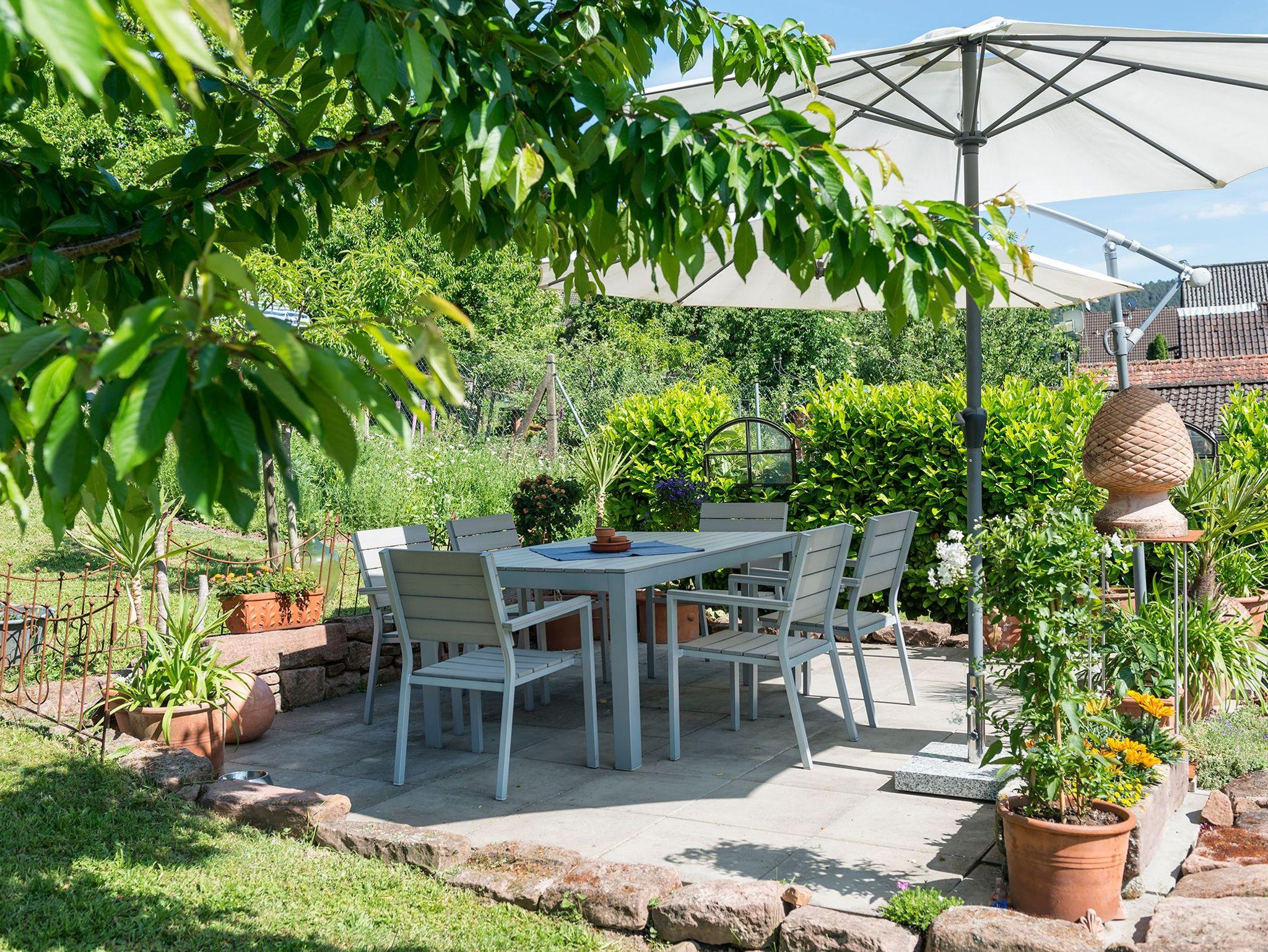 Zur Wohnung gehört ein eigener Gartenbereich mit Gartenmöbeln, auch Liegestühlen, Grill, Gartendusche, Sonnenschirm und Spielsachen.