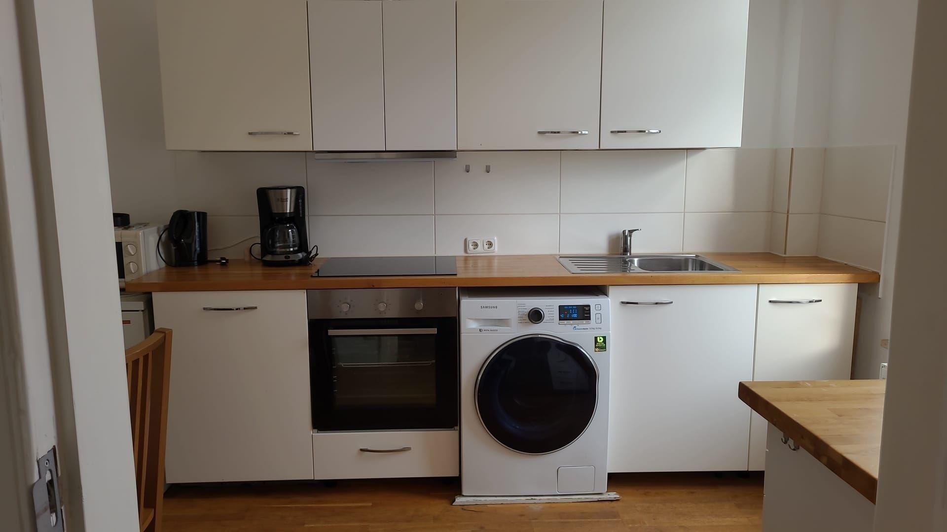 In der Küche stehen Ihnen ein Ceranherd, ein Backofen, ein Geschirrspüler, eine Waschmaschine, ein Kühlschrank, eine Kaffeemaschine, ein Wasserkocher sowie ausreichend Geschirr zur Verfügung.