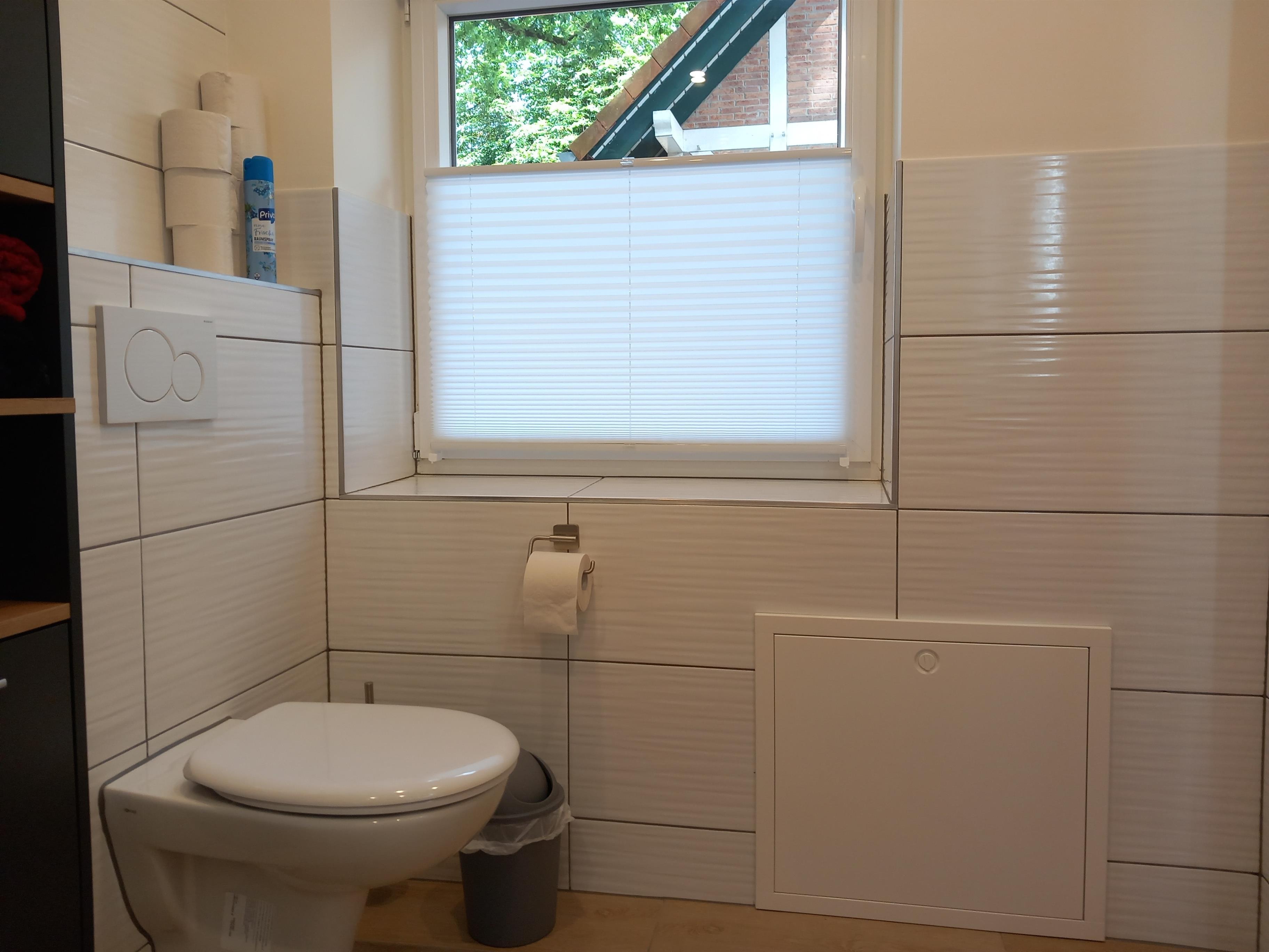 Das schöne Badezimmer harmoniert in hellen Farbtönen. Hier wurde eine barrierefreie Dusche integriert. Ein Badezimmerschrank sorgt für Ordnung der Reiseutensilien.