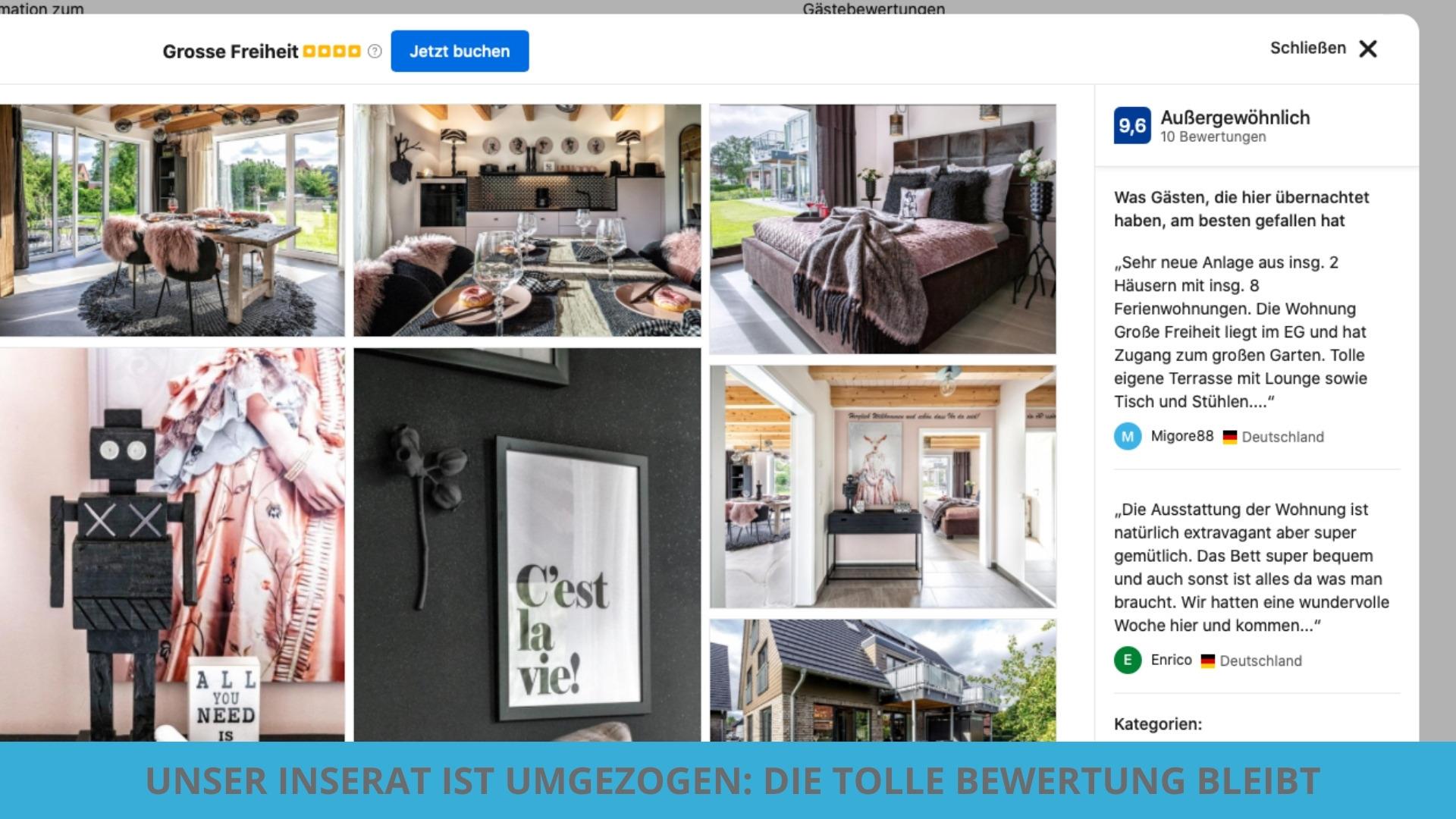 Die Ferienwohnung "GROSSE FREIHEIT" von der prämierten Designerin Anke Lachmuth ( www.ilovehome.de ) ist wirklich etwas besonders. Wer einmal fern ab vom Standart Urlaub machen möchte ist hier genau richtig. Stilvolle hochwertige Möbel laden zur Gemütlichkeit ein und ruhiger Schlaf ist garantiert.