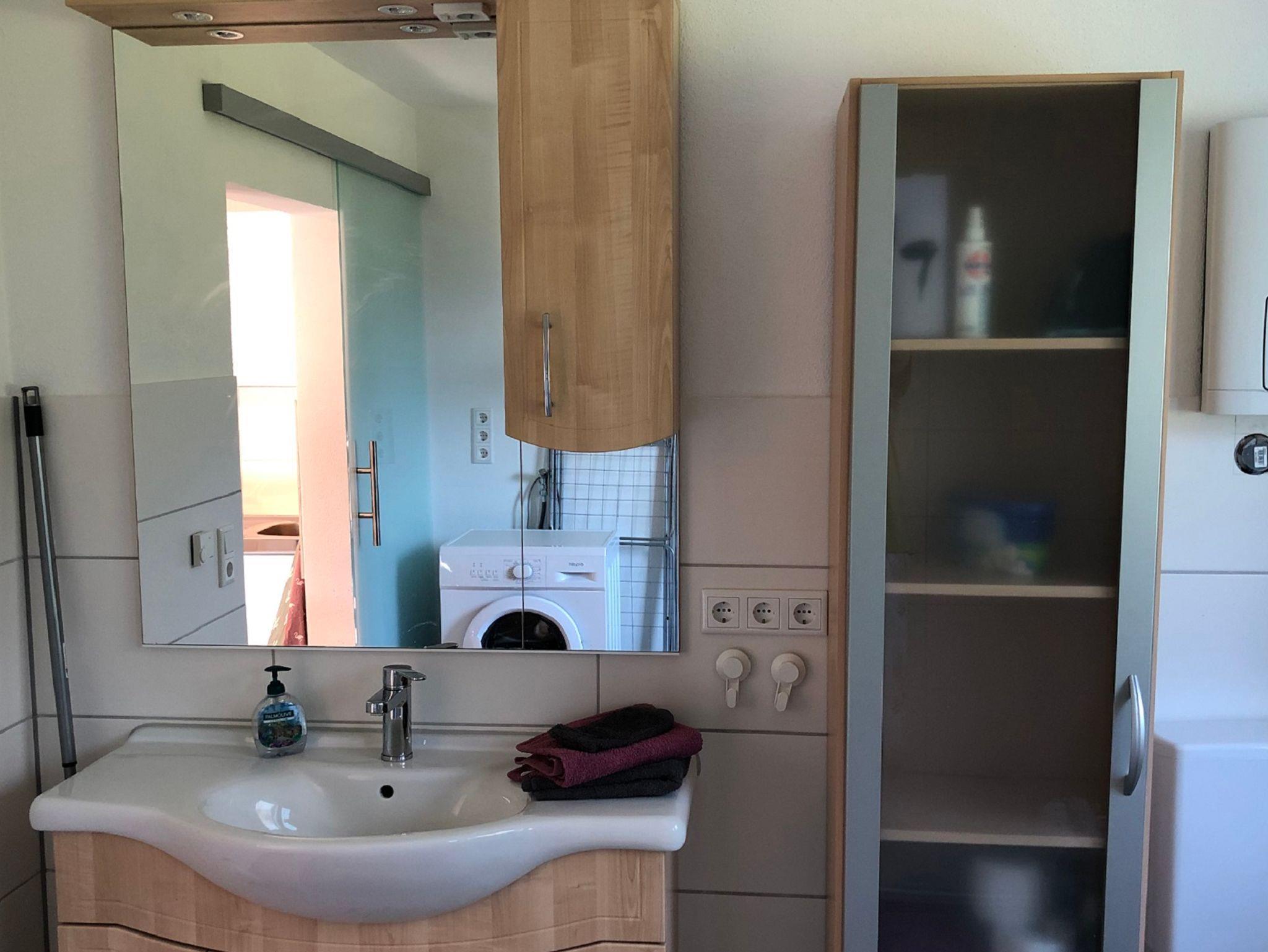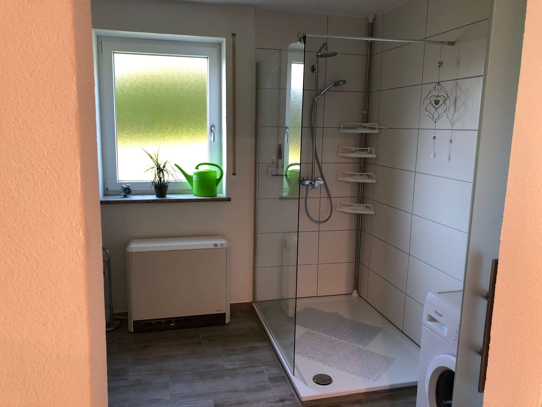 Das Bad mit einer barrierefreien und großräumigen Dusche sowie Waschbecken und einem erhöhten WC-Sitz kann über eine Glasschiebetüre betreten werden. Föhn, Handtücher und diverse Badutensilien werden gestellt. Eine Waschmaschine sowie ein Standtrockner stehen zur Verfügung.