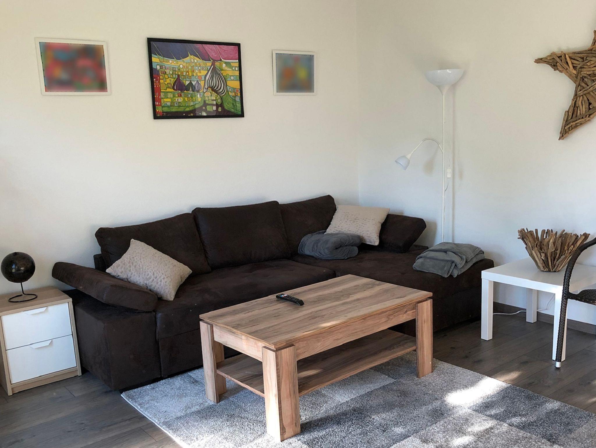 Das geräumige Wohnzimmer bietet mit einem Schlafsofa die Möglichkeit, dass zwei weitere Personen darauf schlafen können. Der Fernseher mit Satelliten-TV steht auf einer größeren Kommode die einigen Stauraum bietet. Zudem kann über eine Außentüre der Vorgarten vom Wohnzimmer aus direkt betreten werden.
