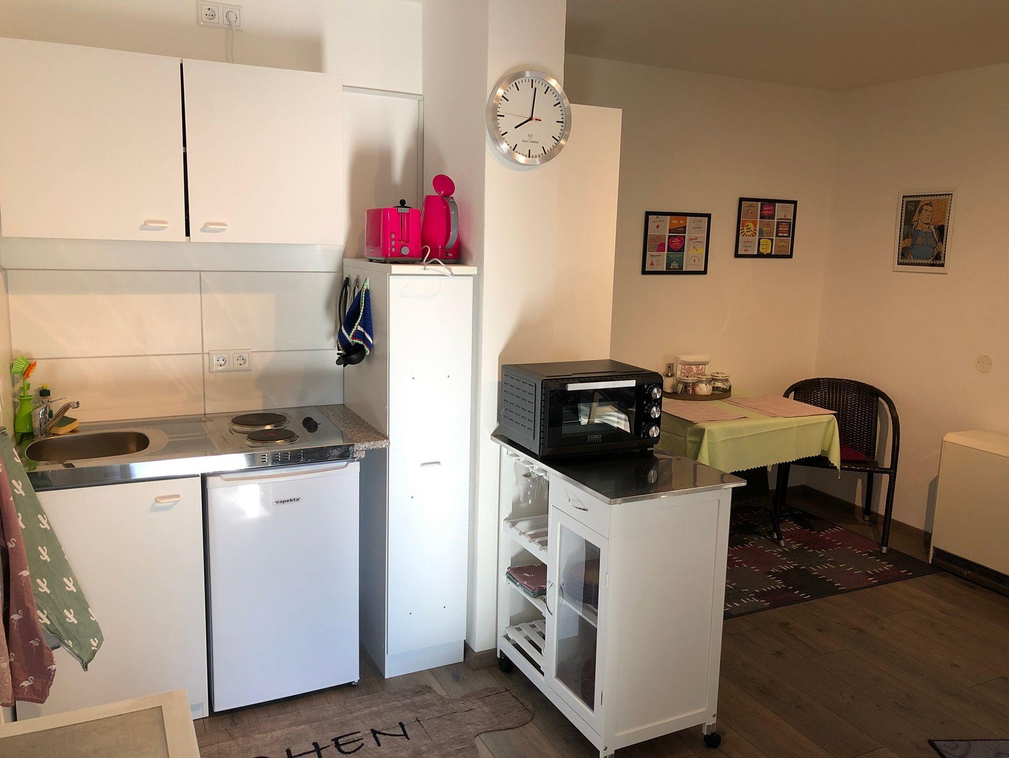 Die Küche mit Essecke ist das Erste was beim Betreten der Wohnung ins Auge fällt. Dabei ist die Küche mit zwei Herdplatten, einem Kühlschrank und einem kleinen Ofen ausgestattet. Ein Wasserkocher, eine Frenchpress und ein Toaster stehen ebenfalls bereit. Genügend Staufläche für Einkäufe oder Ablagemöglichkeiten sind vorhanden.