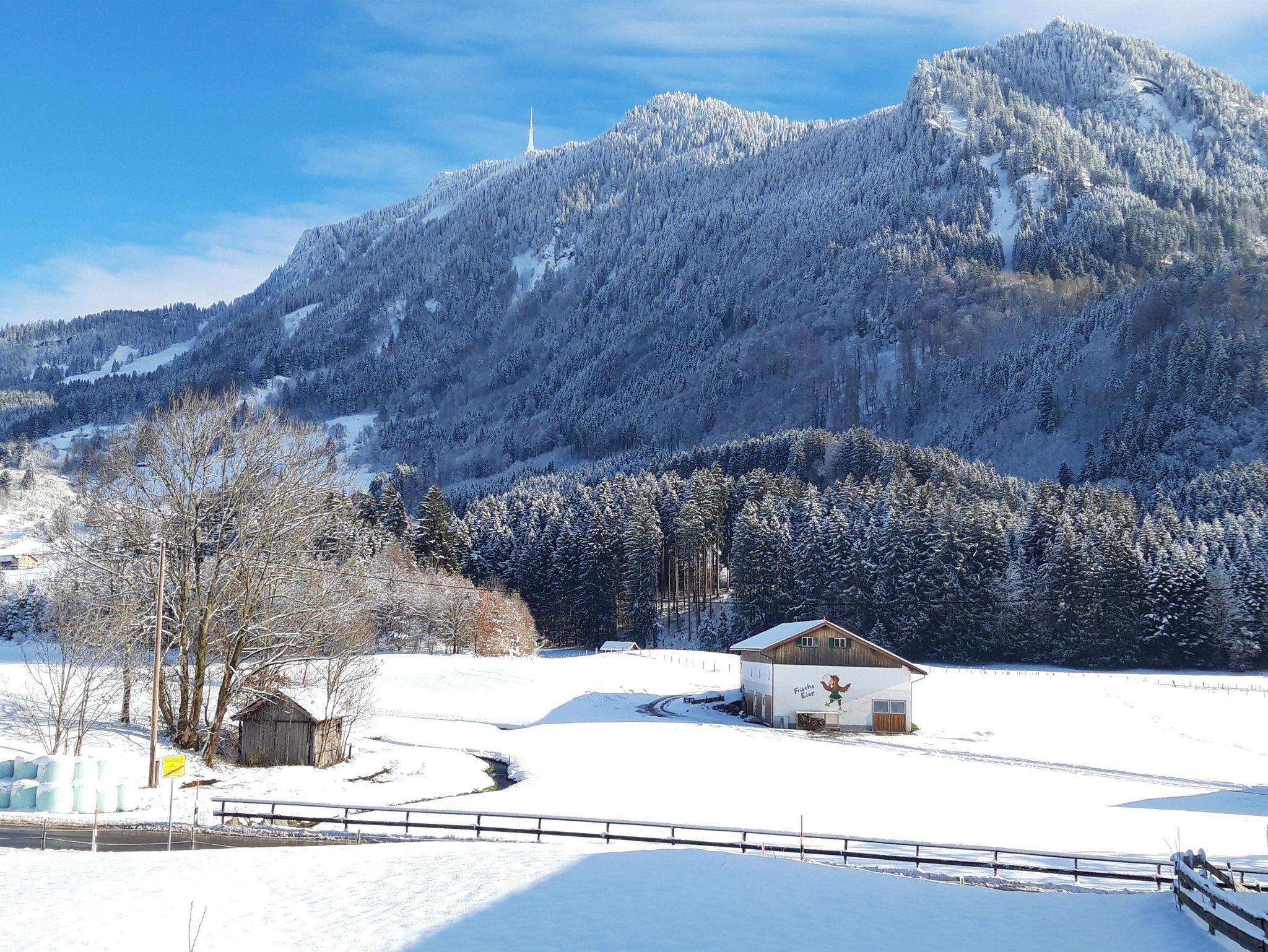 Aus der Wohnküche mit kleiner Spühlmaschine und Backofen, Eckbank und Sofa hat man einen schönen Blick in die Oberstdorfer Berge.