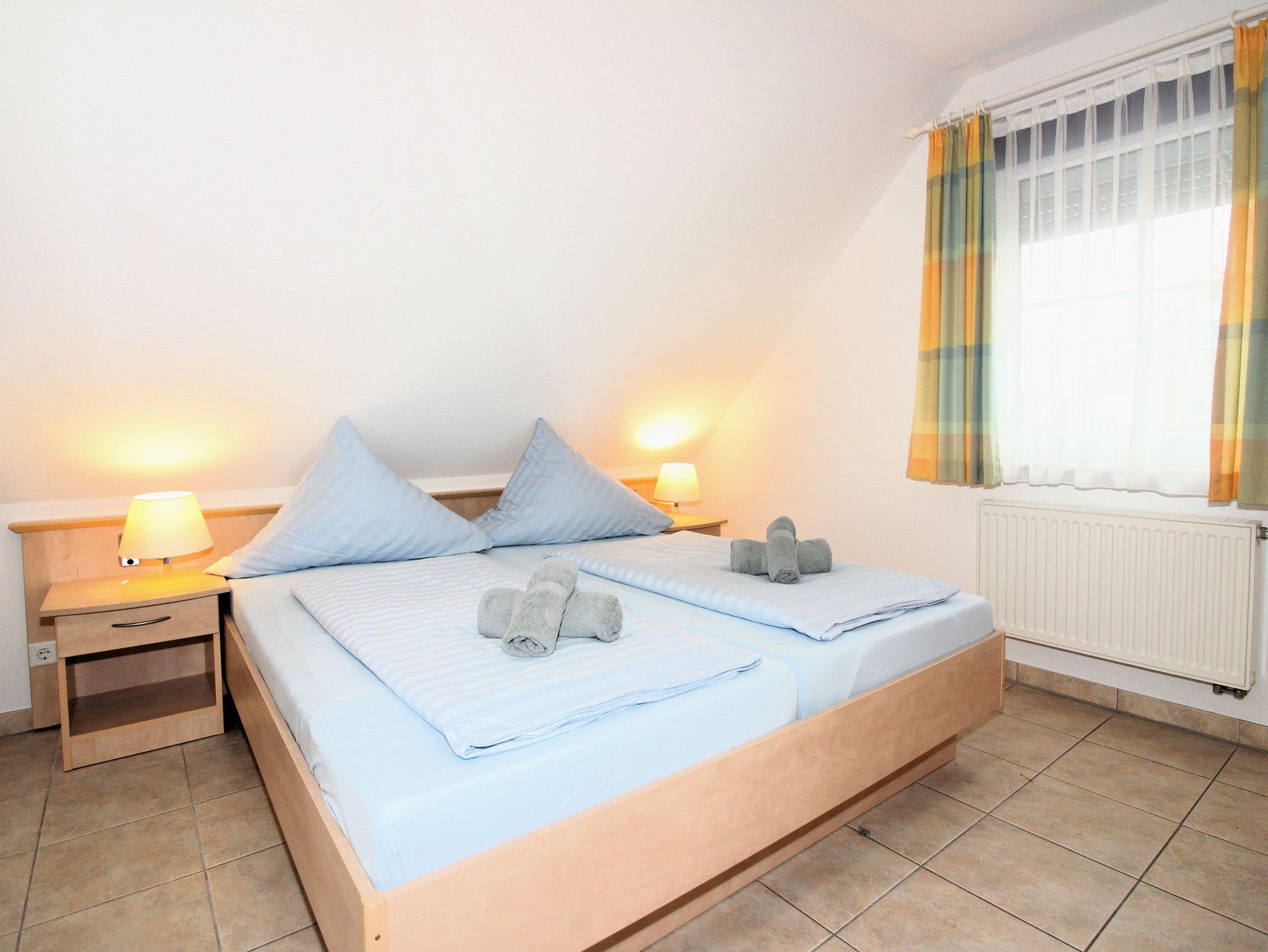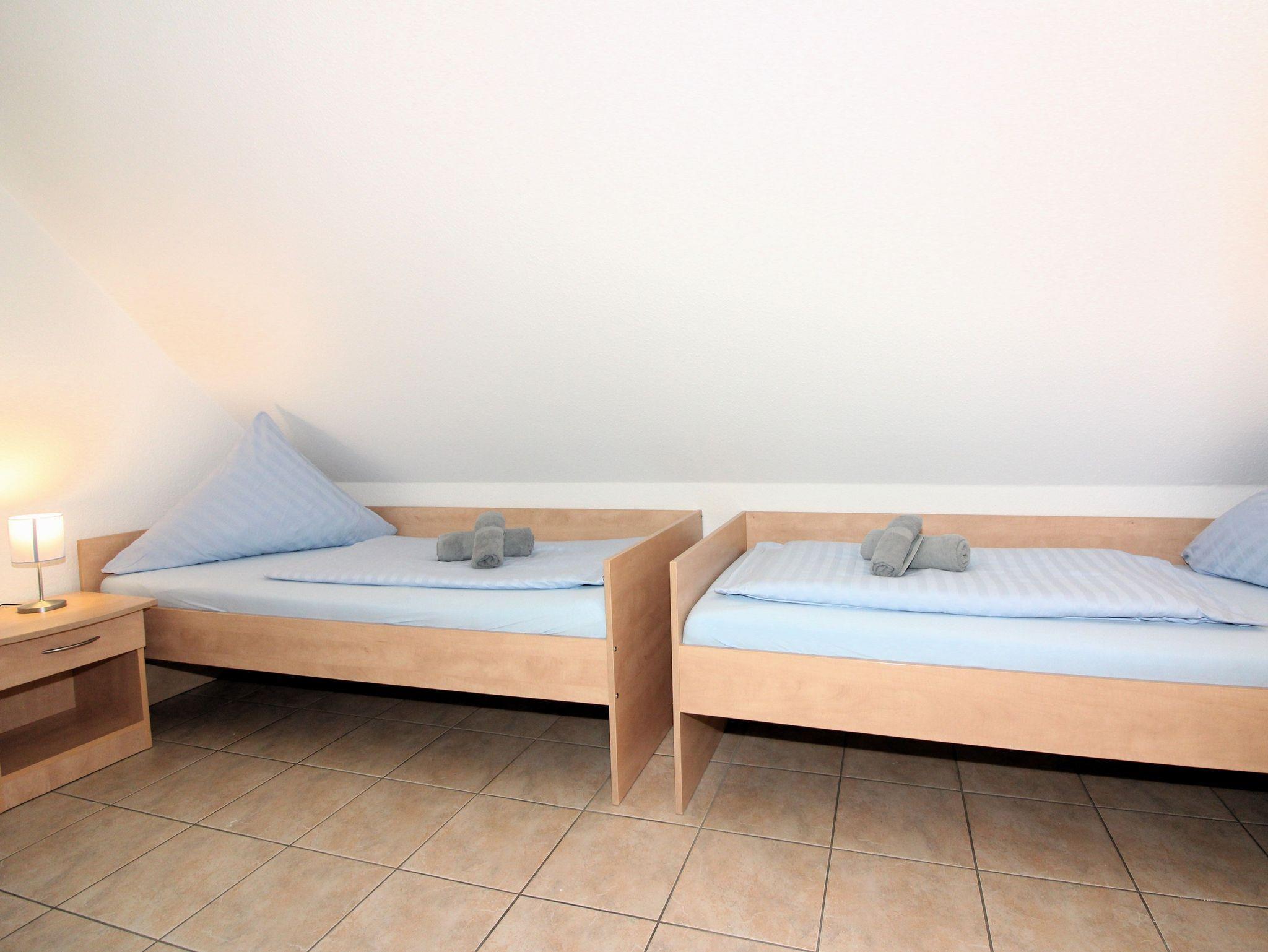 Im Obergeschoss befinden sich ein Schlafzimmer mit Doppelbett, ein Schlafraum mit zwei Einzelbetten und das Badezimmer.