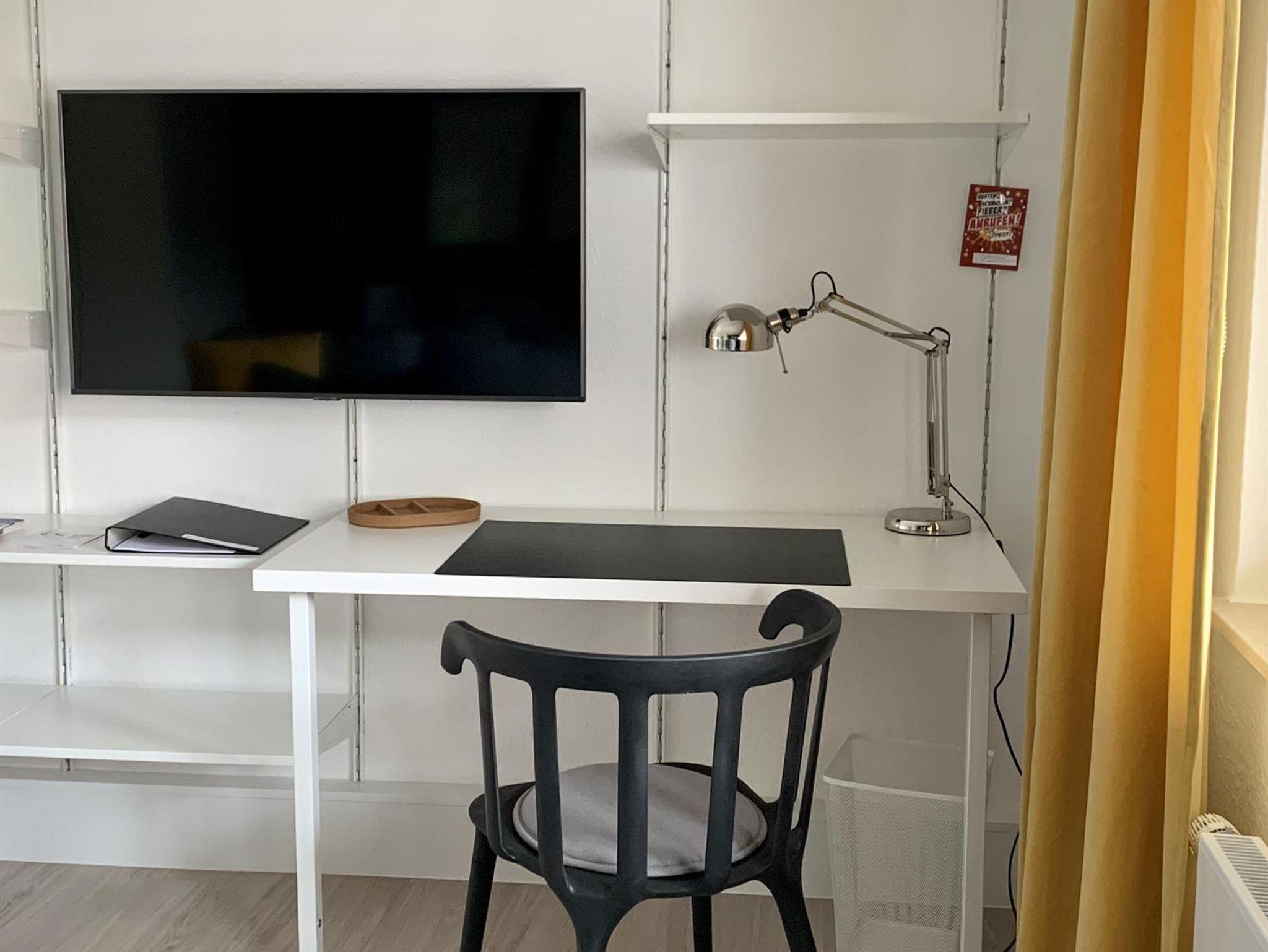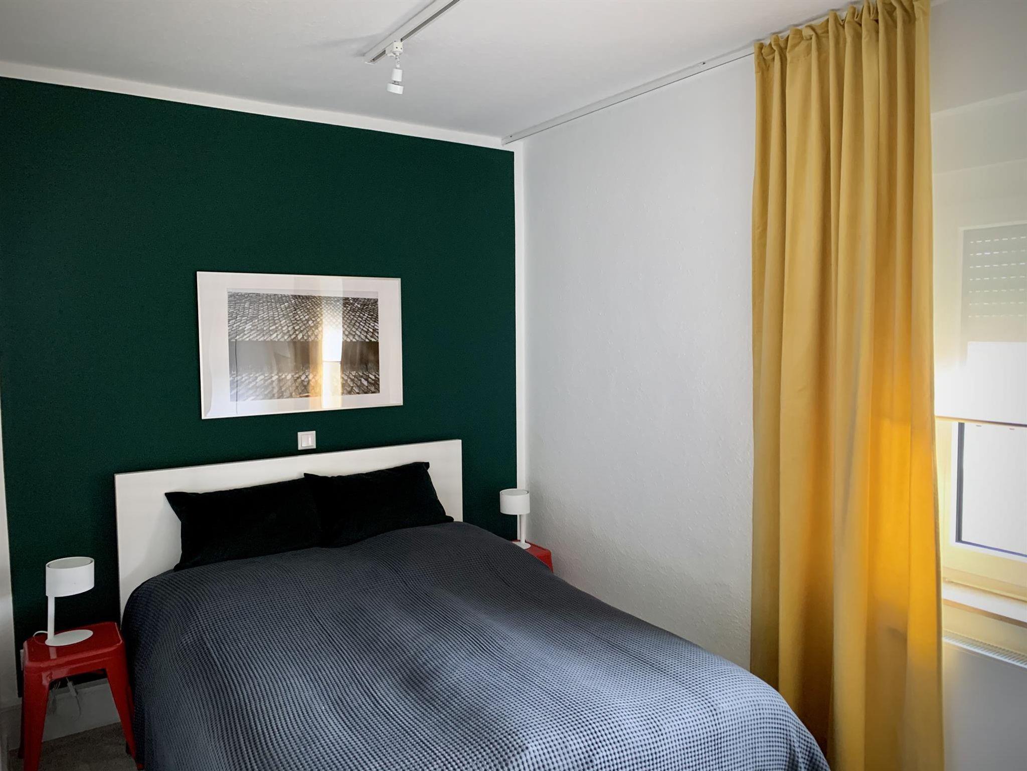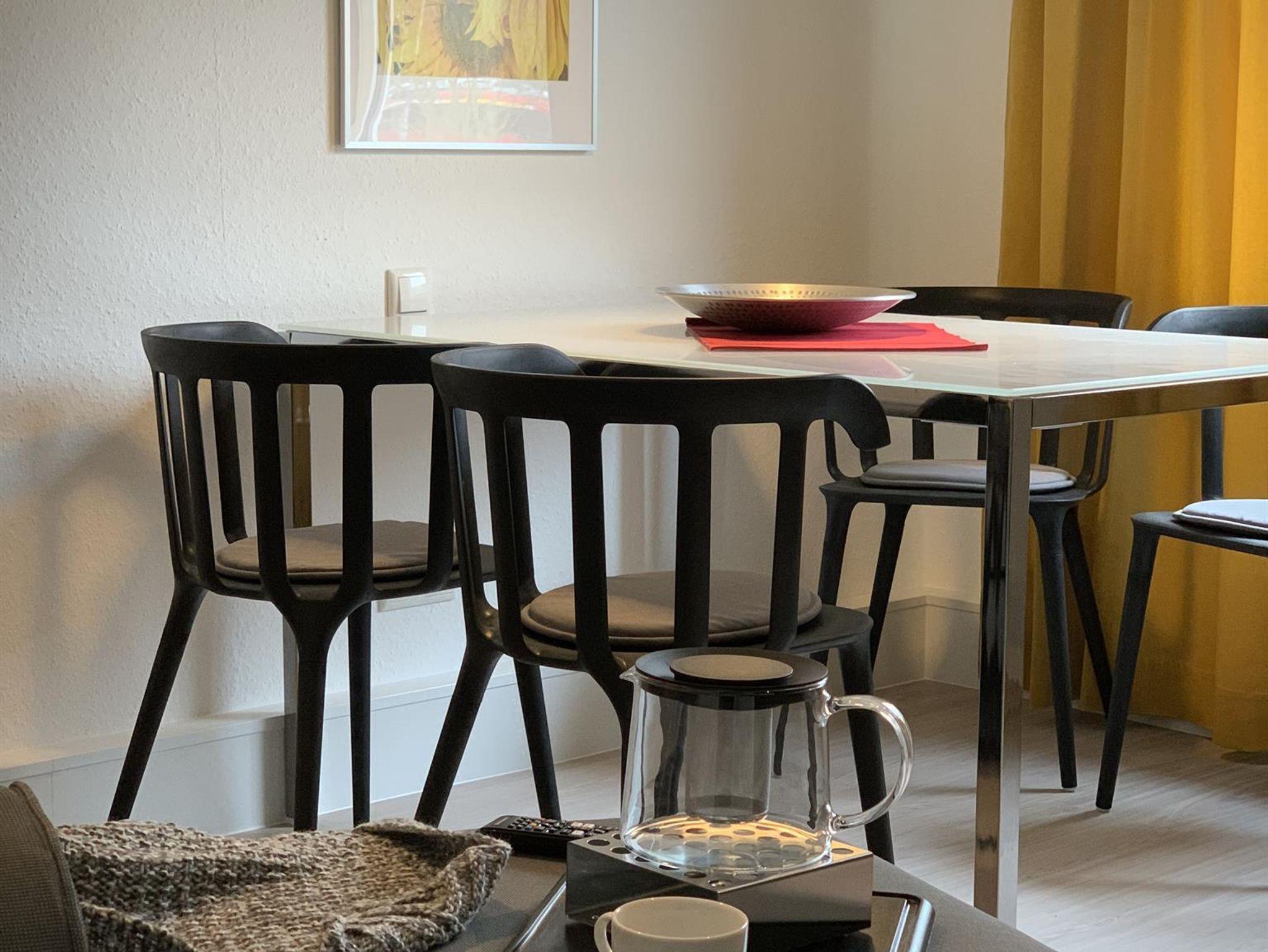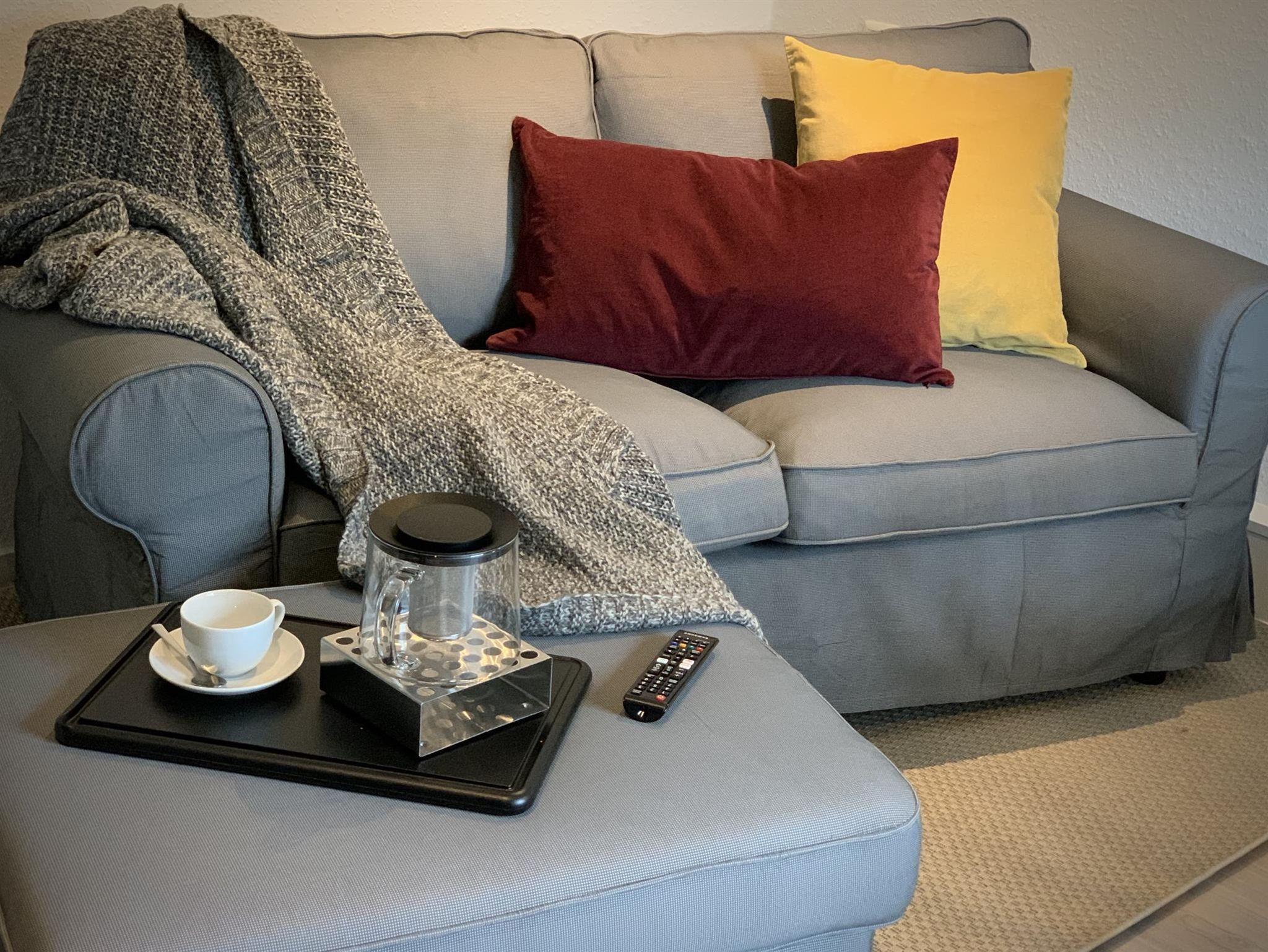 In Quadratmetern identisch mit Gastbereich 1, hier allerdings aufgeteilt auf zwei Zimmer und mittels Glas-Abschlusstür vom Rest der Wohnung getrennt. Im kleinen Schlafzimmer stehen ein französisches Bett (140 x 200 cm), zwei Nachttische mit Leseleuchten und ein Kleiderschrank. Für den letzten Check vor dem Start in den Tag gibt es einen Spiegel im Flur. Nebenan haben wir ein kleines Wohn-Arbeitszimmer eingerichtet. Auch hier kann man gemütlich auf einer Couch mit Fußhocker entspannen und fernsehen (55“ Flatscreen), am Arbeitsplatz die letzten Mails checken (kostenloses WLAN) oder aber mit bis zu vier Personen essen.
