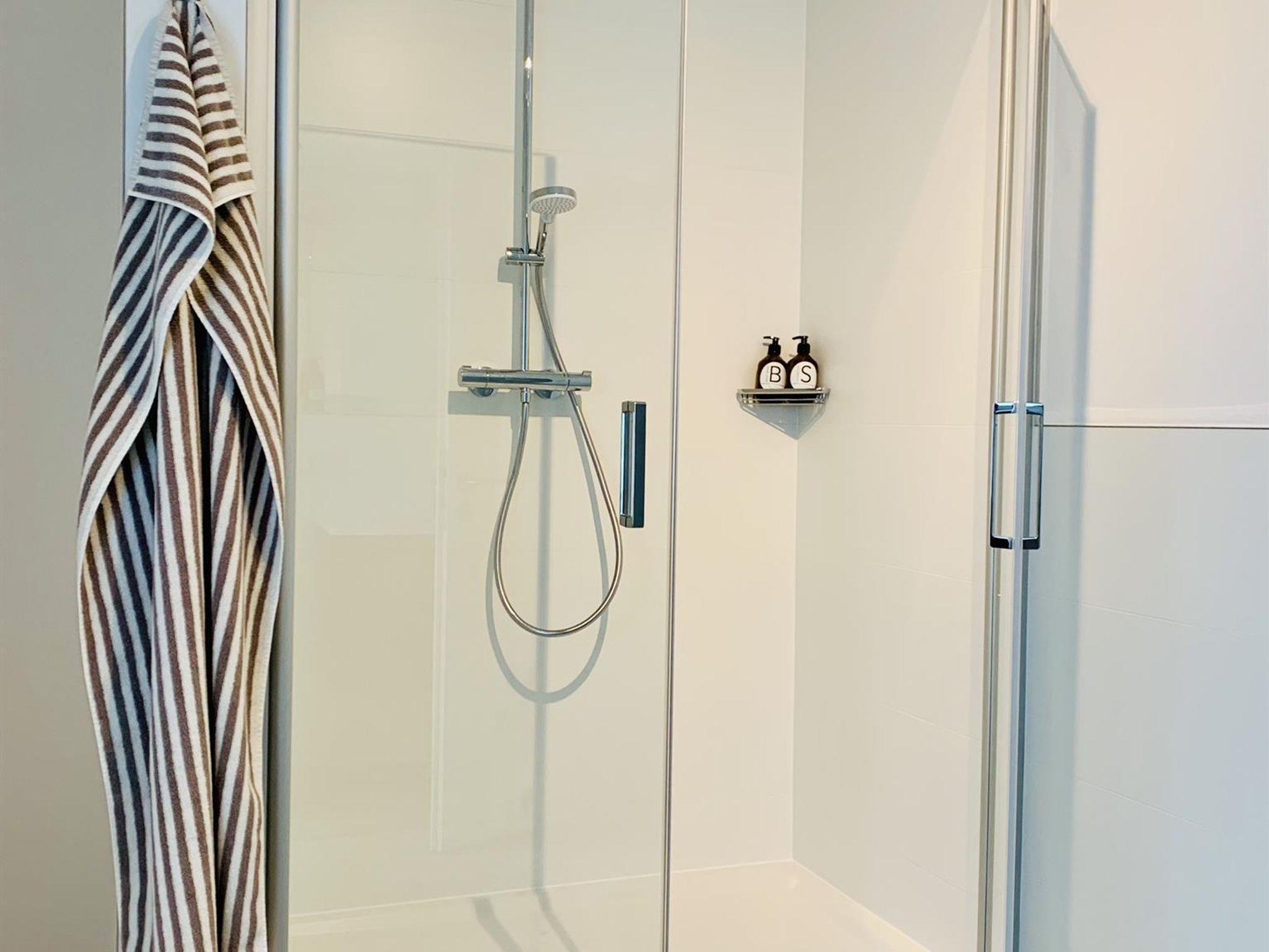 Das Bad bietet neben dem Waschtisch und einem wandhängenden Tiefspül-WC eine große Regen-Dusche (140 x 90 cm) mit Glastüren, einen Handtuch-Heizkörper, Haartrockner, Pflege-Artikel in Bio-Qualität und Handtücher in verschiedenen Größen.