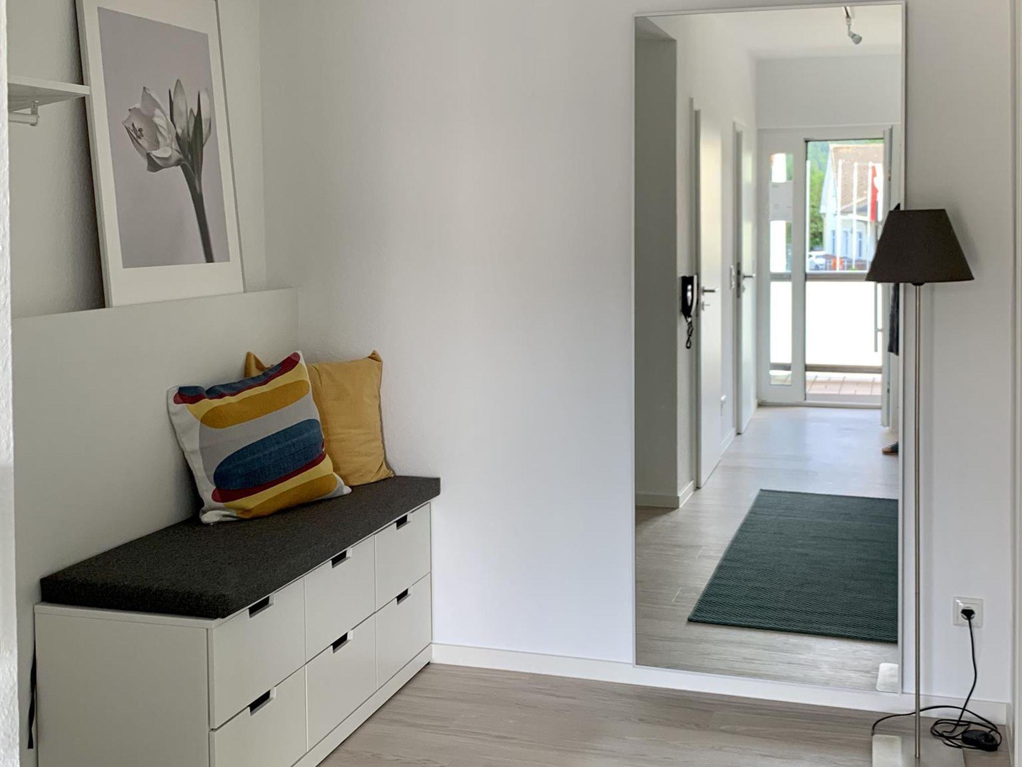 Eine Garderobe für Ihre Jacken und Mäntel, eine Ablage für nasse Schuhe, eine Sitzgelegenheit, sowie ein Ganz-Körper-Spiegel stehen bereit, um Sie entweder gut gelaunt in den Tag zu entlassen oder abends den ersten „Ballast“ abzunehmen.