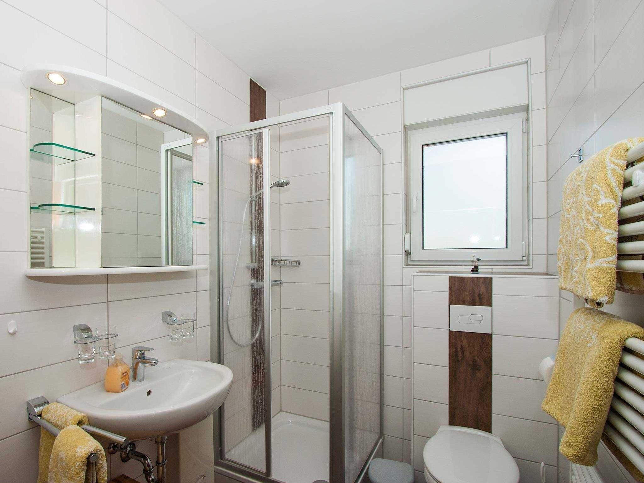 Das moderne Bad ist mit Dusche/WC, Fön, Kosmetikspiegel und einem Fenster ausgestattet.