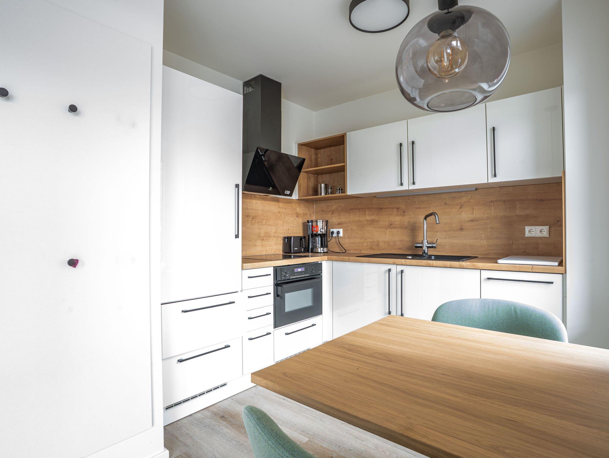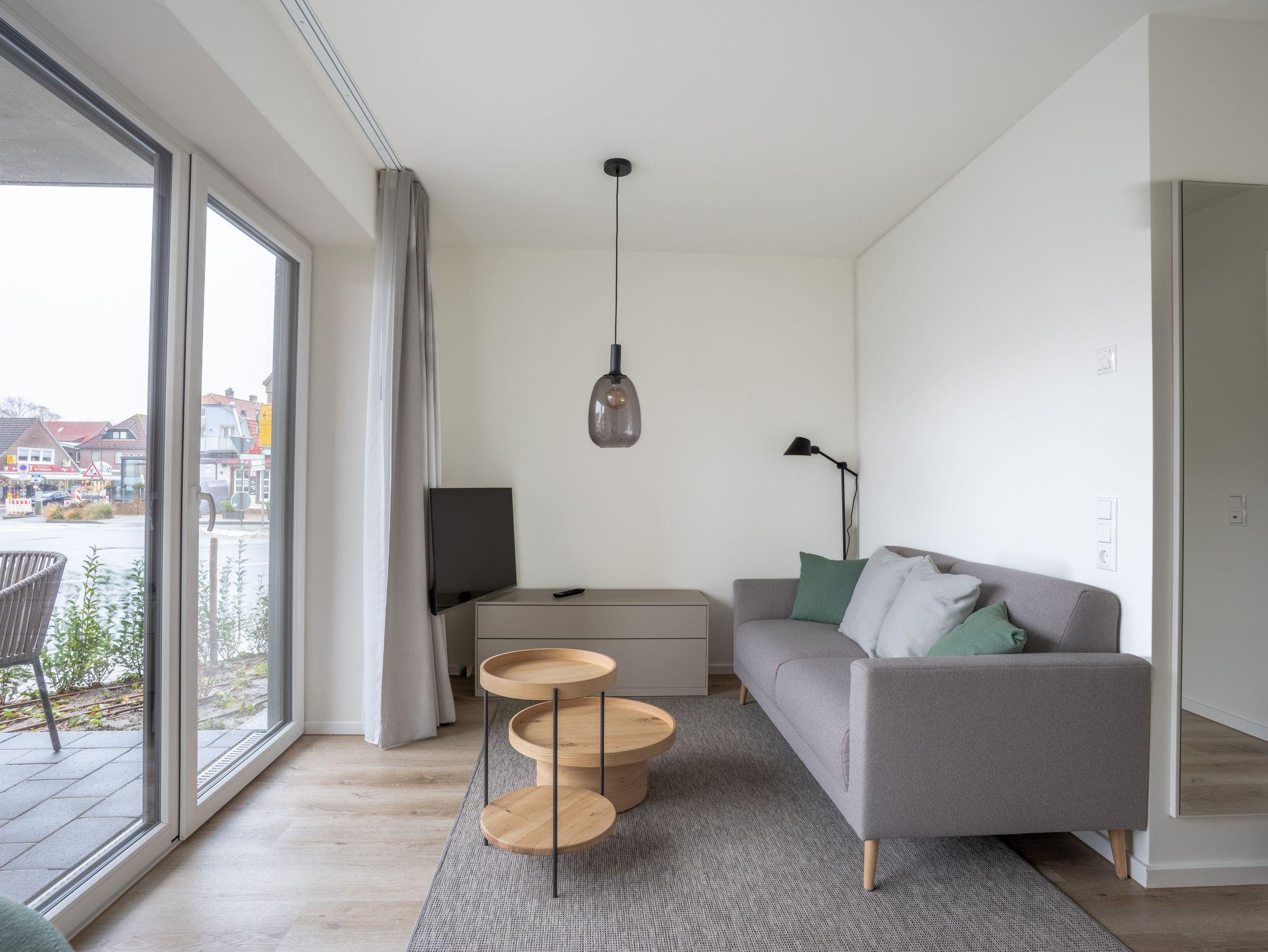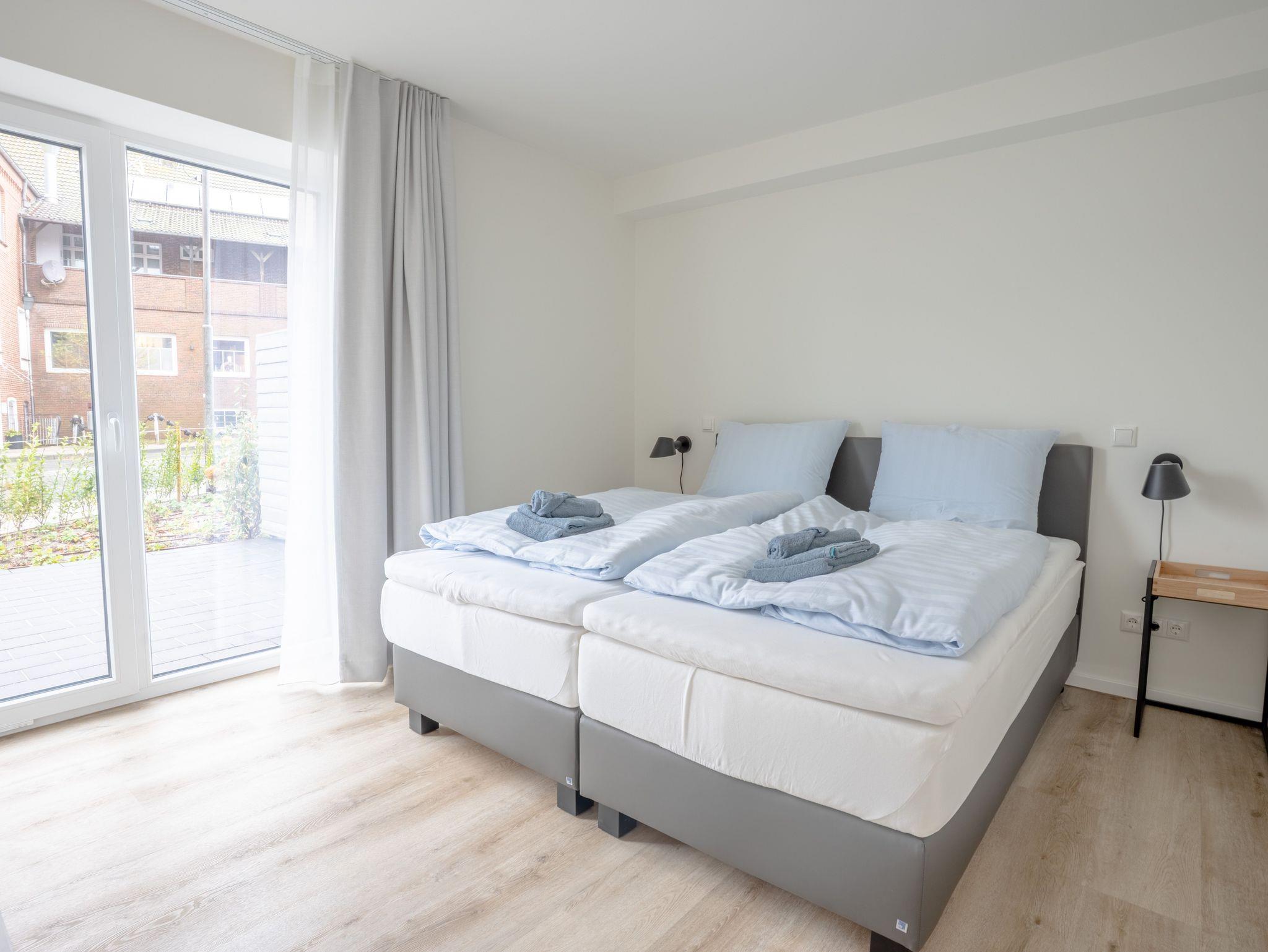 Auf ca. 44 m² bietet diese Erdgeschosswohnung einen hellen, offenen Wohn- und Essbereich mit voll ausgestatteter Küche. Zudem lädt die Ferienwohnung mit zwei Terrassen zum Frühstücken und Entspannen ein. Ideal für einen Nordseeurlaub als Paar.