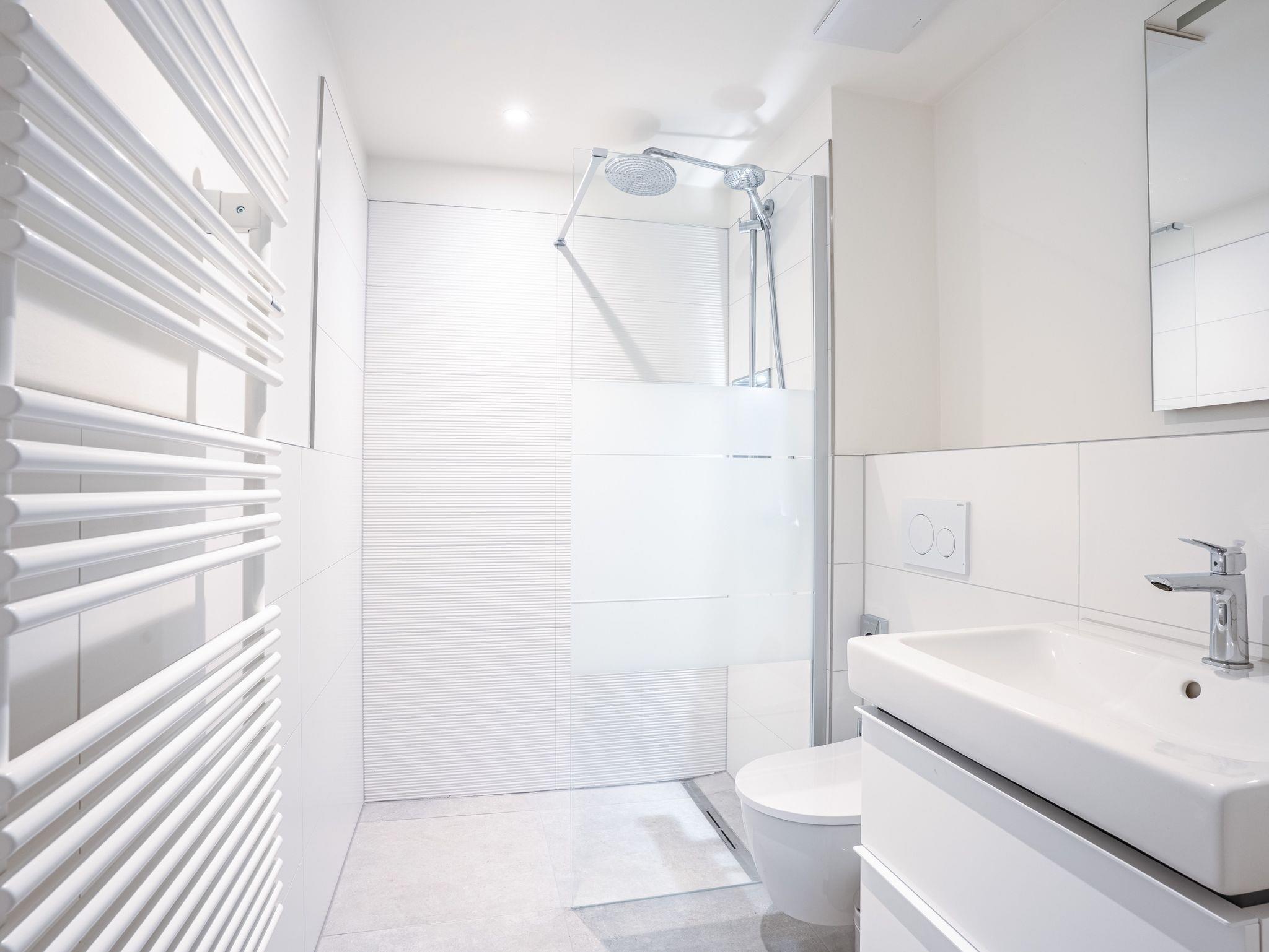Das Schlafzimmer mit einem Boxspringbett (180x200 cm) und TV sowie das moderne Badezimmer mit Dusche garantieren erholsame Nächte.