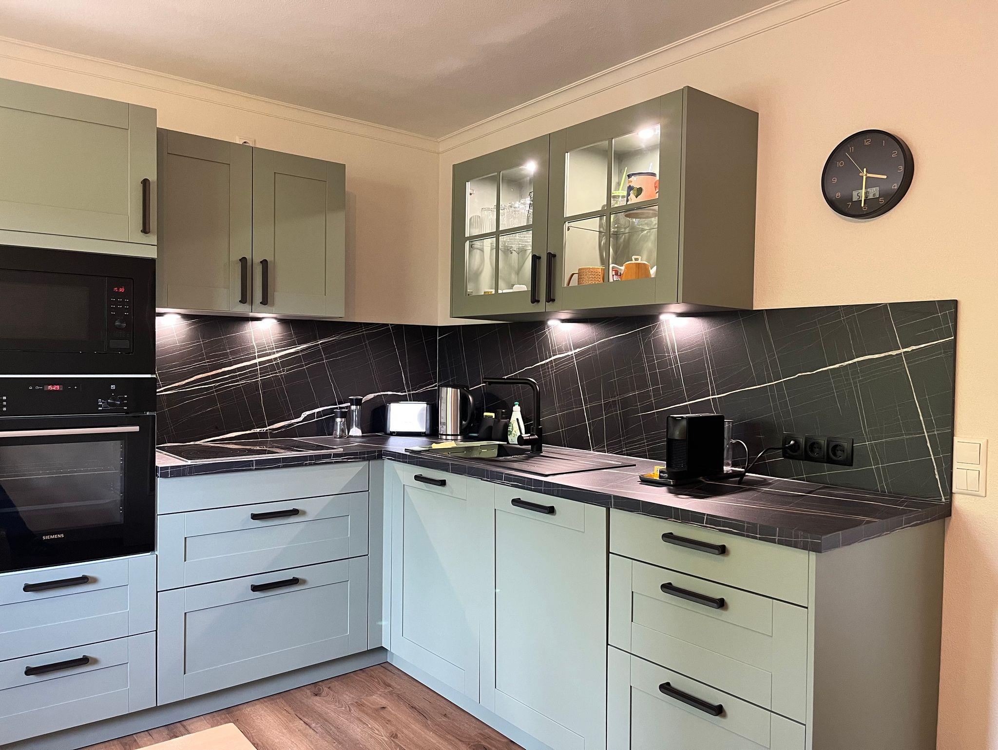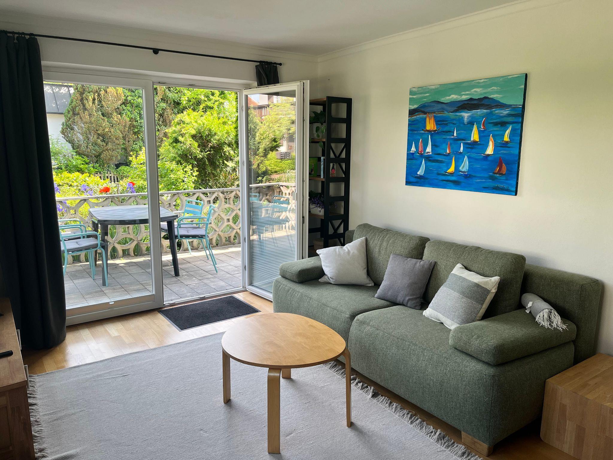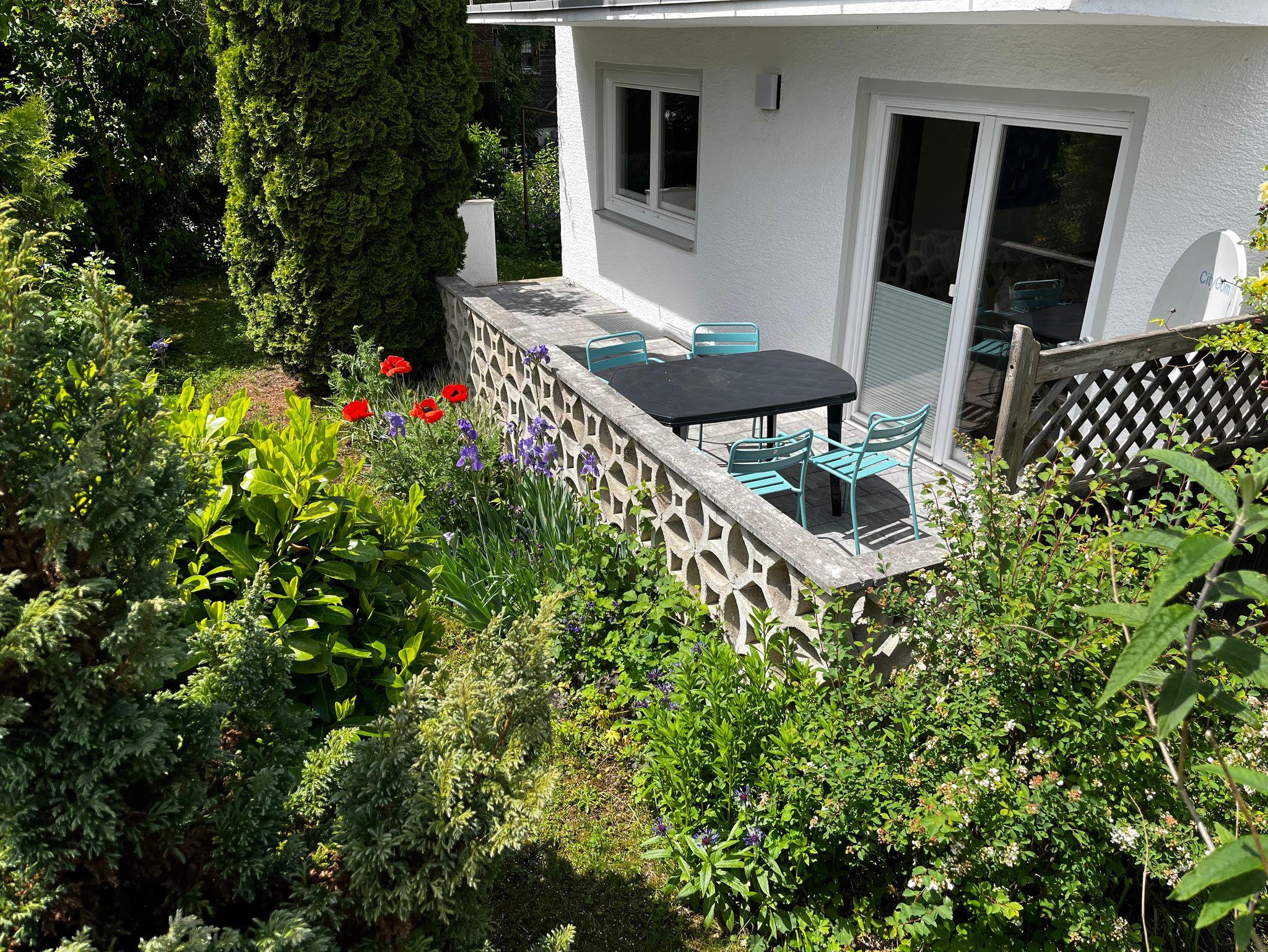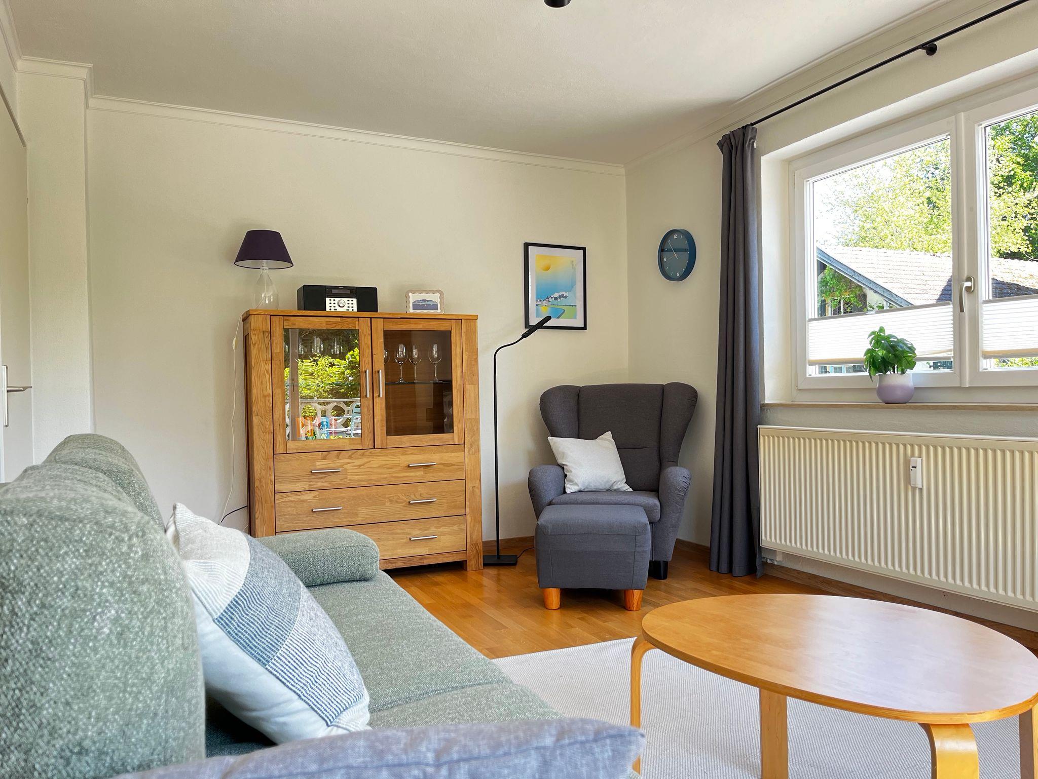 Die Ferienwohnung im Erdgeschoss für 2 bis 4 Erholungssuchende (Doppelbett, Schlafsofa, zusätzliches Kinderreisebett auf Anfrage) erreicht man über zwei Stufen. Sie bietet neben einem Essplatz in der voll ausgestatteten Küche eine halbschattige Terrasse mit Sitzgelegenheiten. Neben einem bequemen Sessel ist im Wohnzimmer eine gemütliche Couch, die zum Schlafsofa (Liegelänge 2,05m) umgebaut werden kann.