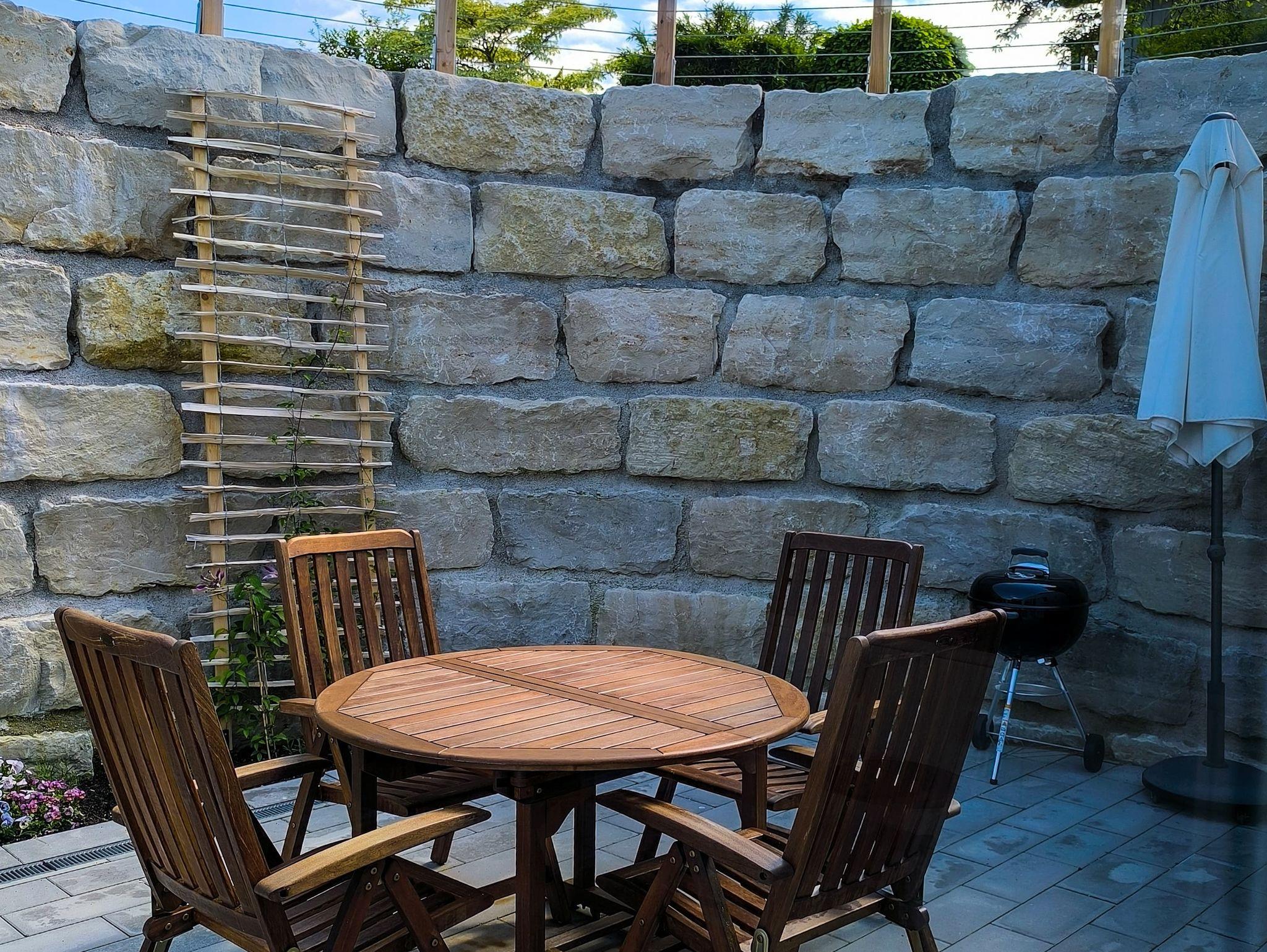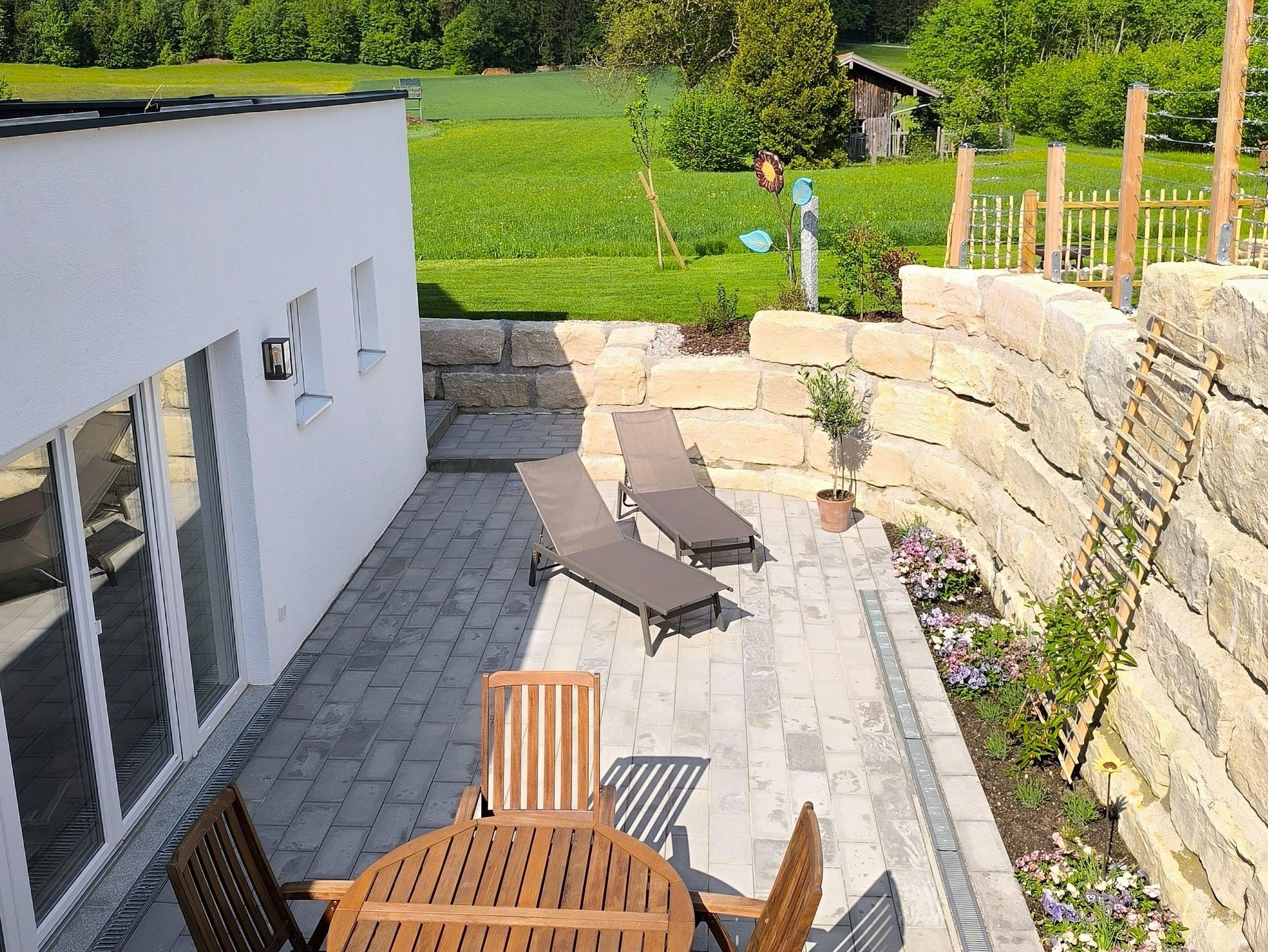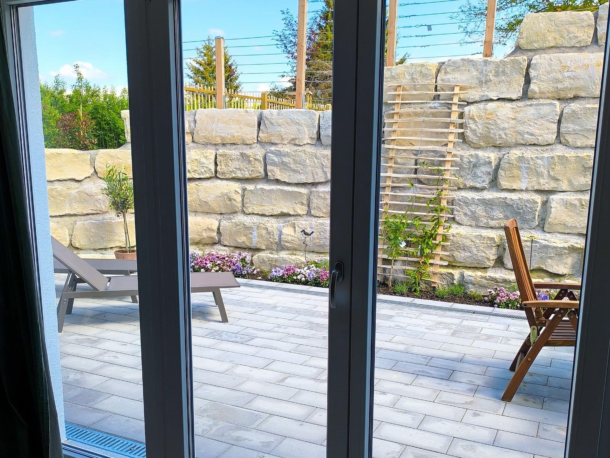 Durch die große Fensterfront gelangt man direkt auf die großflächige Terrasse, welche durch eine rustikale Steinmauer perfekt in Szene gesetzt wird. Die Terrasse ist nach Osten gelegen - ideal für das Frühstück mit Morgensonne.