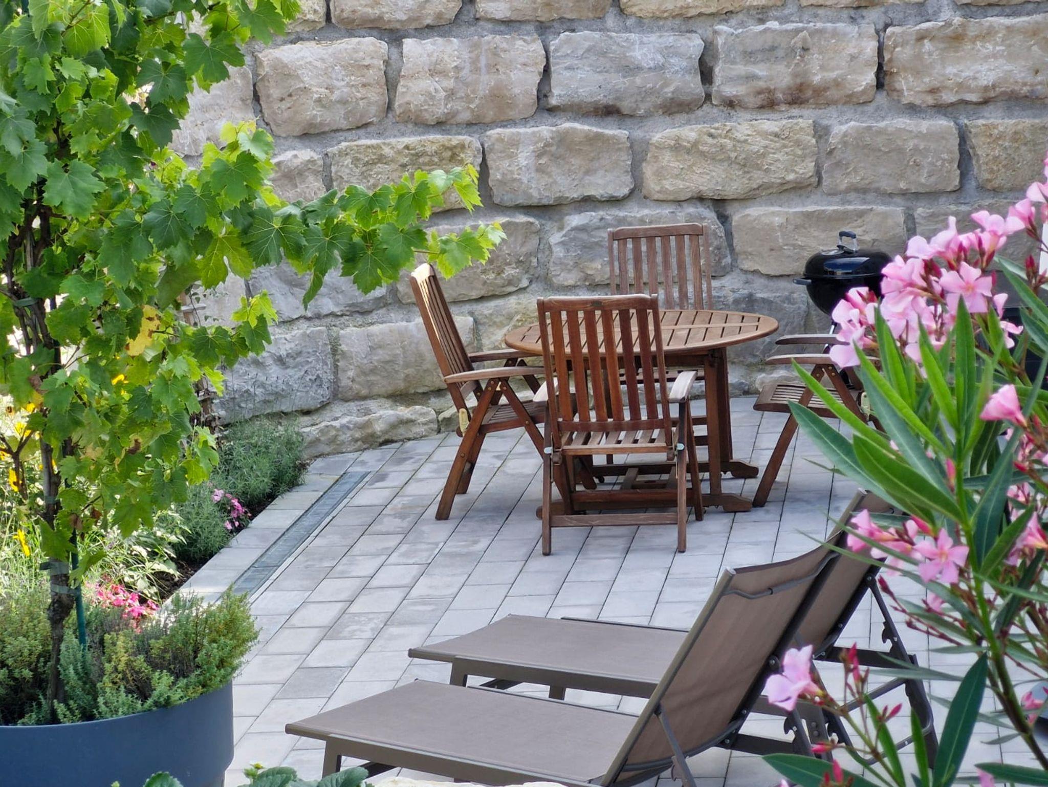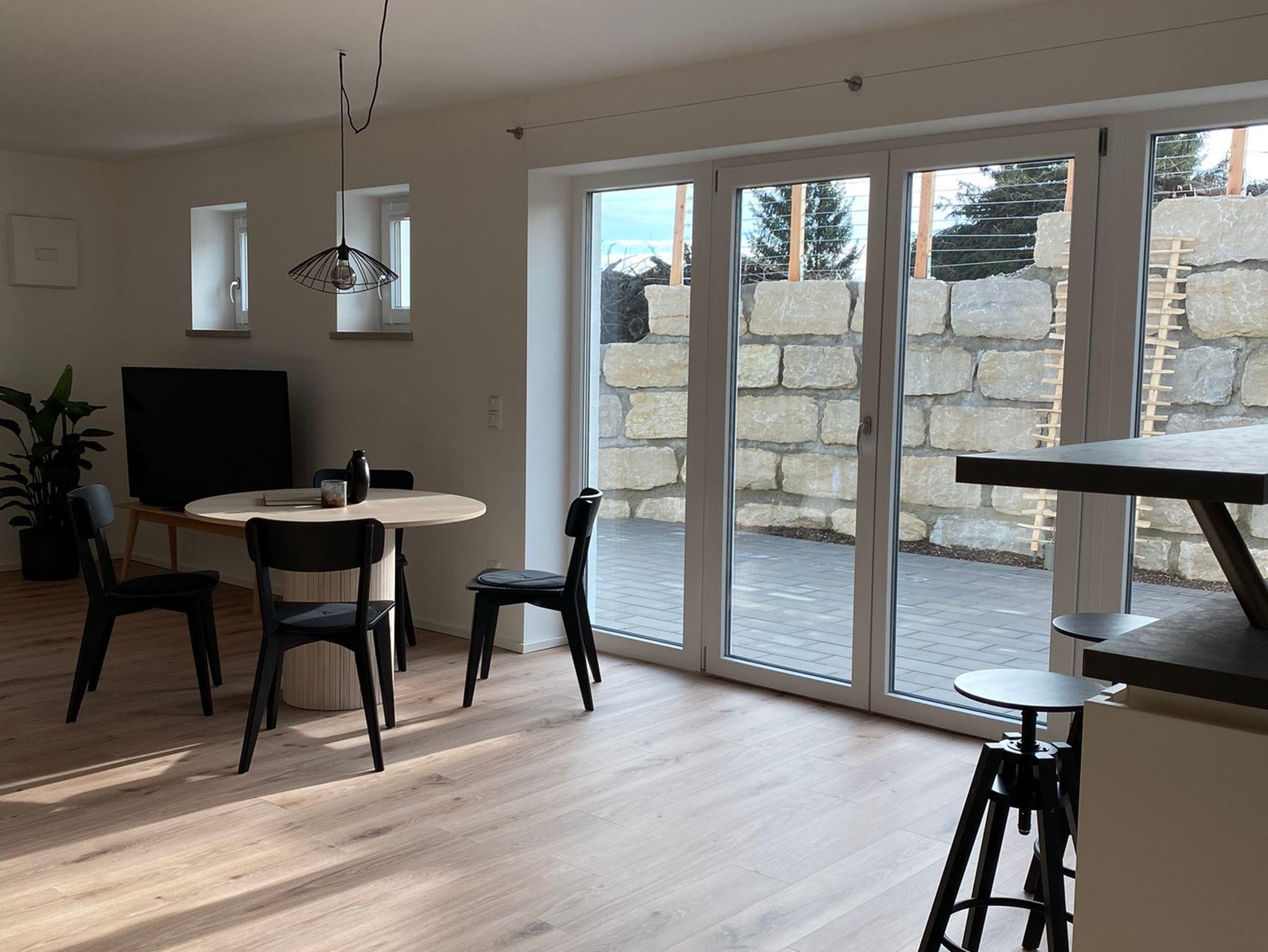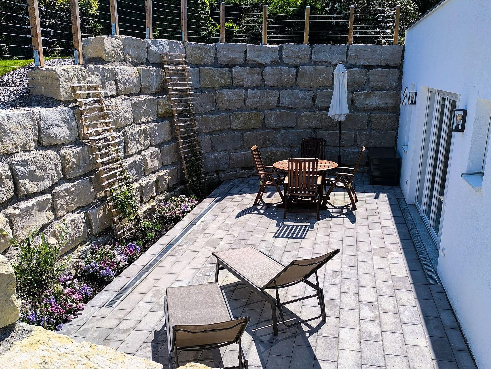 Durch die große Fensterfront gelangt man direkt auf die großflächige Terrasse, welche durch eine rustikale Steinmauer perfekt in Szene gesetzt wird. Die Terrasse ist nach Osten gelegen - ideal für das Frühstück mit Morgensonne.