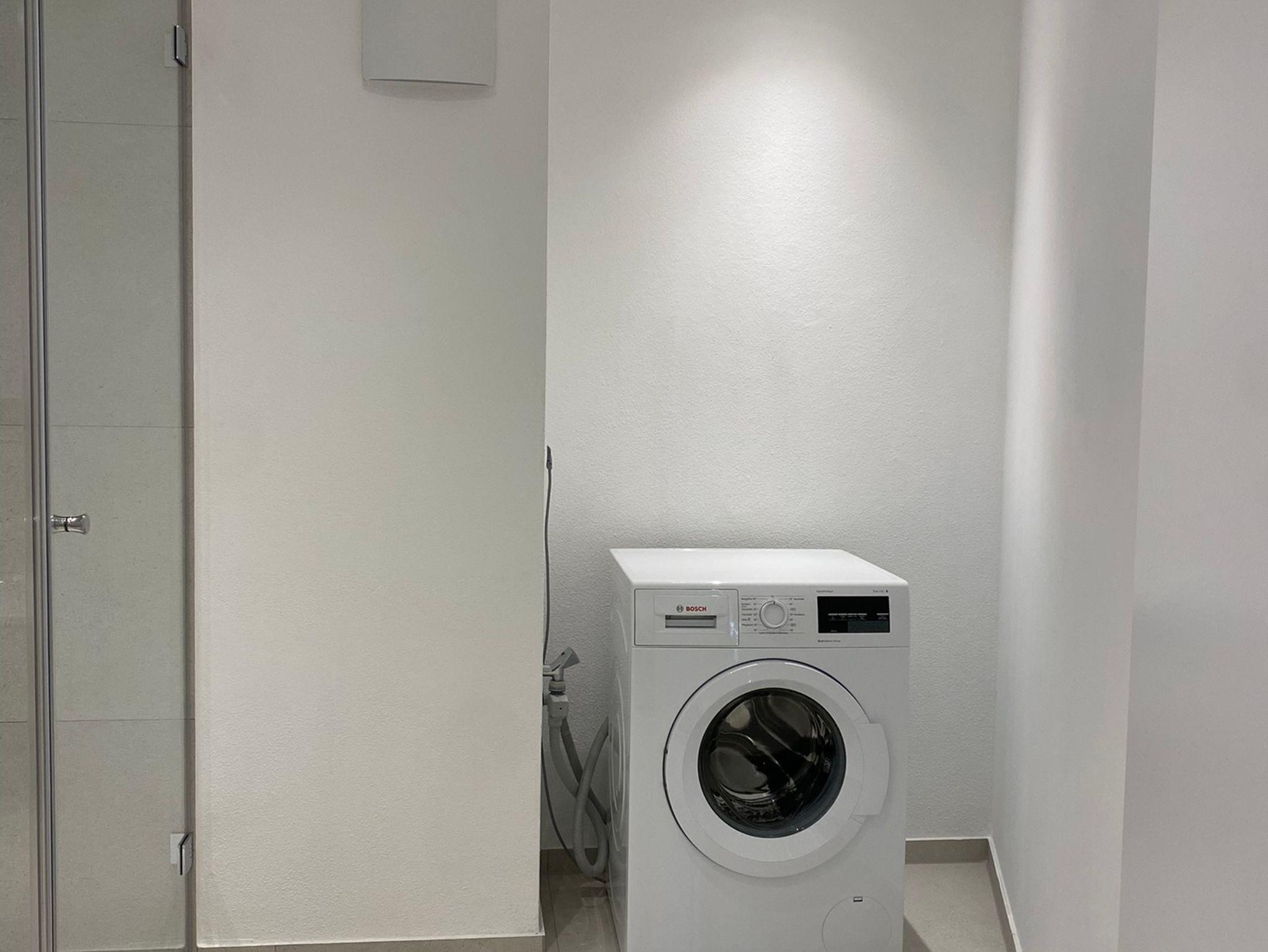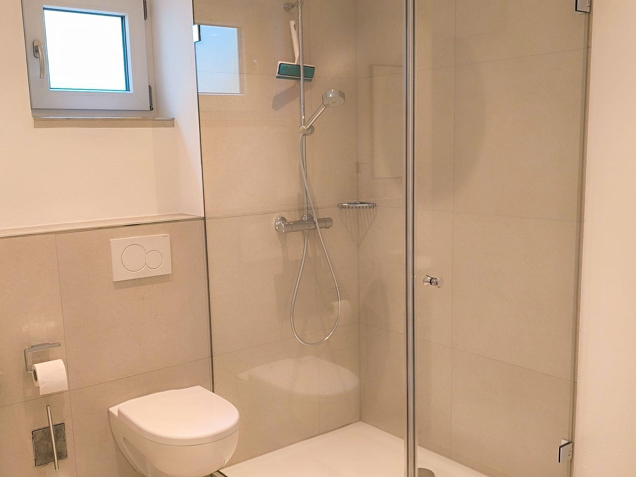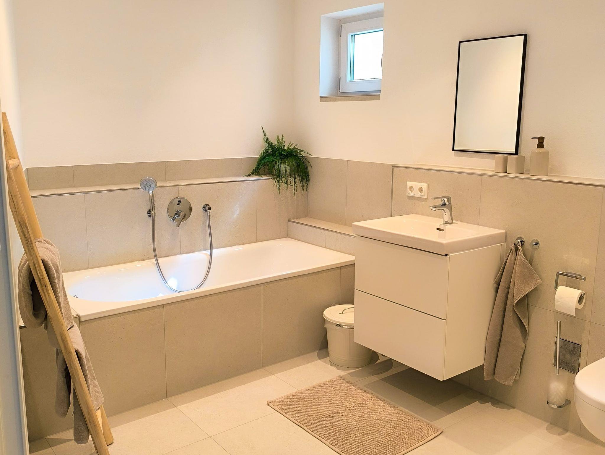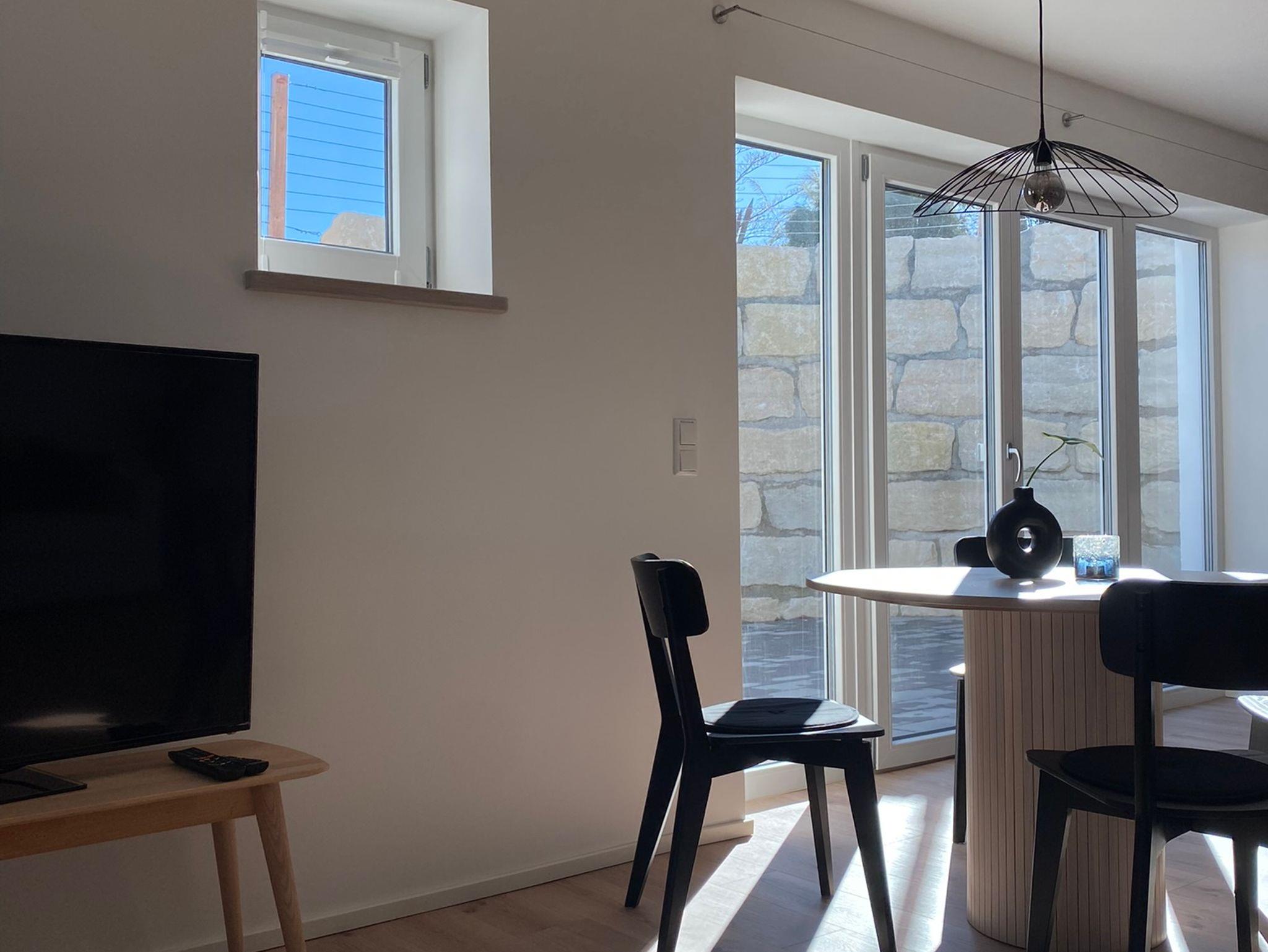 Die im Souterrain angelegte Ferienwohnung mit insgesamt 85 qm Wohnfläche und einer 20 qm großen Terasse verfügt über einen offenen Wohnbereich, einer großzügigen Küche, einem Schlafzimmer und einer Schlafcouch sowie einem Bad mit Dusche, Badewanne und WC.