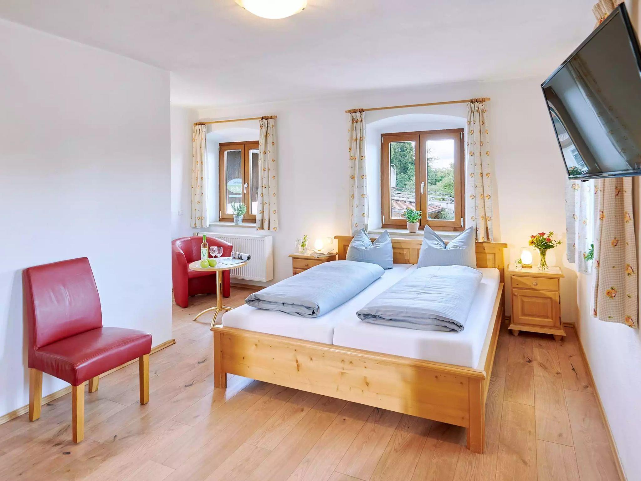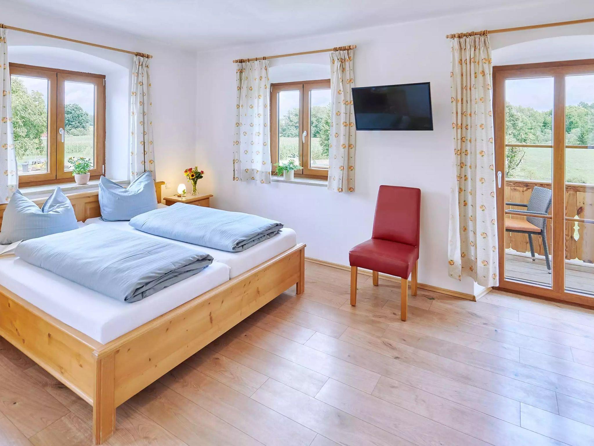 Im Doppelzimmer 5 auf dem Urlaubshof Kirchmaier am Chiemsee kommt Ferienlaune auf. Das freundlich eingerichtete Doppelzimmer bietet ausreichend Platz für 2 Personen und ist besonders für Paare, Kurzurlauber und Erholungssuchende geeignet. Die Übernachtung beinhaltet ein genussvolles Frühstück am Morgen. Die Besonderheit des Doppelzimmers ist der eigene, möbelierte Balkon. Und auch sonst bietet das Doppelzimmer alles, was es für eine entspannte Übernachtung braucht. Ein bequemes Doppelbett ist fertig für die Urlaubsgäste bezogen und nach dem Bad mit Dusche und WC kann es frisch auf in den neuen Urlaubstag gehen.