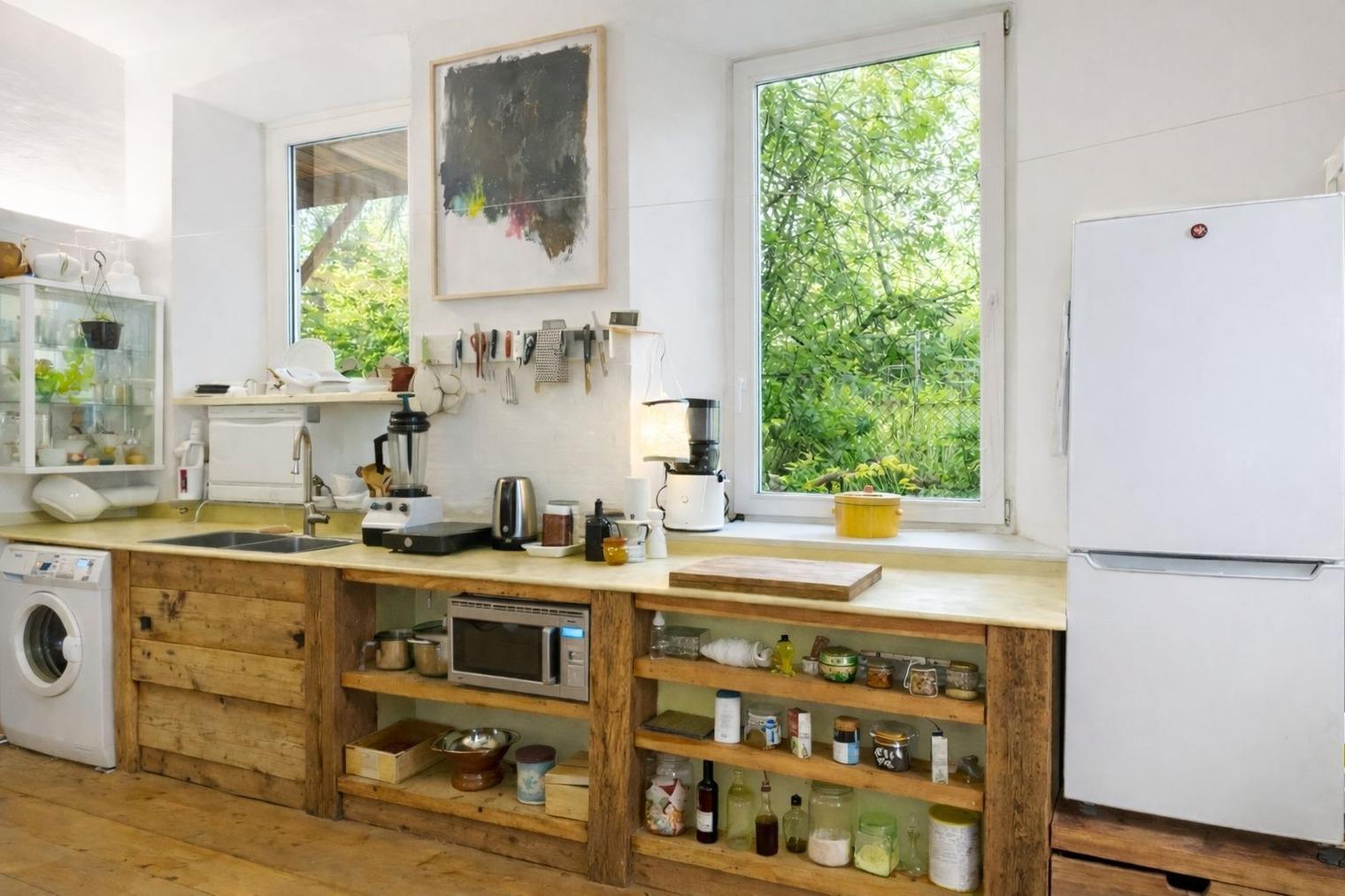 Die minimalistisch gestalteten Räume laden dazu ein, sich ganz auf das Wesentliche zu konzentrieren und gleichzeitig von der künstlerischen Umgebung berührt zu werden. Die voll ausgestattete Küche mit Induktionsherd (2 Platten), Ofen mit Dampffunktion, Geschirrspüler (klein), Waschmaschine sowie Kamin lädt zum Kochen und Verweilen ein. Der offene Wohn- und Schlafbereich mit alten Holzdielen, großformatigen zeitgenössischer abstrakter Kunst, die der Künstler in seinem Wohnatelier am Chiemsee geschaffen hat sowie handgefertigte Keramiken und einer kuratierten Bibliothek verleiht dem Appartement einen unverwechselbaren Charakter. Das großzügige Bett (160 x 200 cm) sorgt für erholsame Nächte.