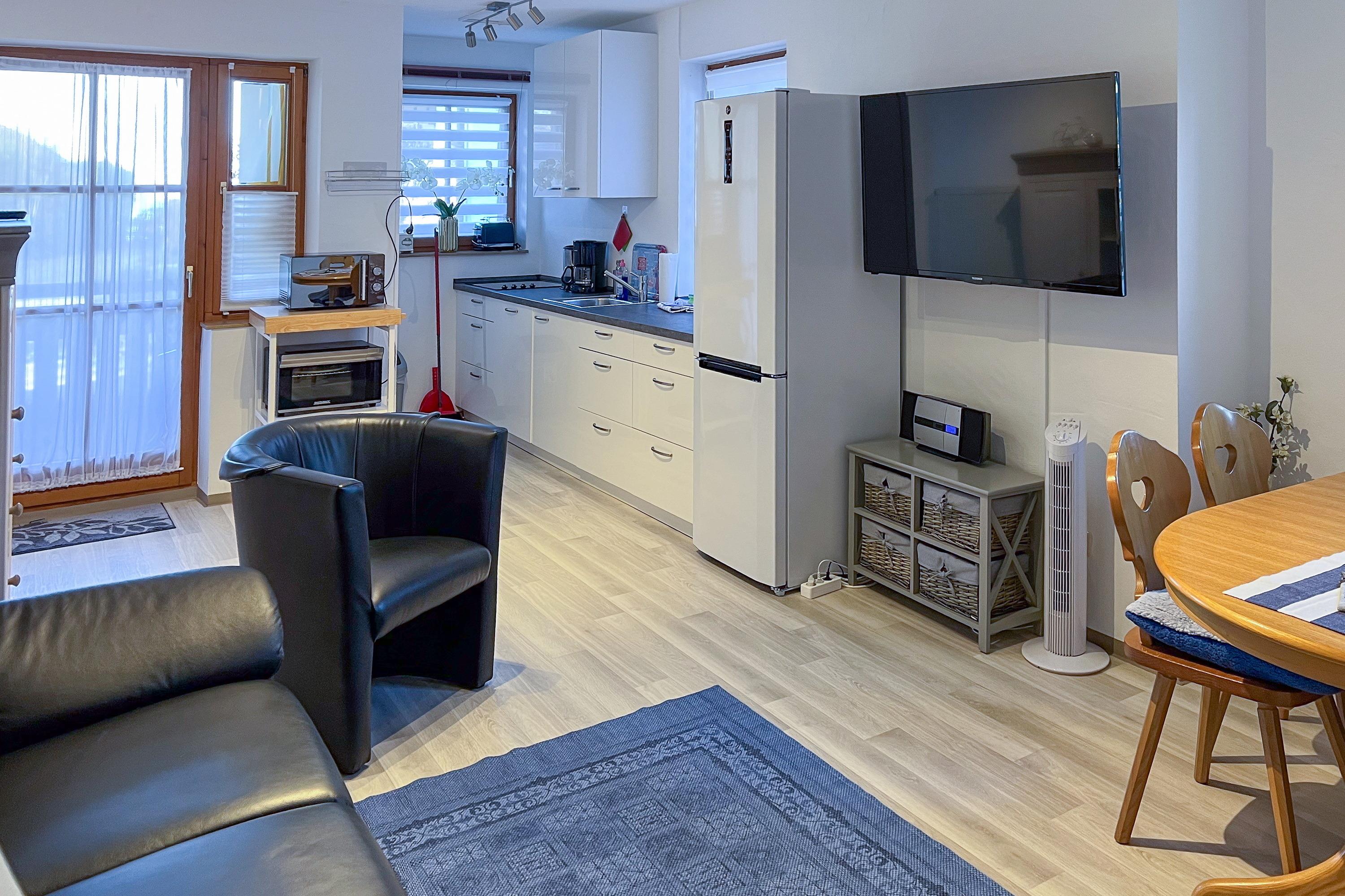 Der Balkon mit Blick ins Grüne lädt zum gemeinsamen Entspannen ein – sei es beim Frühstück oder in den ruhigen Abendstunden. Die moderne Ausstattung mit WLAN, Geschirrspüler und Flachbild-TV sorgt für einen angenehmen Familienurlaub. Hunde sind erlaubt, ein eigener Parkplatz steht ebenfalls zur Verfügung.