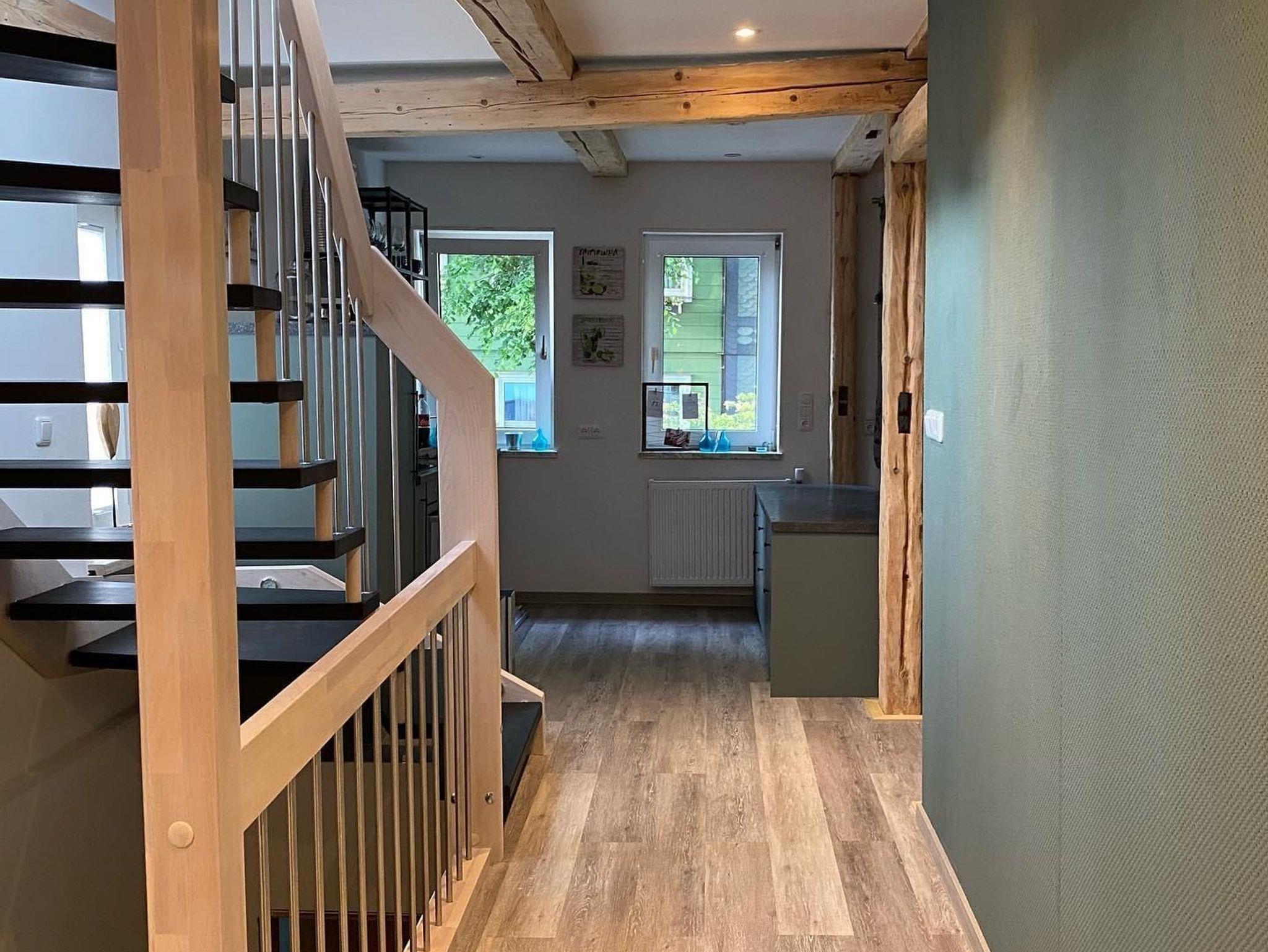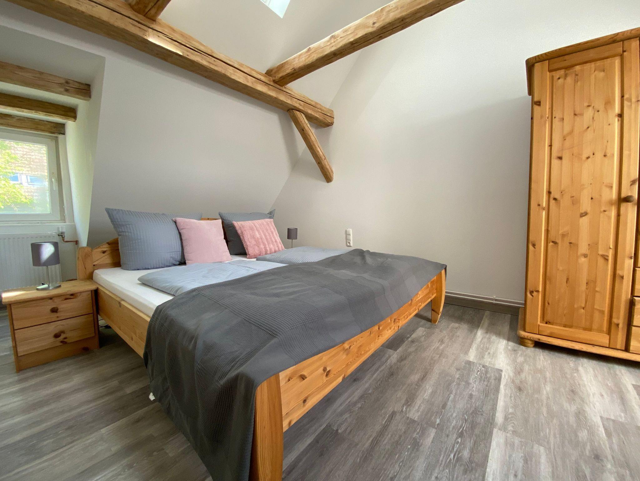 Die 110 qm Wohnung liegt im 1.OG und erstreckt sich über 3 Etagen. In 2 SZ und auf dem Schlafboden finden insgesamt 4 Erwachsene und 2 Kinder Platz. Die Küche ist mit Backofen, Kühlschrank und Geschirrspüler ausgestattet und der große Wohn-Essbereich lädt zum Verweilen ein. Bei schönem Wetter kann man die Abendsonne auf dem Balkon genießen.