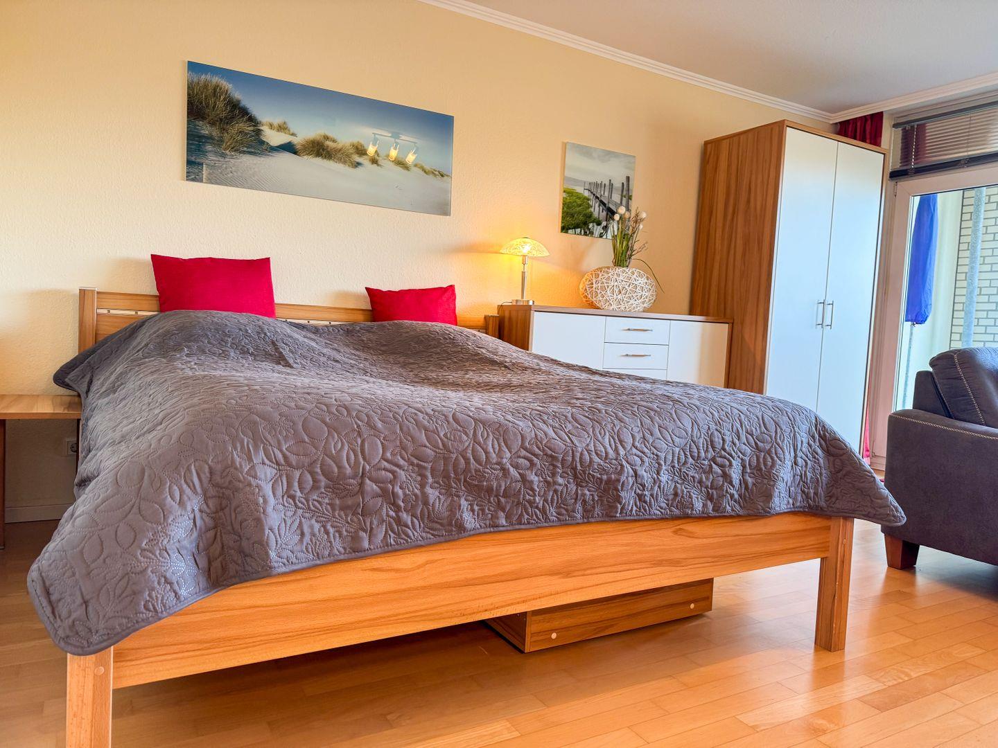 Strandhochhaus Döse, 3.te Etage, Whg. Nr. 20, bis 2 Pers., ca. 45 qm Größe, durch Baumkronen eingeschränkter Meerblick, ca. 100 m zum Sandstrand Döse, kombinierter Wohn-Schlafbereich mit Doppelbett, sep. Küche mit 4-Platten-Ceranfeld, Geschirrspüler und Backofen, Badewanne mit Duschabtrennung und WC, Balkon, WLAN, Aufzug im Haus, Haustiere nicht gestattet, Nichtraucherwohnung, Pkw-Stellplatz am Haus, Strandkorb im Sommer 2025