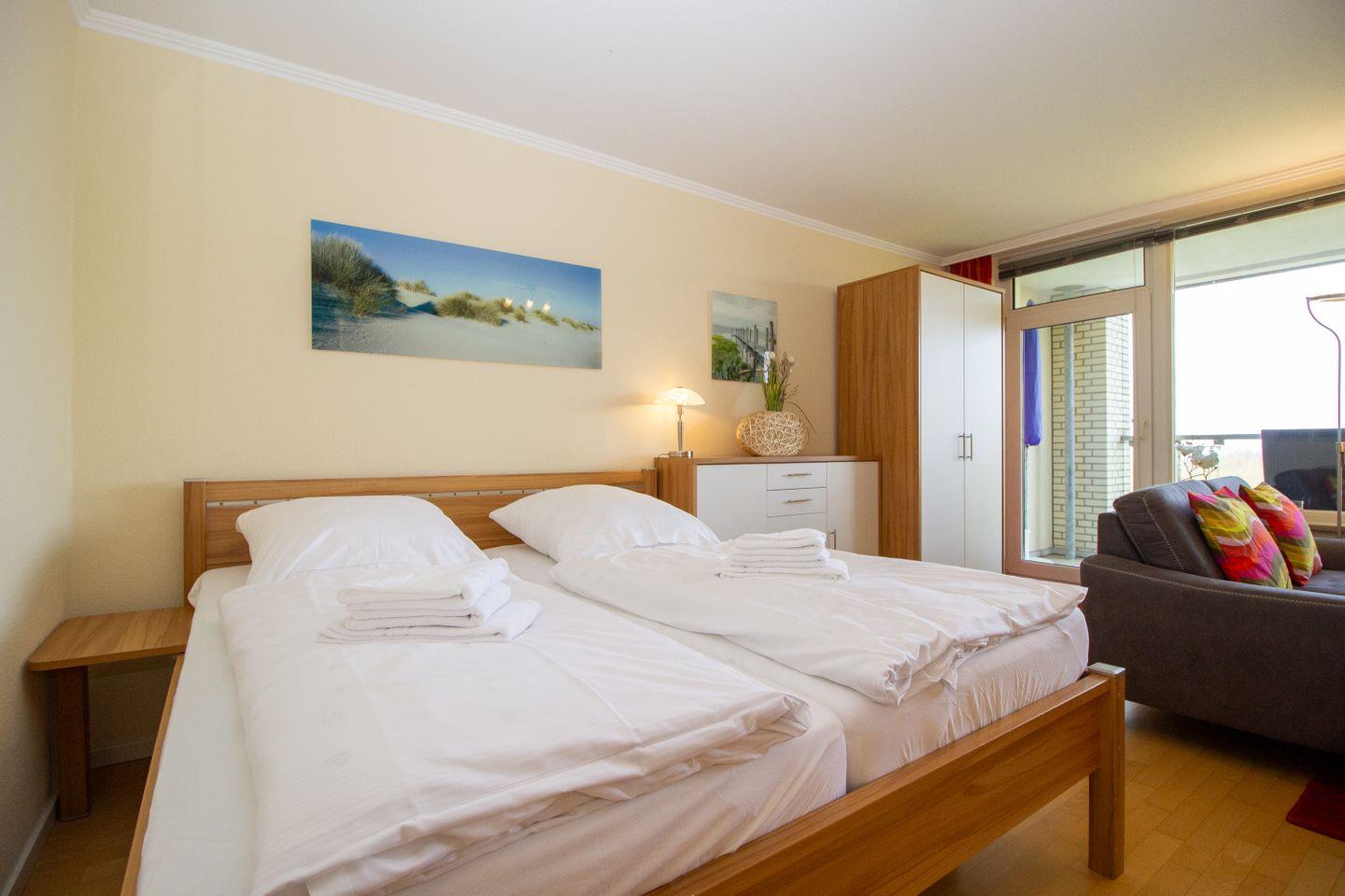 Moderne Ferienwohnung im Strandhochhaus Cuxhaven-Döse mit Balkon und Strandnähe für erholsame Tage am Meer.