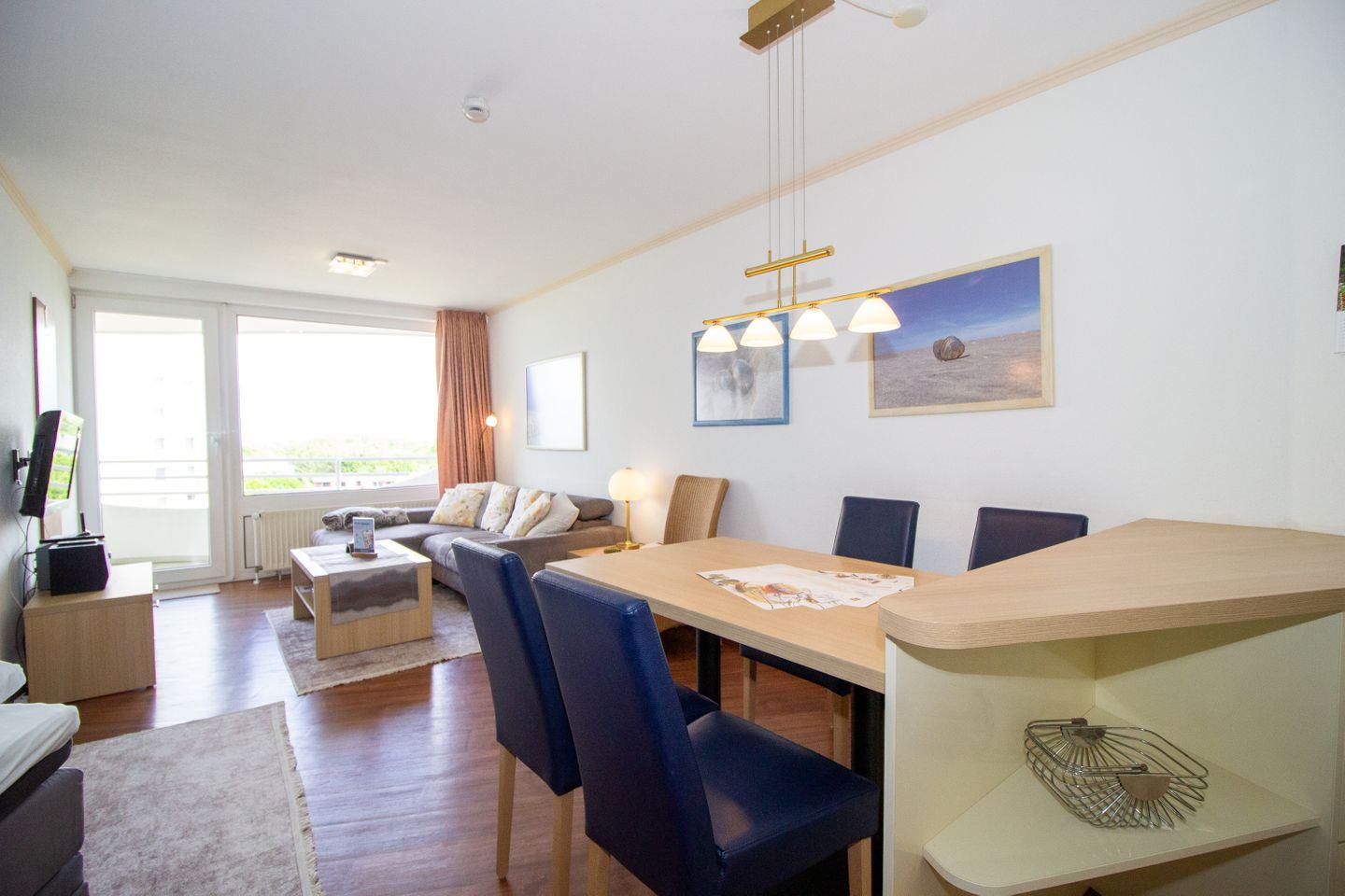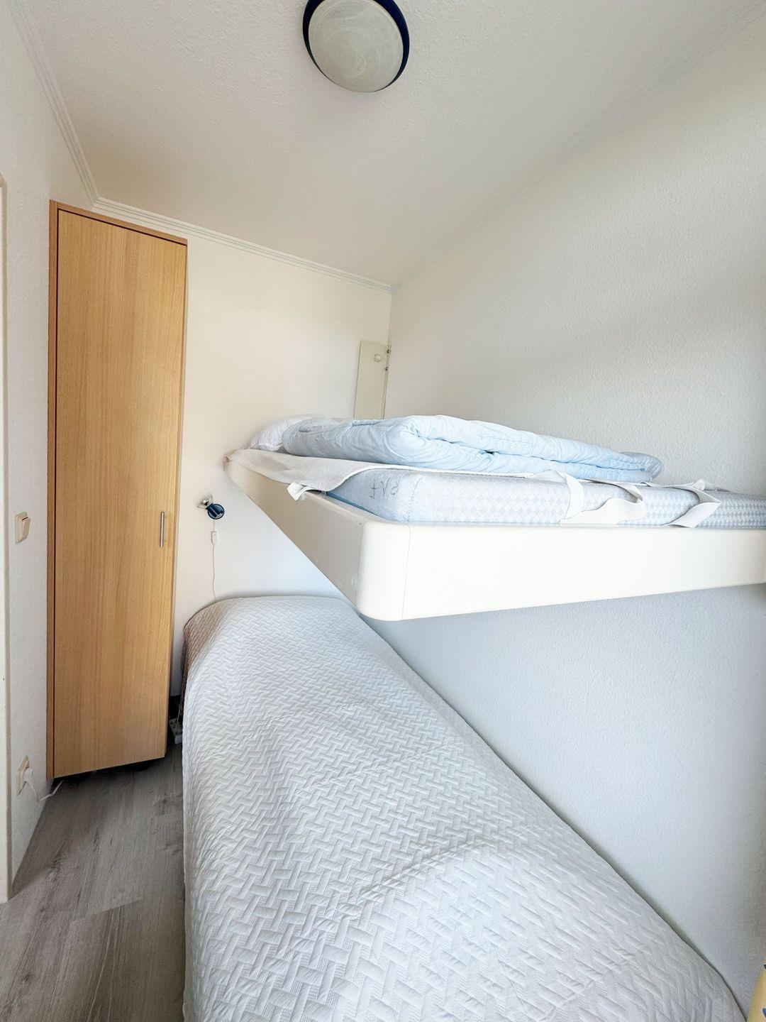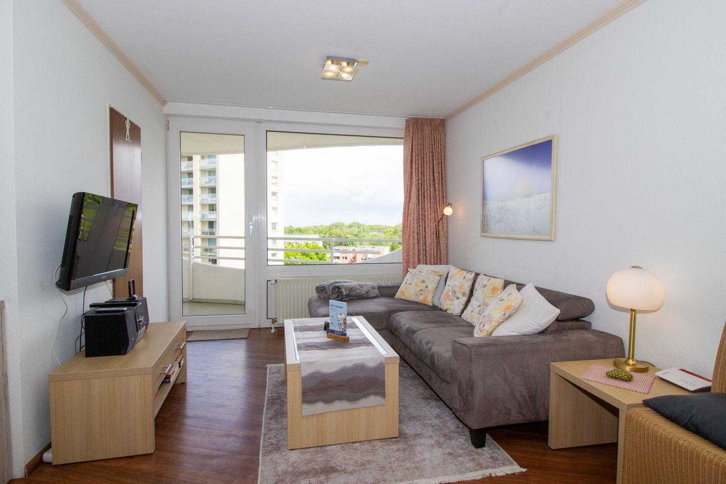 Haus "Lord Nelson", Typ 2, Appartement-Nr. "718", bis 4 Personen, 7.te Etage, ca. 40 qm Wohnungsgröße, Weltschifffahrtsweg (seitlicher Meerblick Richtung Elbe), Wohnbereich mit Doppelbett, separates kleines Schlafzimmer mit Schiffskojenbett, Dusche/WC, Küchenzeile mit Mikrowelle und Geschirrspüler, Kabel-TV, Flachbildschirm, Stereoanlage, Balkon, Haustiere sind erlaubt, Tiefgaragenstellplatz, Nichtraucherwohnung, Strandkorb im Sommer 2026.