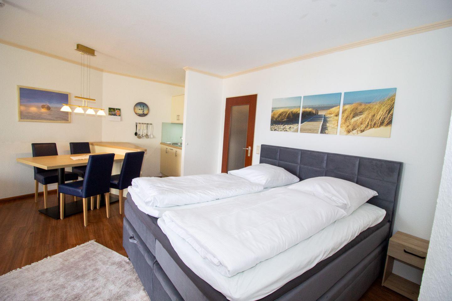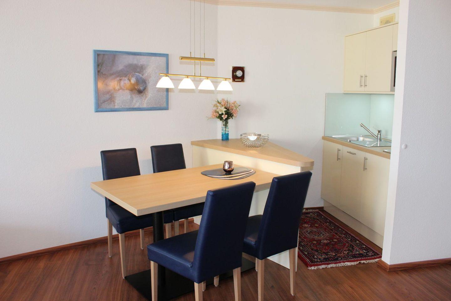 Auf 40 m² finden in der 2-Zimmer-Ferienwohnung (Hundefreundliche) bis zu vier Personen Platz. Die eher schlichte, edle Einrichtung sowie dezente Farbakzente in der Dekoration kreieren eine ruhige Atmosphäre, die zu Entspannung und Erholung einlädt. Zudem punktet die Ferienwohnung mit einem Balkon mit seitlichem Meerblick in Richtung Elbe.