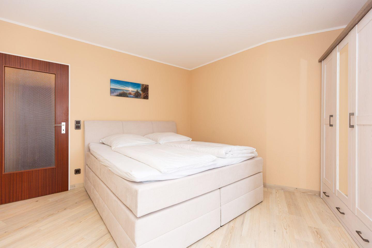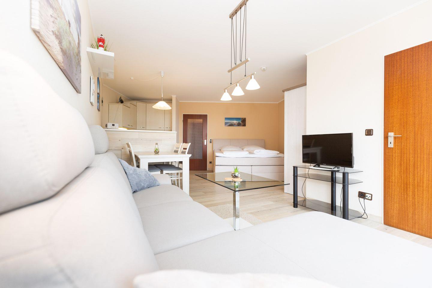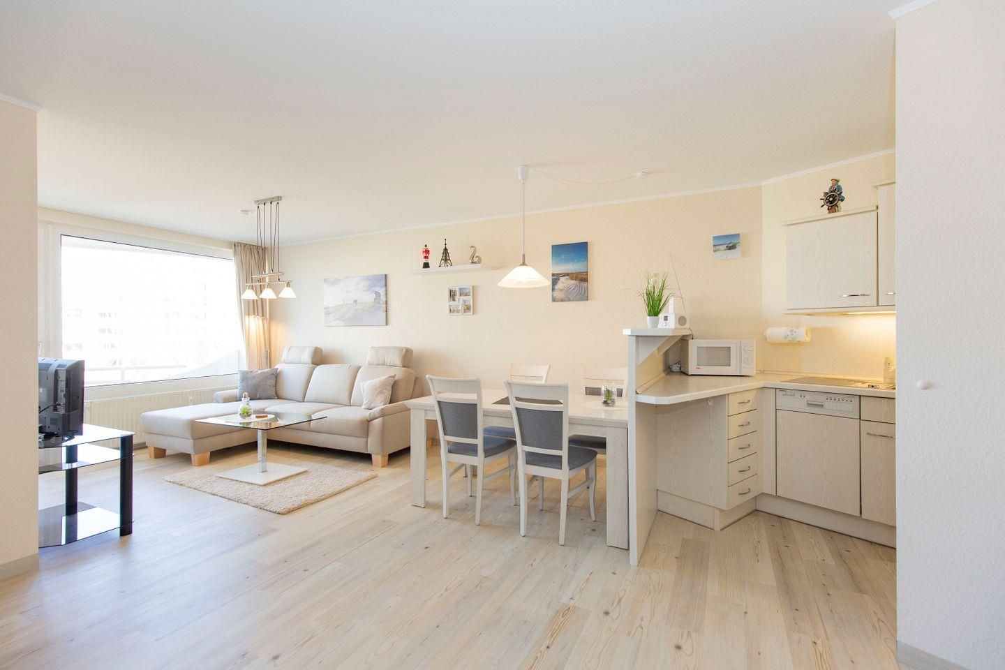 Haus "Lord Nelson", Typ 2, App.-Nr. "314", bis 4 Personen, ca. 40 m² Wohnungsgröße, 3. Etage, Ostseite (seitlicher Meerblick Richtung Weltschifffahrtsweg Elbe), Wohnbereich mit Boxspringbett (180x200, durchgehende Matratze), separates kleines Kinderzimmer mit Schlafcouch, Dusche/WC, Küchenzeile mit Geschirrspüler und 4-Platten-Ceranfeld, Balkon, Kabel-TV, WLAN, Haustiere sind nicht gestattet, Nichtraucherwohnung, Tiefgaragenstellplatz, Strandkorb im Sommer 2026