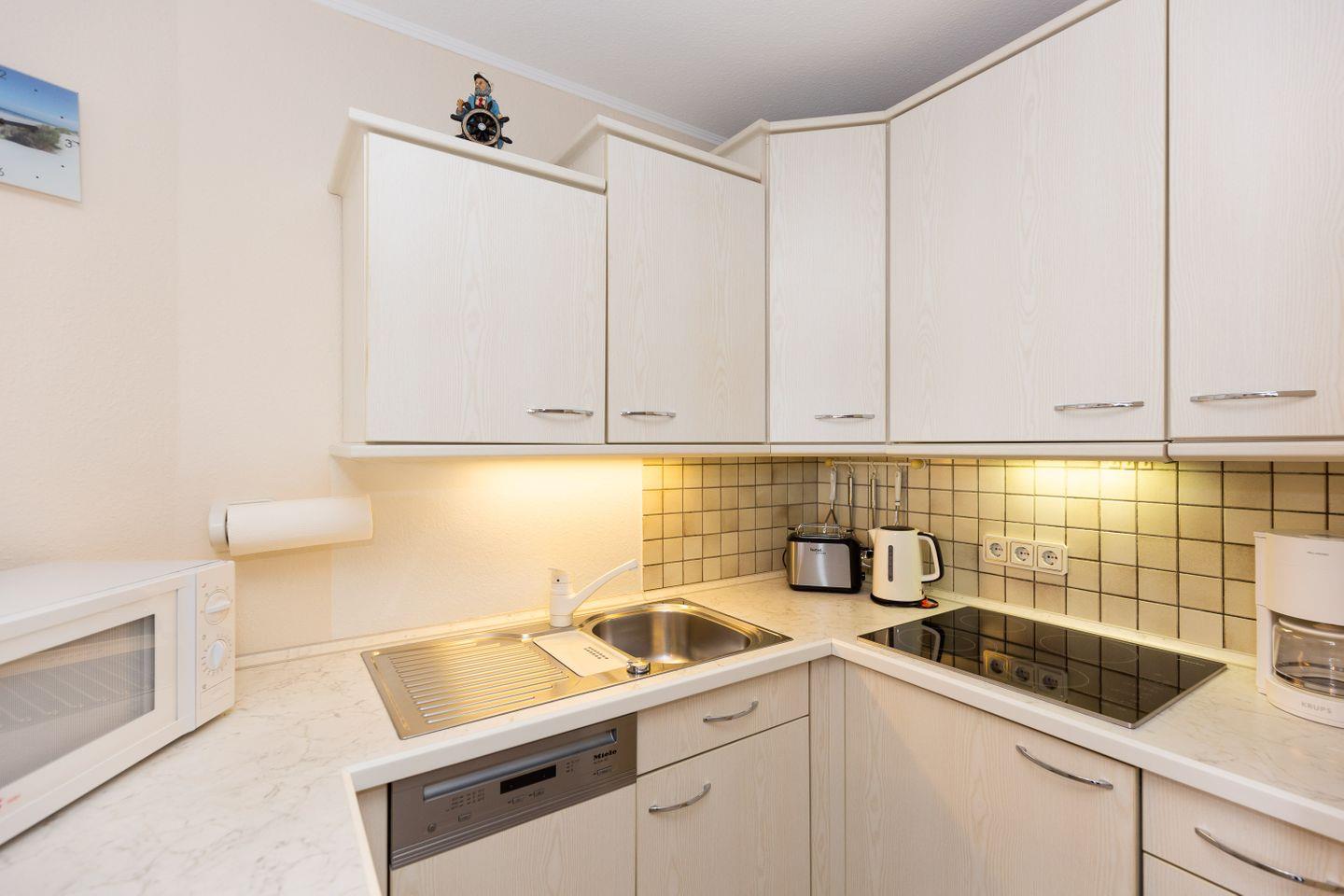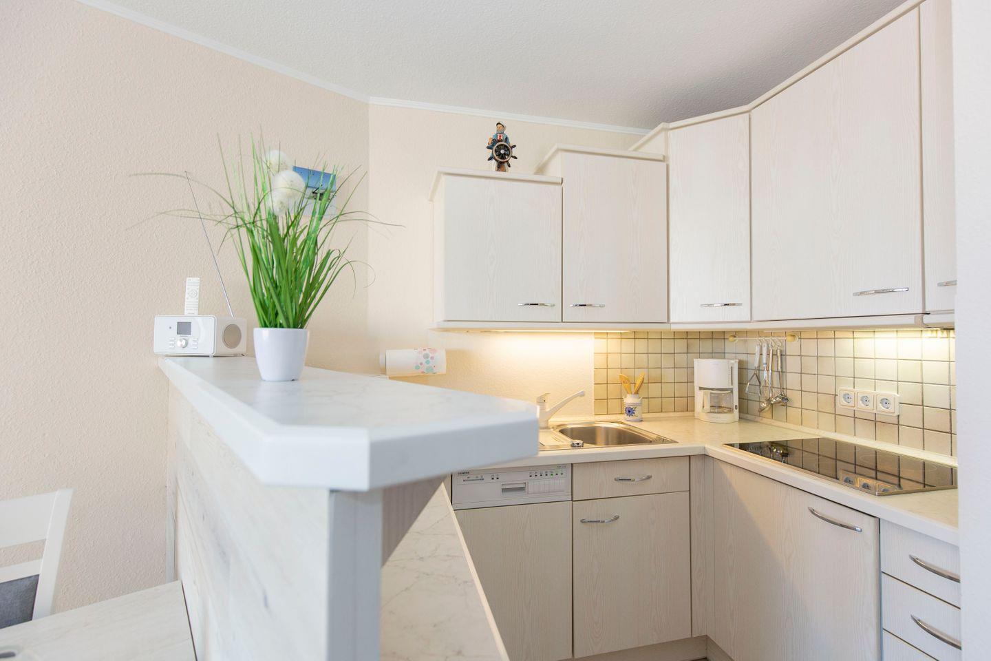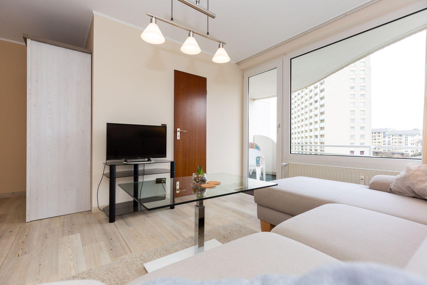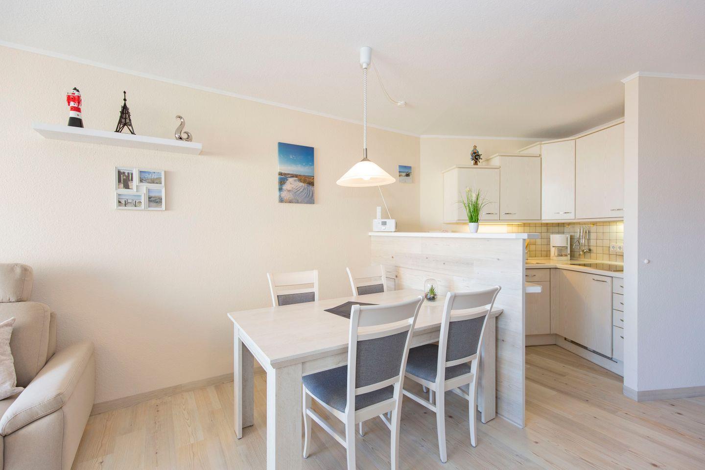 Haus "Lord Nelson", Typ 2, App.-Nr. "314", bis 4 Personen, ca. 40 m² Wohnungsgröße, 3. Etage, Ostseite (seitlicher Meerblick Richtung Weltschifffahrtsweg Elbe), Wohnbereich mit Boxspringbett (180x200, durchgehende Matratze), separates kleines Kinderzimmer mit Schlafcouch, Dusche/WC, Küchenzeile mit Geschirrspüler und 4-Platten-Ceranfeld, Balkon, Kabel-TV, WLAN, Haustiere sind nicht gestattet, Nichtraucherwohnung, Tiefgaragenstellplatz, Strandkorb im Sommer 2026
